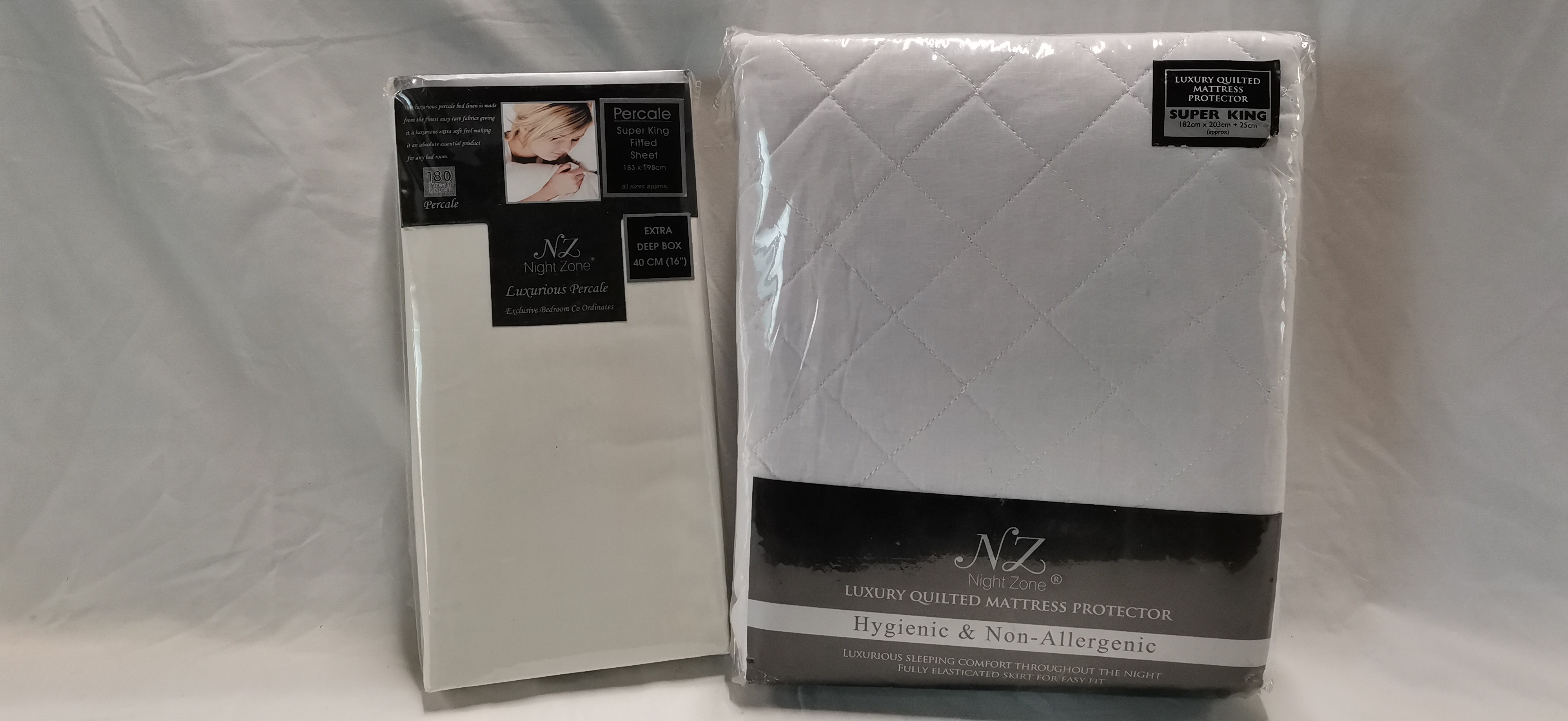 A pair of Super King size bedding items manufactured by Night Zone. The lot includes one cream-coloured Luxurious Percale fitted sheet featuring a 180 thread count and an extra-deep 40cm (16 inch) box construction. The second item is a white Luxury Quilted Mattress Protector, described on the packaging as hygienic and non-allergenic with a fully elasticated skirt. Both items are contained within their original, sealed clear plastic retail packaging with printed card inserts.