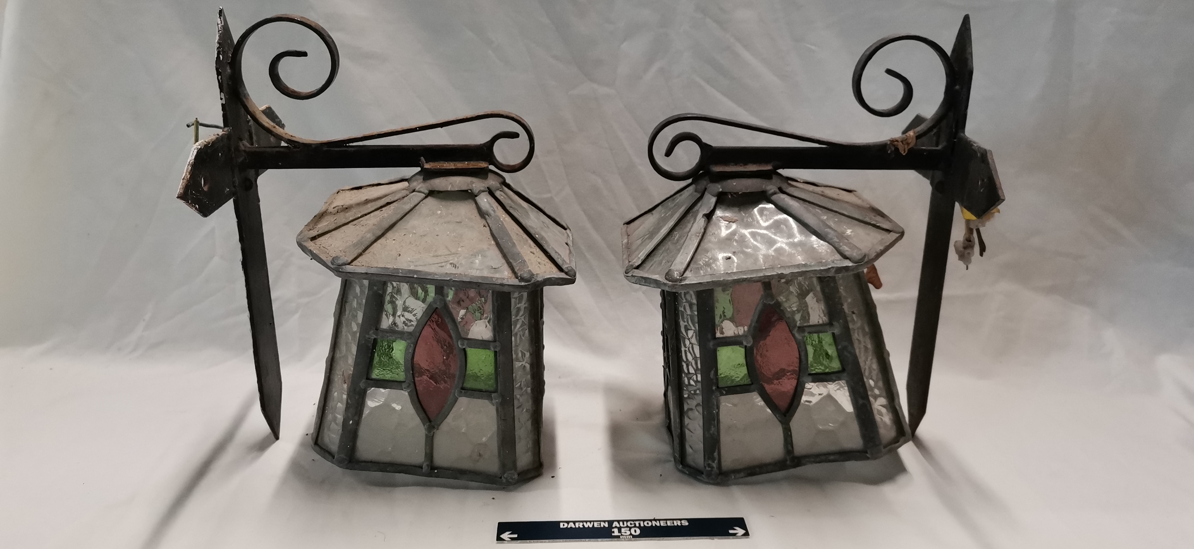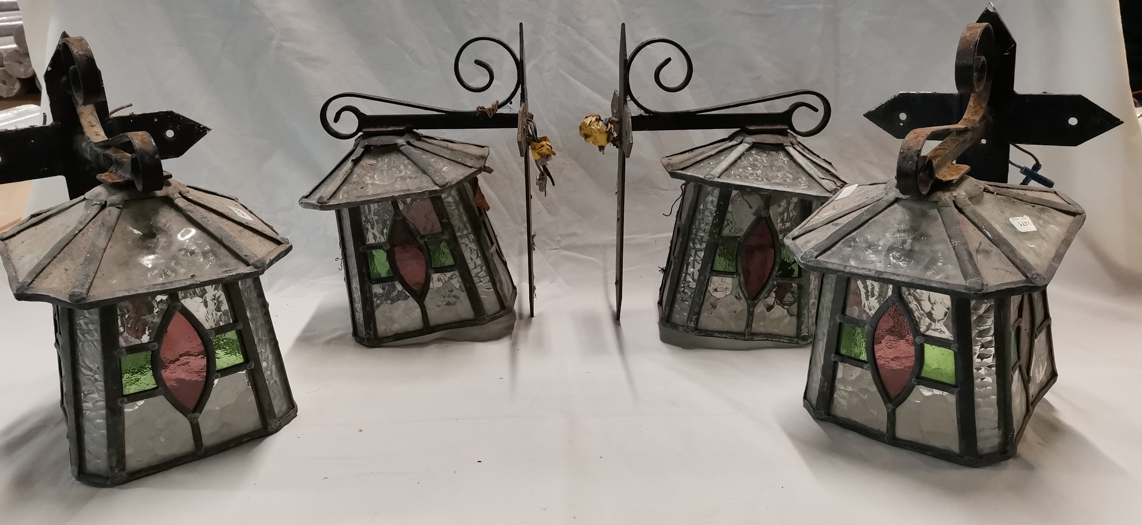 A Set of Four Arts and Crafts Style Leaded Glass and Wrought Iron Wall Lanterns