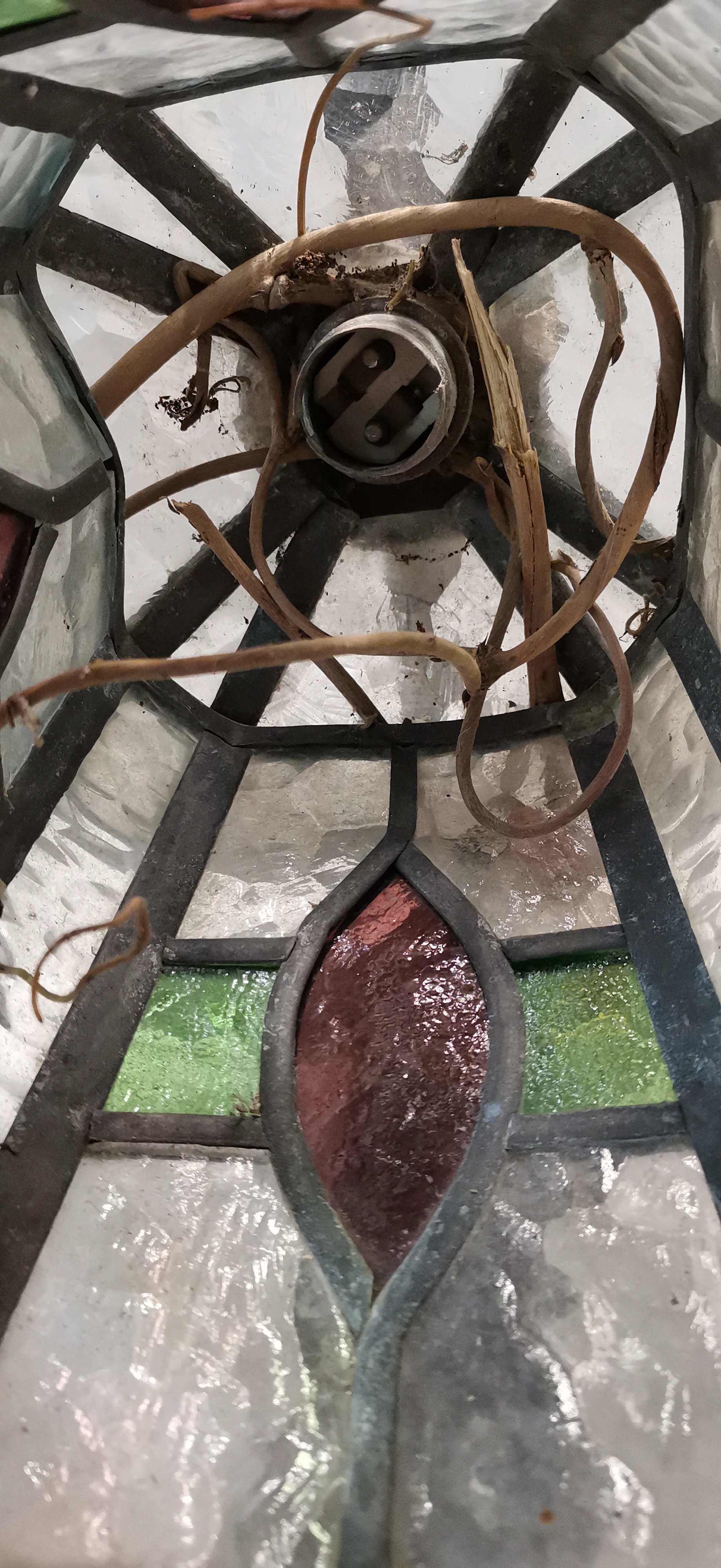 A set of four exterior wall lanterns in the Arts and Crafts style. Each lantern features a hexagonal leaded glass shade with a pitched roof, suspended from a decorative scrolled wrought iron wall bracket. The panels are constructed with textured clear cathedral glass, accented by a central red-purple mandorla-shaped pane flanked by two green rectangular panes. The lead cames have a dark, weathered patina. The internal wiring is original and includes bayonet bulb holders.