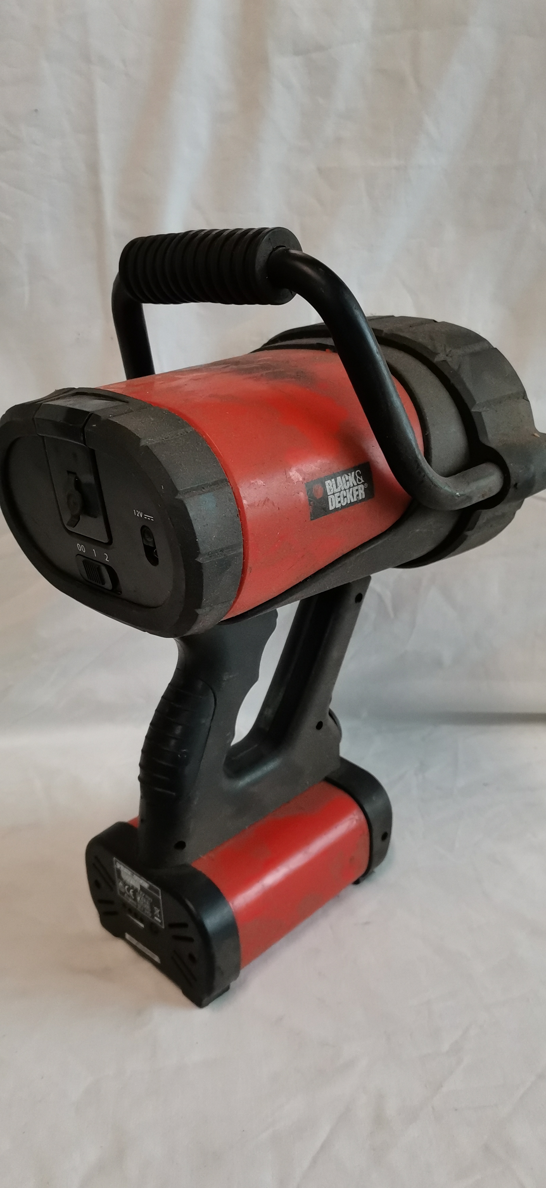 A Black & Decker BDV158 Type 1 rechargeable portable spotlight designed for work or emergency use. The unit features a dual-bulb configuration housed behind a single clear lens. The body is constructed from red and black moulded plastic with a pistol-grip handle and a secondary overhead metal carry handle fitted with a ribbed rubber grip. The rear interface includes a three-position sliding power switch marked 00, 1, and 2, and a 12V DC input socket. The base of the unit features a battery charge level indicator and a manufacturer specification label. Printed markings on the sides include the Black & Decker brand name. The base label provides the model number BDV158, Type 1 12V, and includes the CE mark, KEMA EUR certification, and a Slough, England postcode (SL1 3YD). A serial number sticker is present reading OF121E204386. A/F