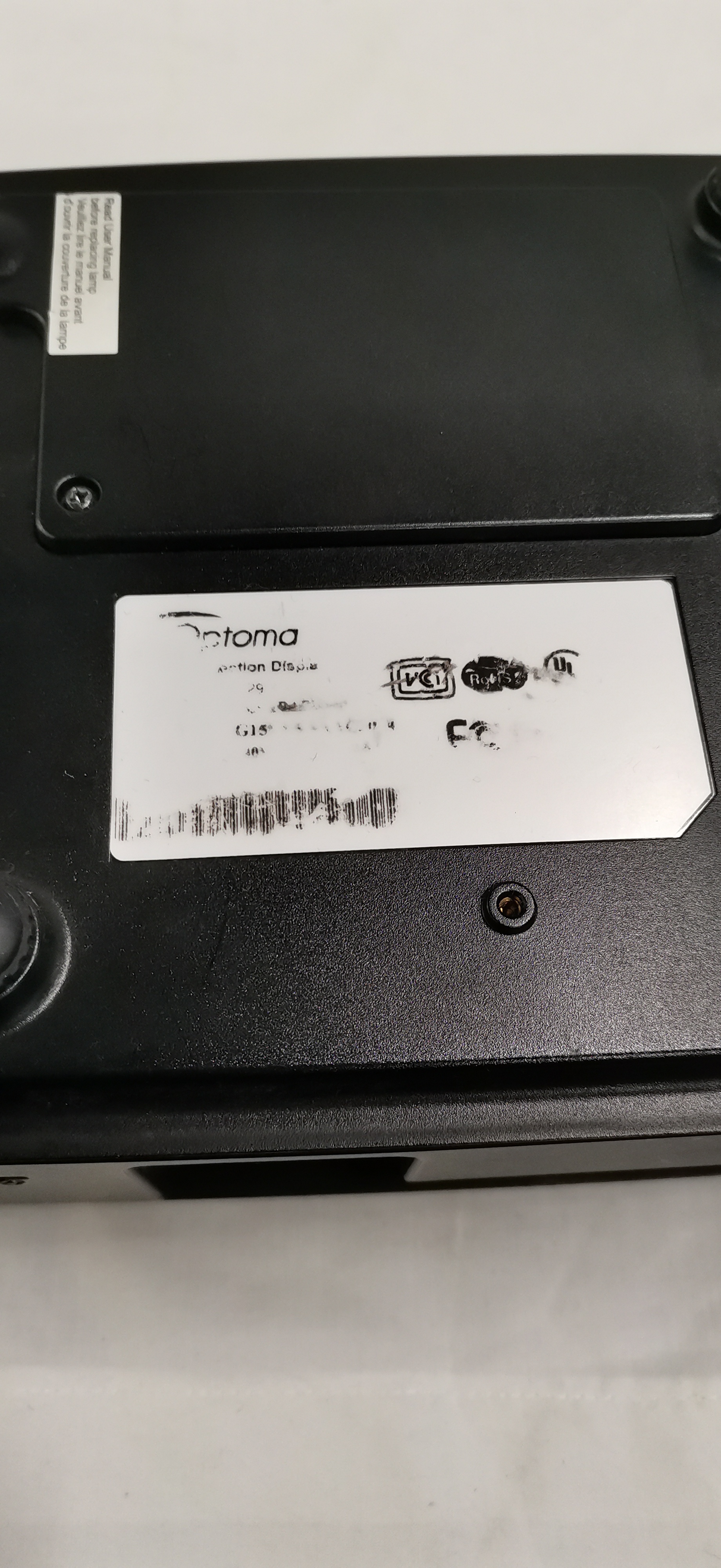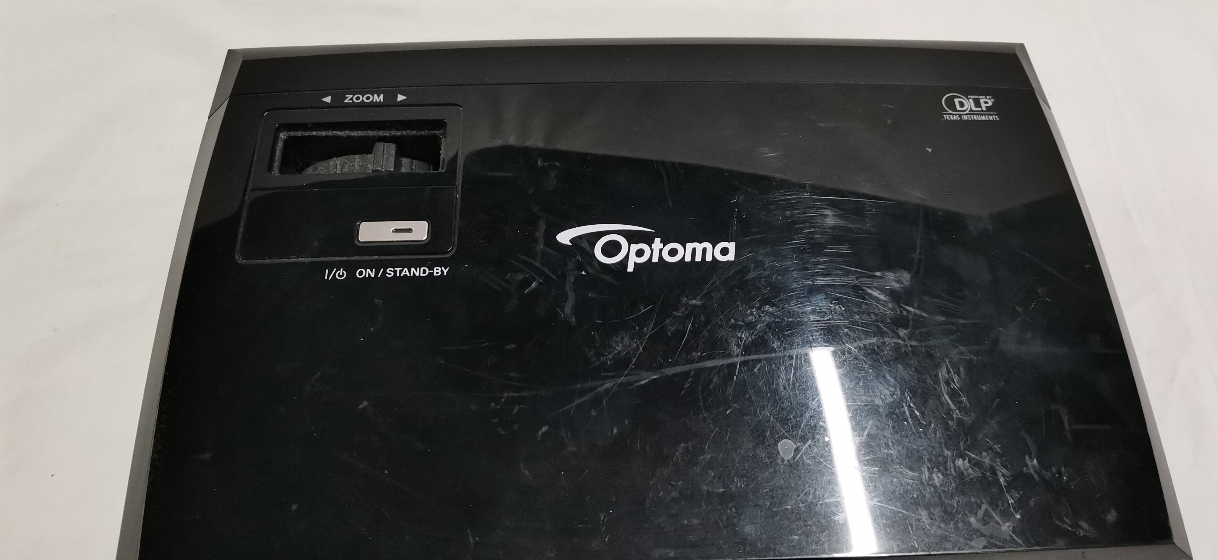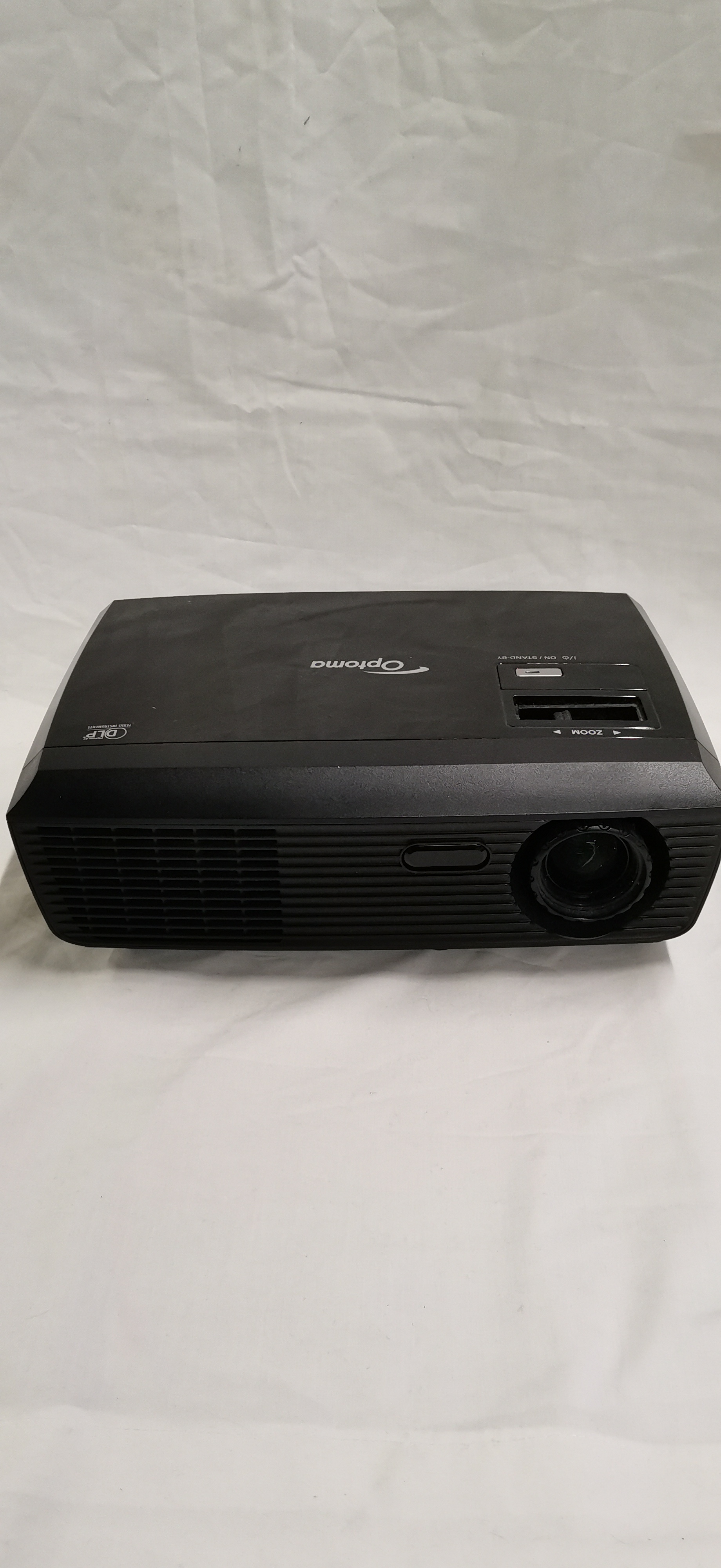 An Optoma brand DLP digital projector finished in black. The unit is equipped with a manual zoom slider and a power and stand-by button located on the top panel. It features Digital Light Processing technology by Texas Instruments. The rear connectivity panel includes ports for RS232, VGA-IN/SCART, S-video, and composite video, alongside a standard IEC power inlet. The base features an identification label with the Optoma brand and a partial model number of G15 visible. A/F