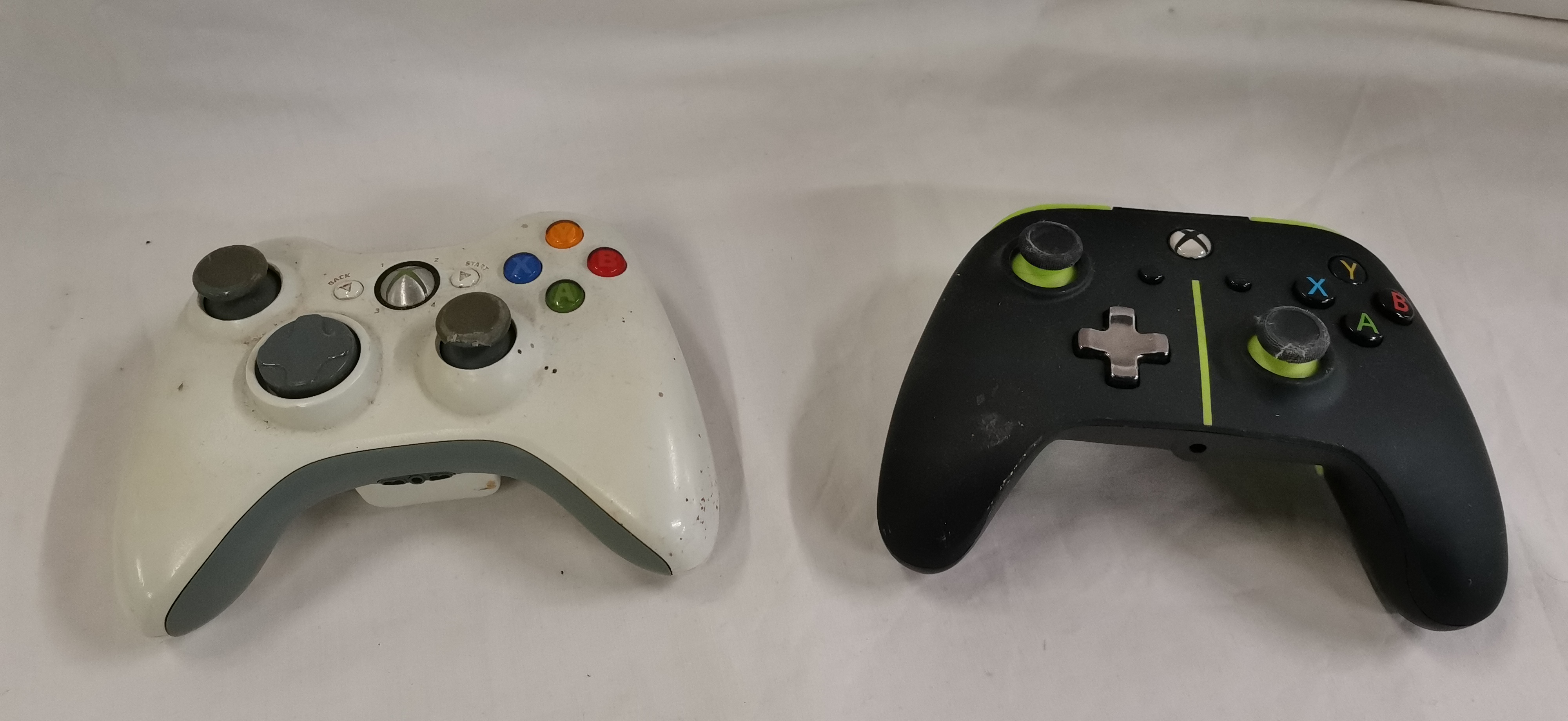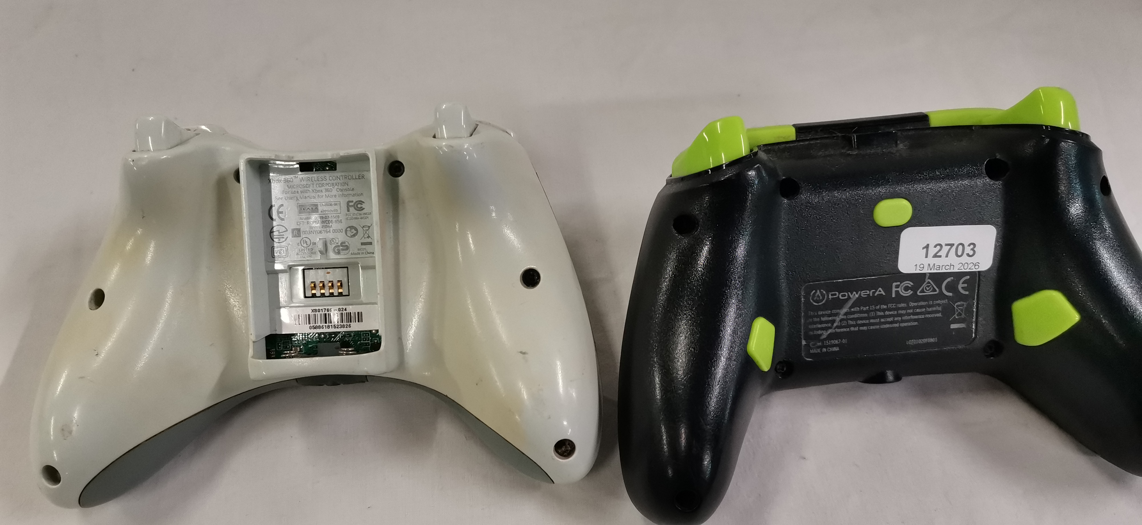 A lot consisting of two video game controllers designed for use with Xbox consoles. The first is an official Microsoft Xbox 360 Wireless Controller in a white finish. The internal battery compartment contains a label identifying the manufacturer as Microsoft Corporation and the model as an Xbox 360 Wireless Controller. The second unit is a black and fluorescent green wired-style controller manufactured by PowerA. The reverse of this controller features additional buttons and a back plate marked with the PowerA logo, model number 1519067-01, and lot number LOT0102DF0801. No cables, battery packs, or external accessories are included with either unit.