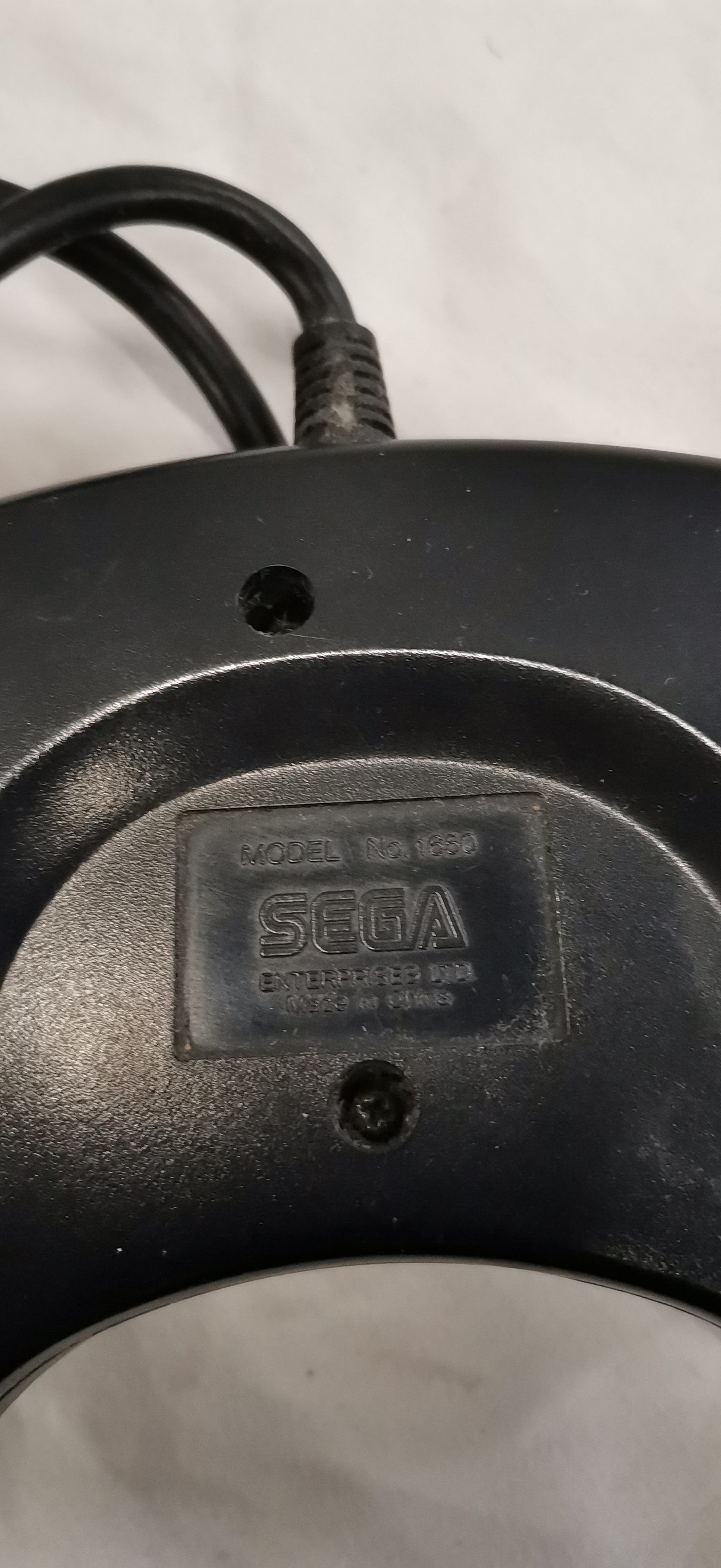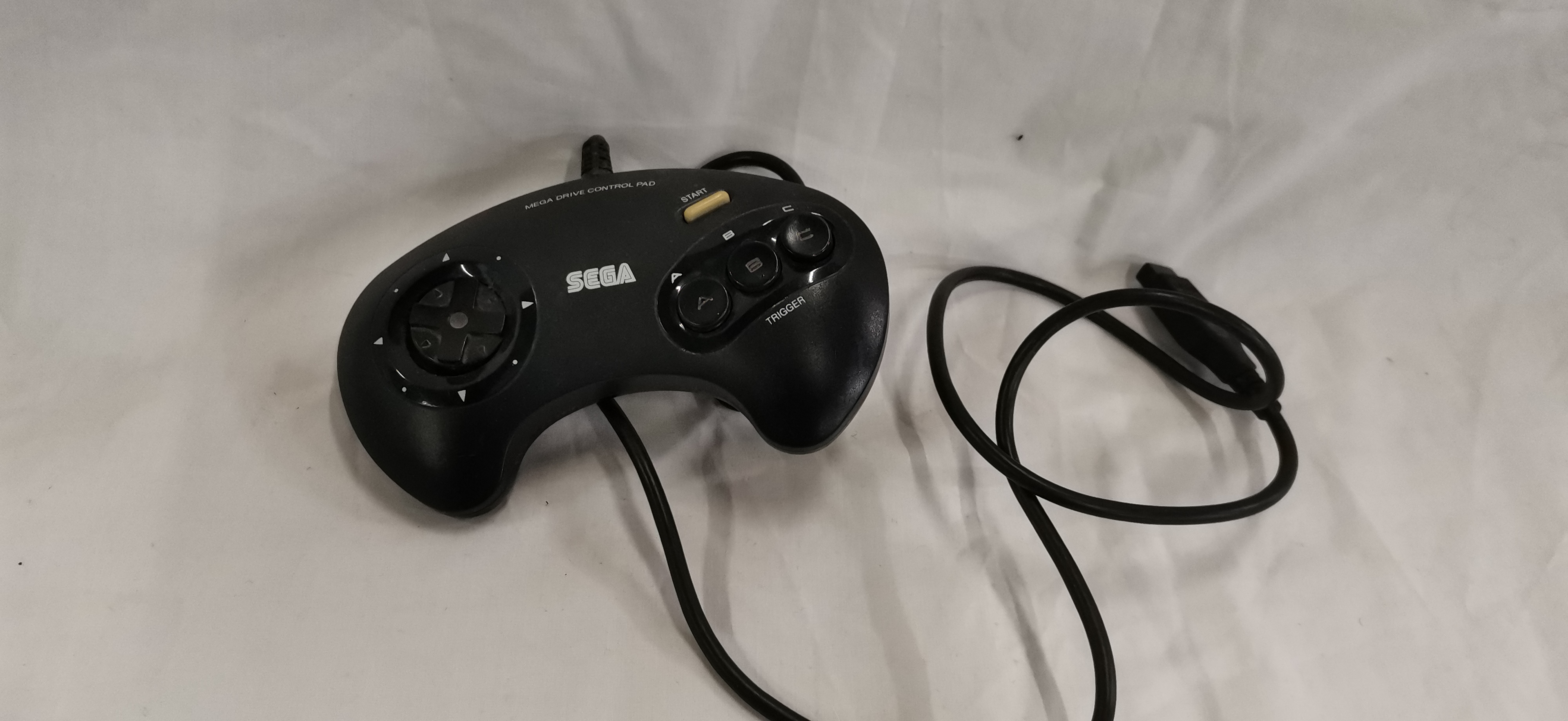 An official Sega Mega Drive control pad, model number 1650, manufactured by Sega Enterprises Ltd. The unit is constructed from moulded black plastic and features a three-button layout. The face of the controller includes a circular directional pad on the left, a yellow Start button in the upper centre, and three primary action buttons labelled A, B, and C on the right. The text Mega Drive Control Pad and Trigger are printed on the casing. The reverse features an embossed panel with the manufacturer details and model number. It is equipped with an integrated black cable terminating in a standard 9-pin D-sub connector.