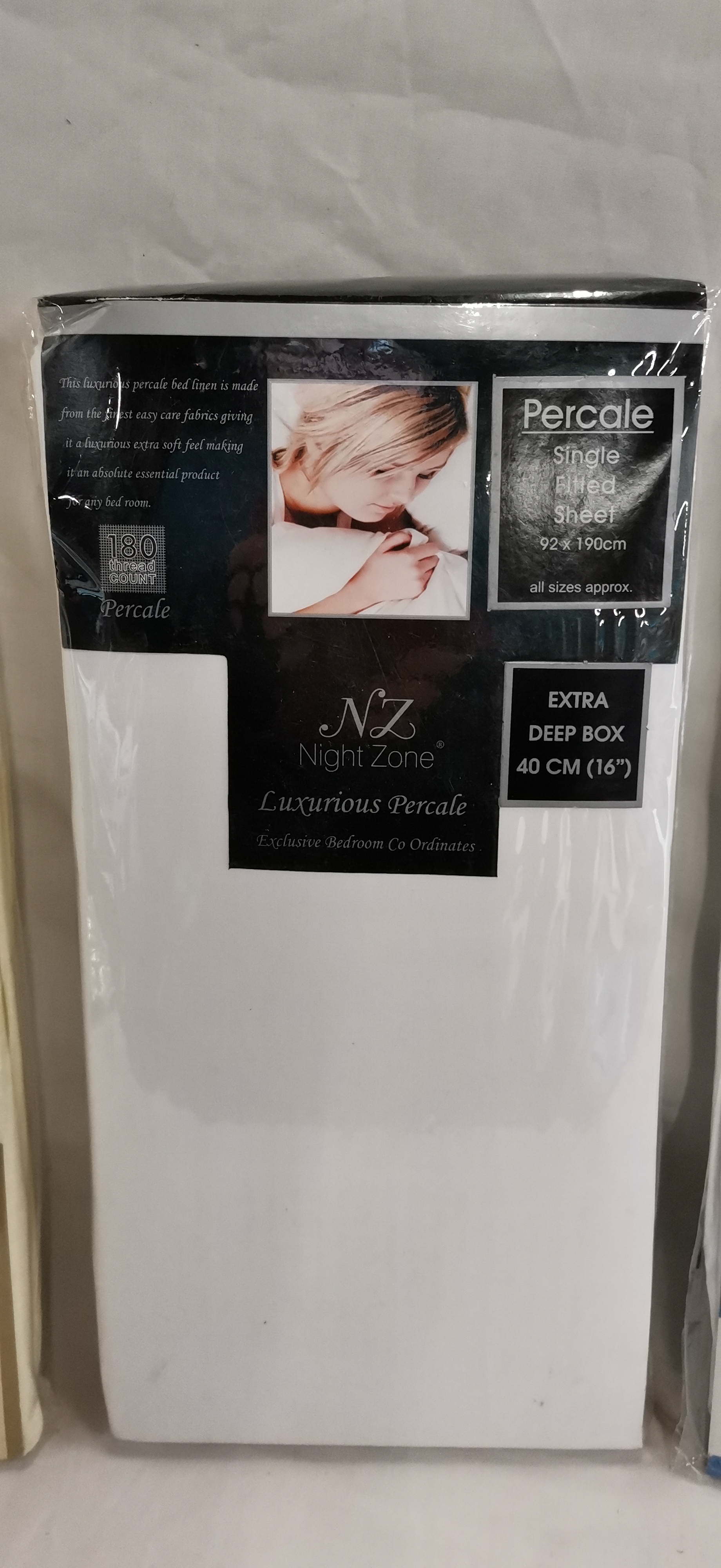 A collection of three individually packaged bedding items for a single bed, appearing as retail overstock. The lot includes one NZ Night Zone 68 PICK soft quality blended cotton single fitted sheet in a cream colour. The second item is an NZ Night Zone Luxurious Percale white single fitted sheet featuring a 180 thread count and an extra-deep 40cm (16 inch) box. The third item is a Sleep safe vinyl waterproof mattress cover, described as anti-allergenic, durable, and machine washable. All items are held within their original clear plastic retail packaging with printed brand inserts.