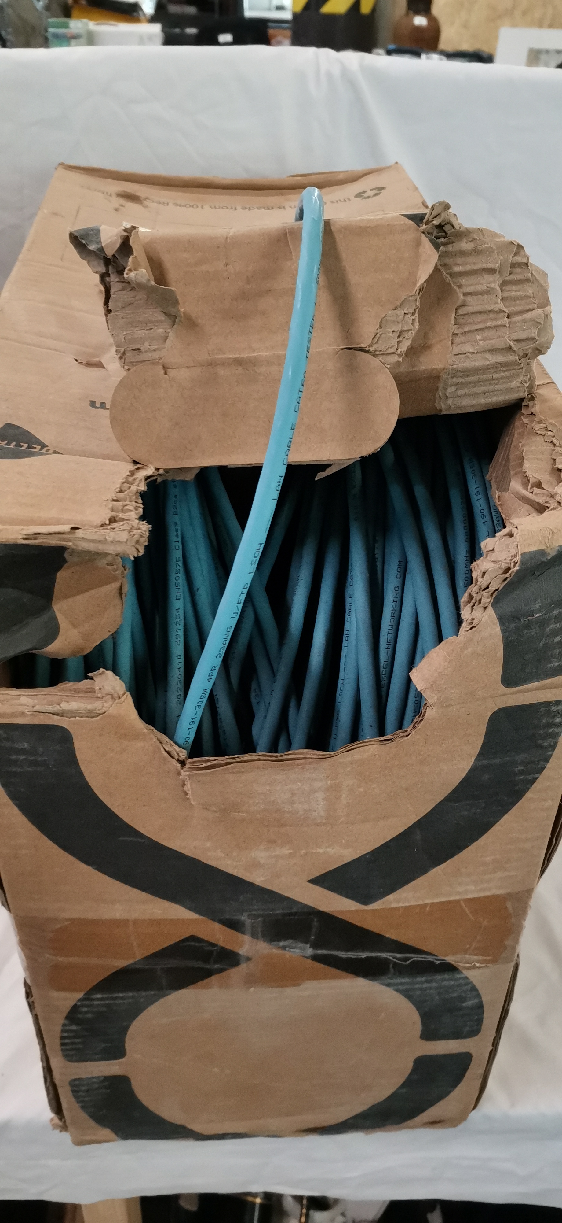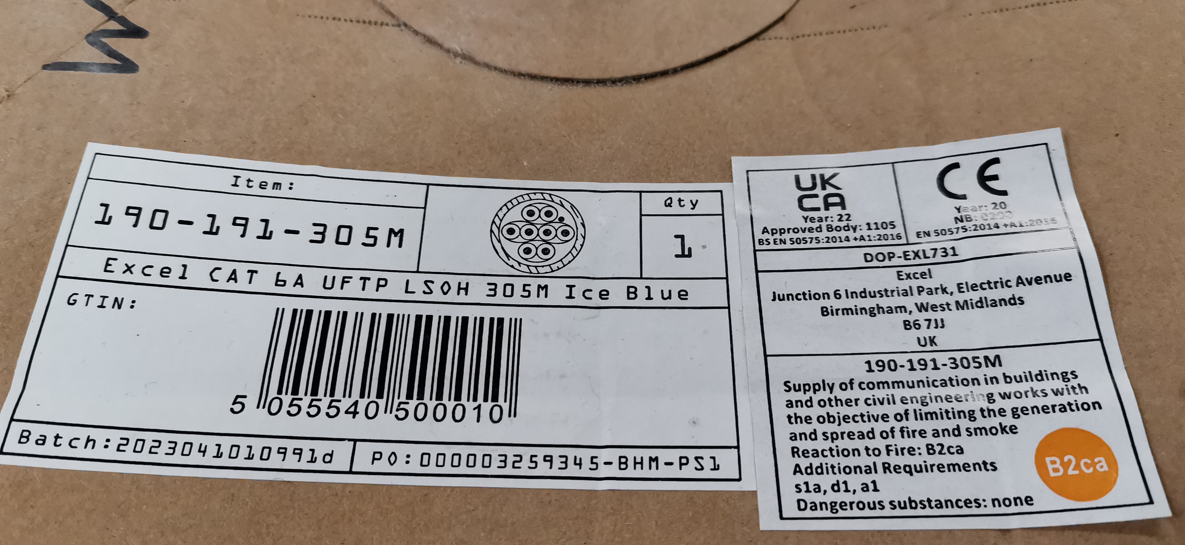 A box of Excel Networking Category 6A LAN cable, part number 190-191-305M. The cable is a 4-pair U/FTP (Unshielded/Foiled Twisted Pair) construction with 23AWG conductors. It features a Low Smoke Zero Halogen (LSOH) outer jacket in Ice Blue. The cable is designed for 500MHz operation. Labels indicate compliance with BS EN 50575:2014 +A1:2016. Fire safety specifications include Reaction to Fire Class B2ca-s1a, d1, a1. The item carries UKCA (Year 22, Approved Body 1105) and CE (Year 20, NB 0200) markings. Declaration of Performance (DOP) is listed as EXL731. The original capacity of the box is 305 metres.