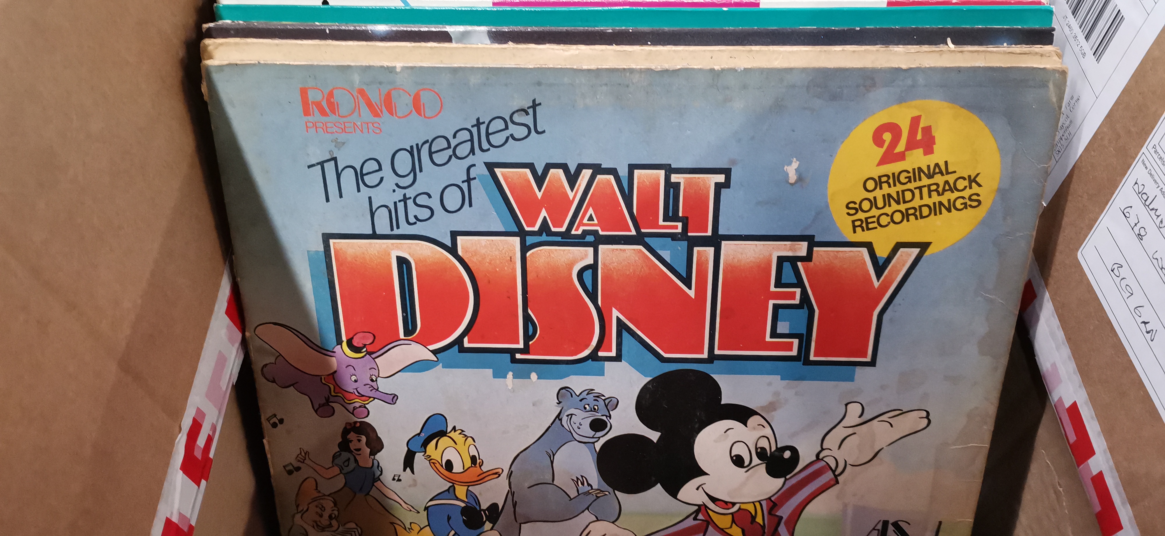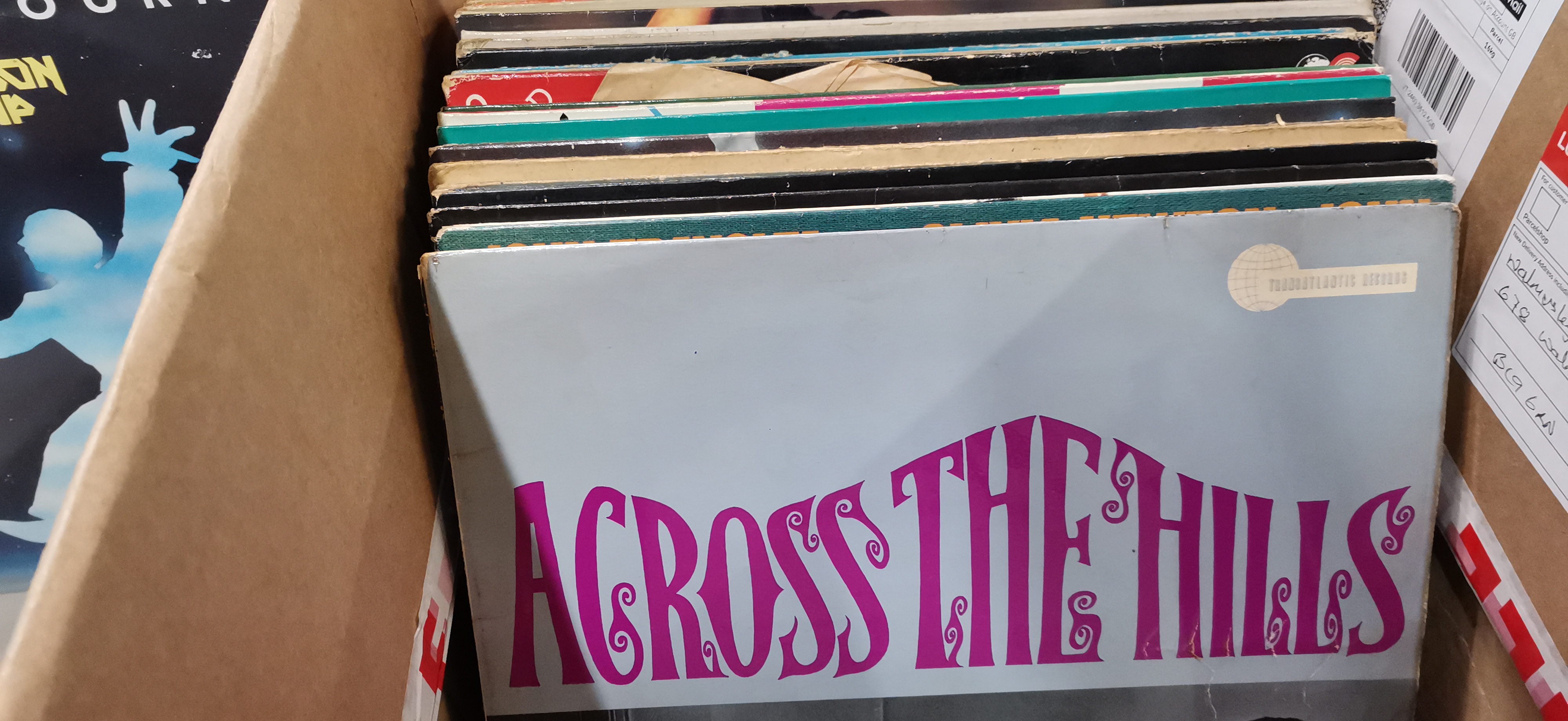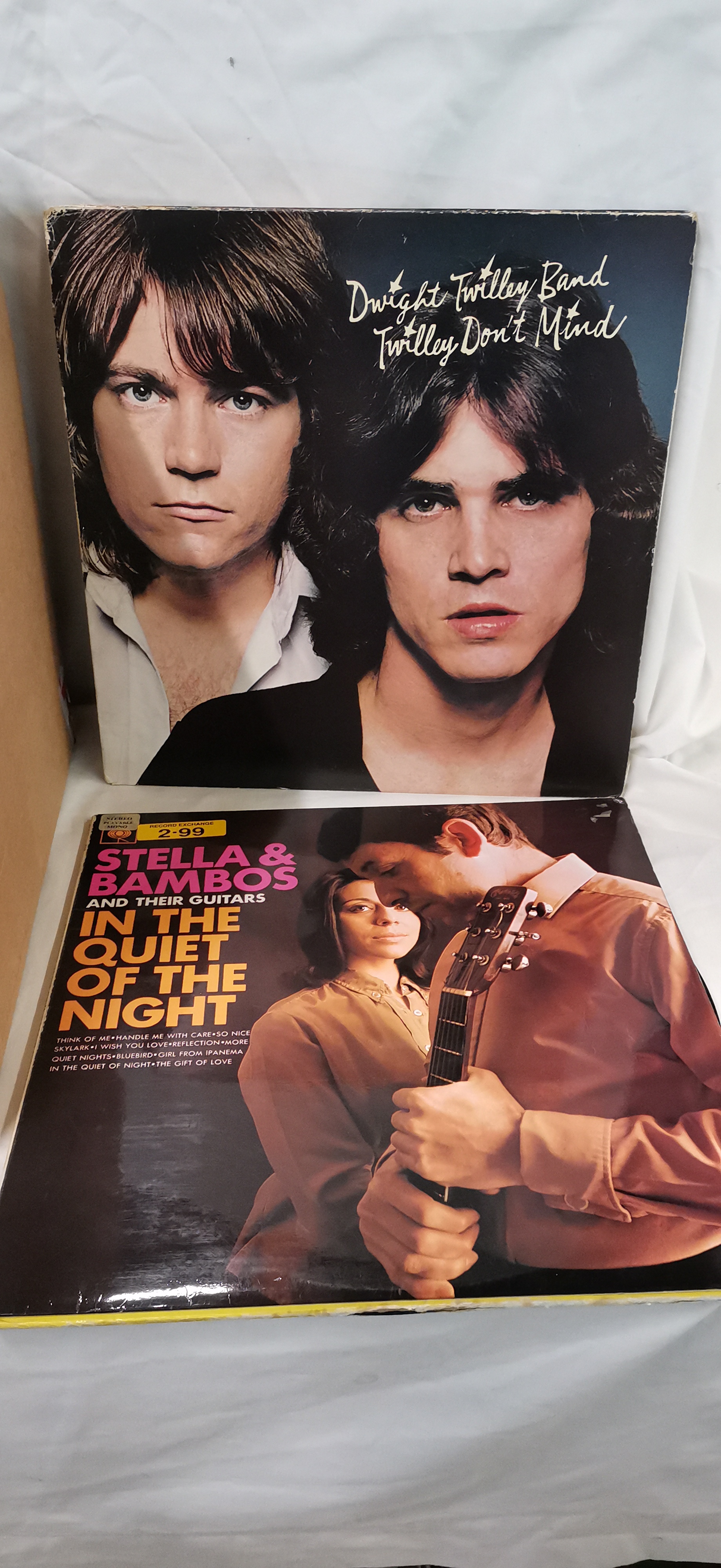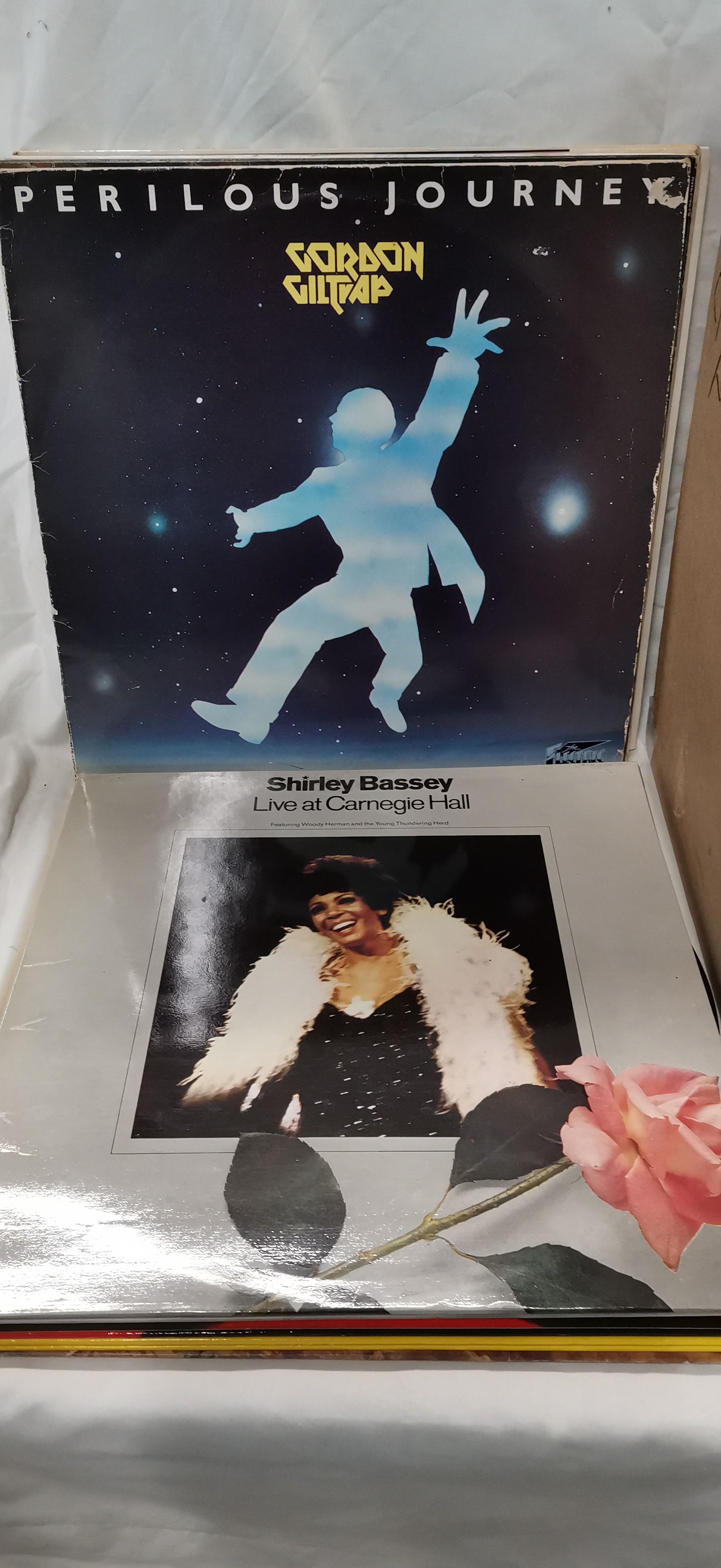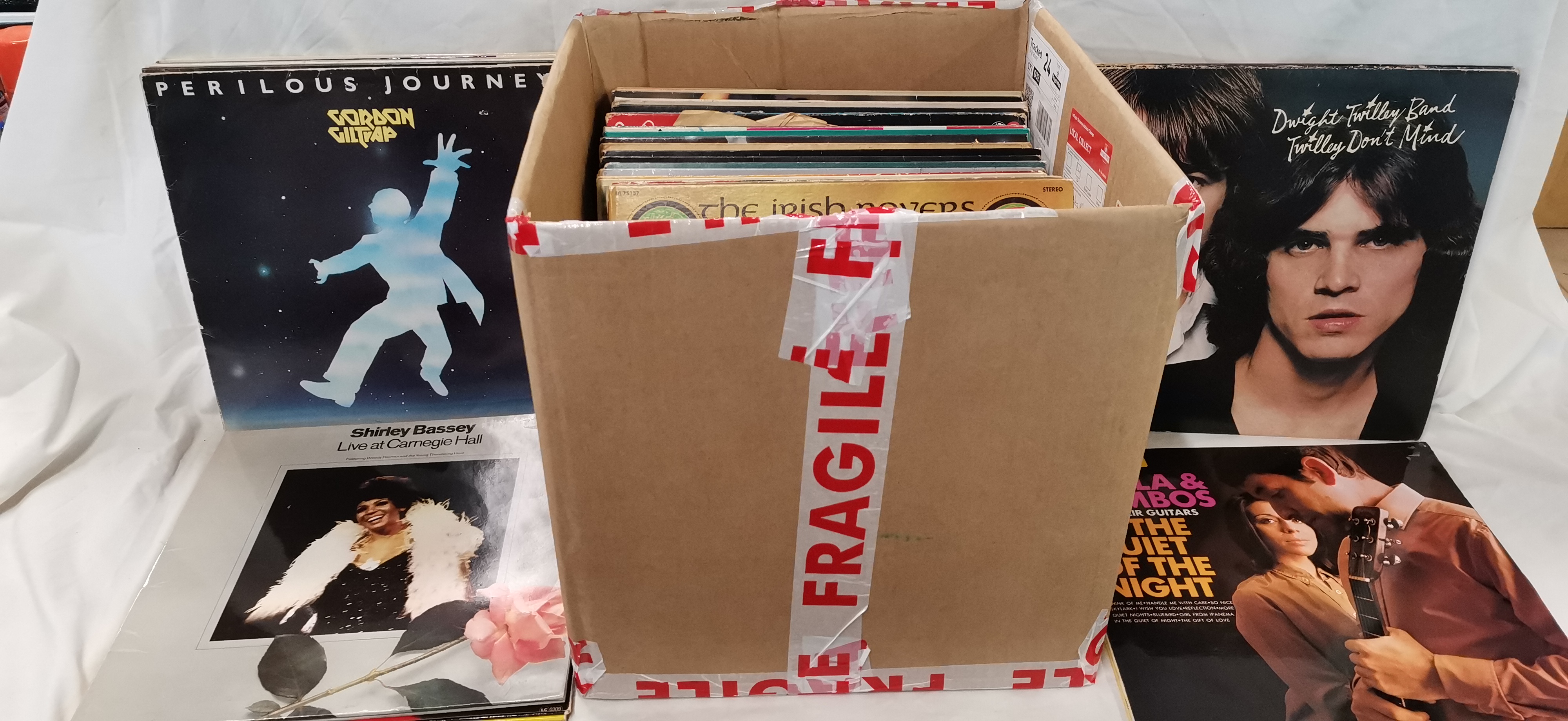 A collection of approximately 25-30 12-inch vinyl LP records spanning various genres including rock, pop, folk, and soundtracks. Notable titles and artists identified from the visible covers include Gordon Giltrap Perilous Journey, Shirley Bassey Live at Carnegie Hall featuring Woody Herman and the Young Thundering Herd, and Dwight Twilley Band Twilley Don’t Mind. The collection also contains Stella and Bambos In the Quiet of the Night on the CBS label, bearing a vintage Record Exchange price sticker, and the self-titled Across the Hills album published by Transatlantic Records with the globe logo. Also present is a Ronco compilation, The Greatest Hits of Walt Disney, featuring 24 original soundtrack recordings, and a partial cover for The Irish Rovers. The lot is housed within a single cardboard box.