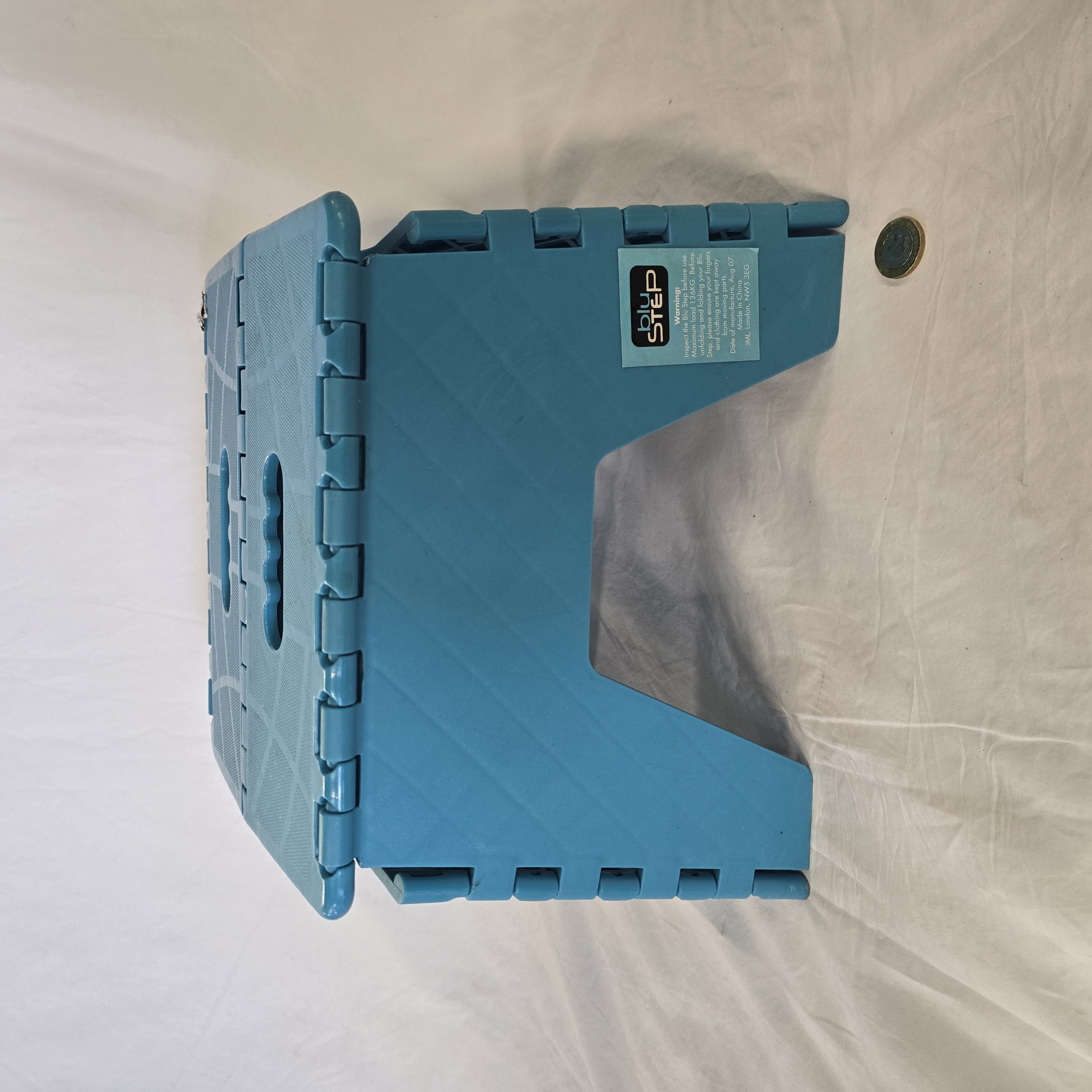 A contemporary folding plastic step stool in a blue finish, manufactured by Blu Step. The stool is constructed with a hinged design for collapsible storage, featuring a textured top surface and an integrated carrying handle. A manufacturer’s label is present on the side, stating the brand name blu STEP, a maximum load capacity of 136kg, and a manufacture date of August 2007. The label also includes the address JML, London, NW5 3EG and indicates the item was made in China. A UK one pound coin is shown for scale.