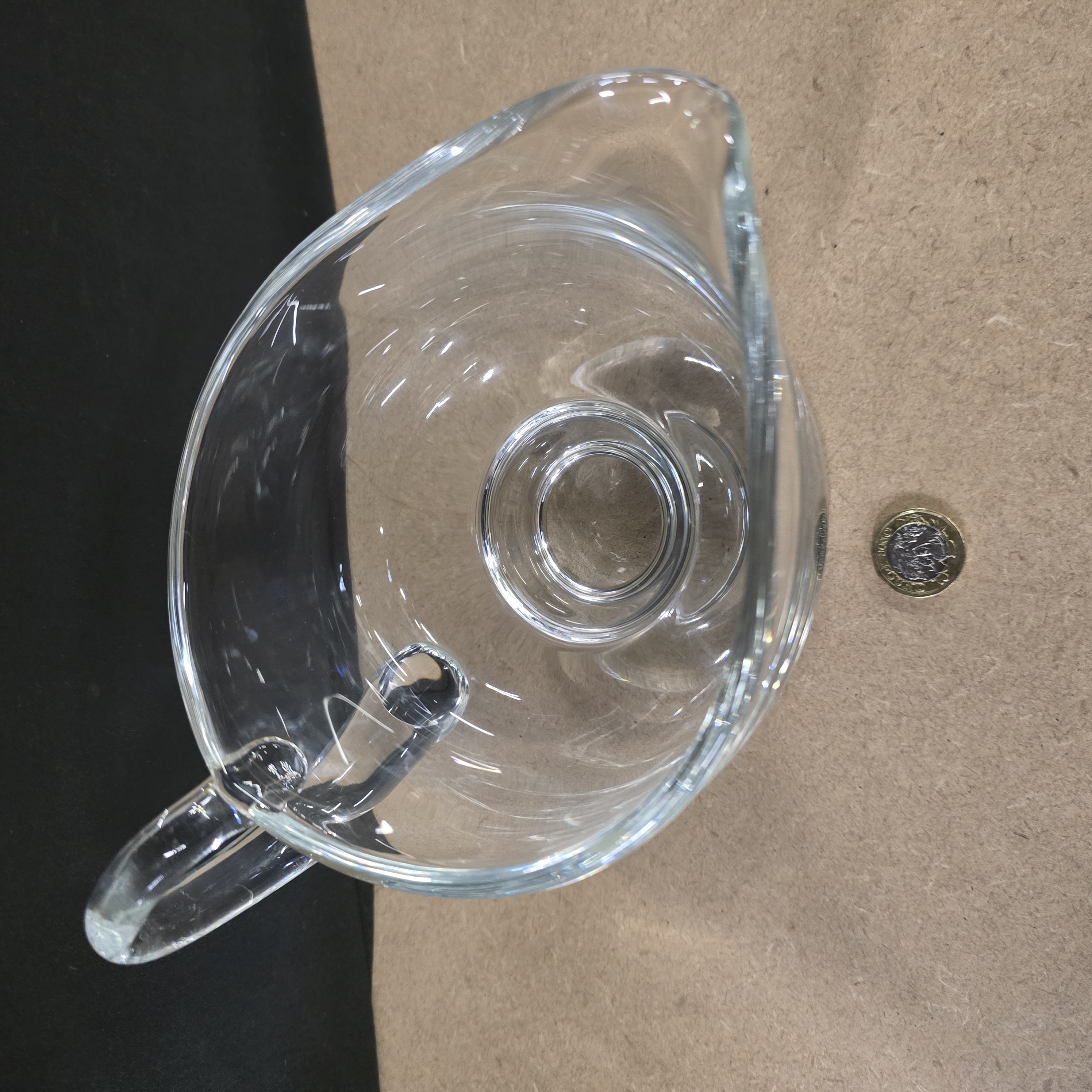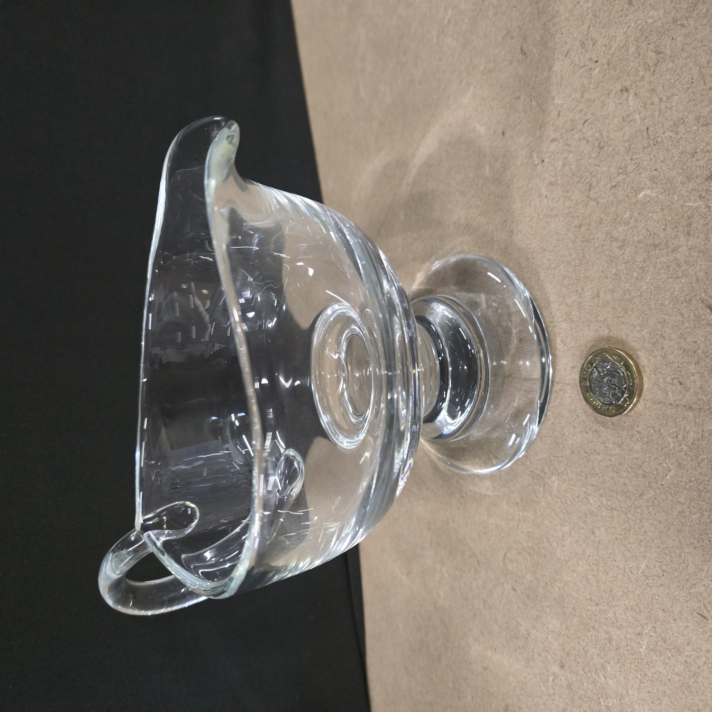 A contemporary clear glass sauce boat manufactured by Dartington Crystal in Devon, England. The vessel features a rounded, undecorated body with a wide pouring lip and an applied loop handle. The body is supported by a short, waisted stem resting on a circular pedestal foot. The item is constructed from clear lead crystal. An acid-etched mark for Dartington is present on the underside of the base.