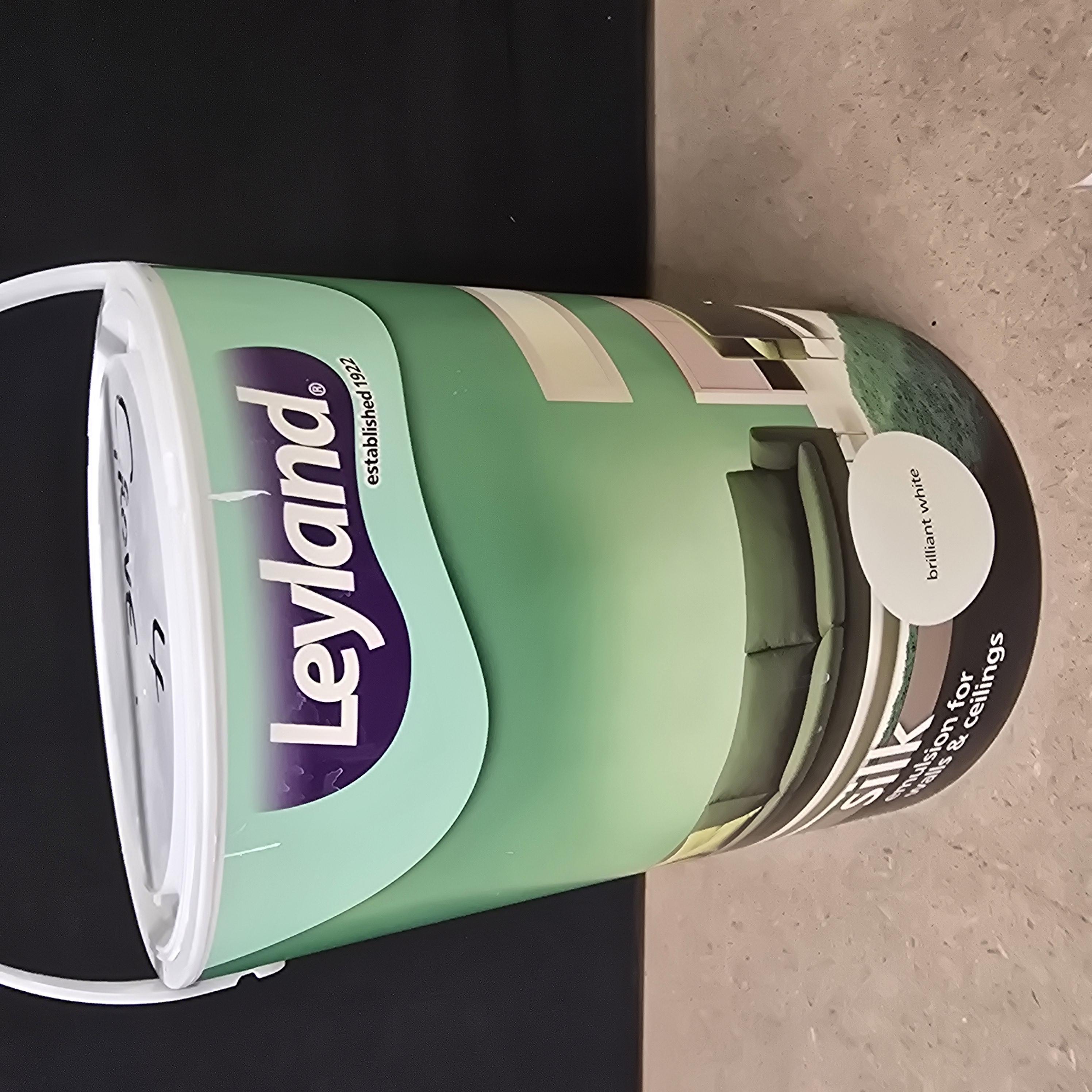 A single container of Leyland brand Silk emulsion paint, formulated for use on walls and ceilings. The paint is in the colour brilliant white. The product is contained within a white plastic tub featuring an integrated carry handle and a matching lid. The label includes the Leyland branding and the text established 1922. Handwritten ink markings are present on the upper surface of the lid. This item is part full.