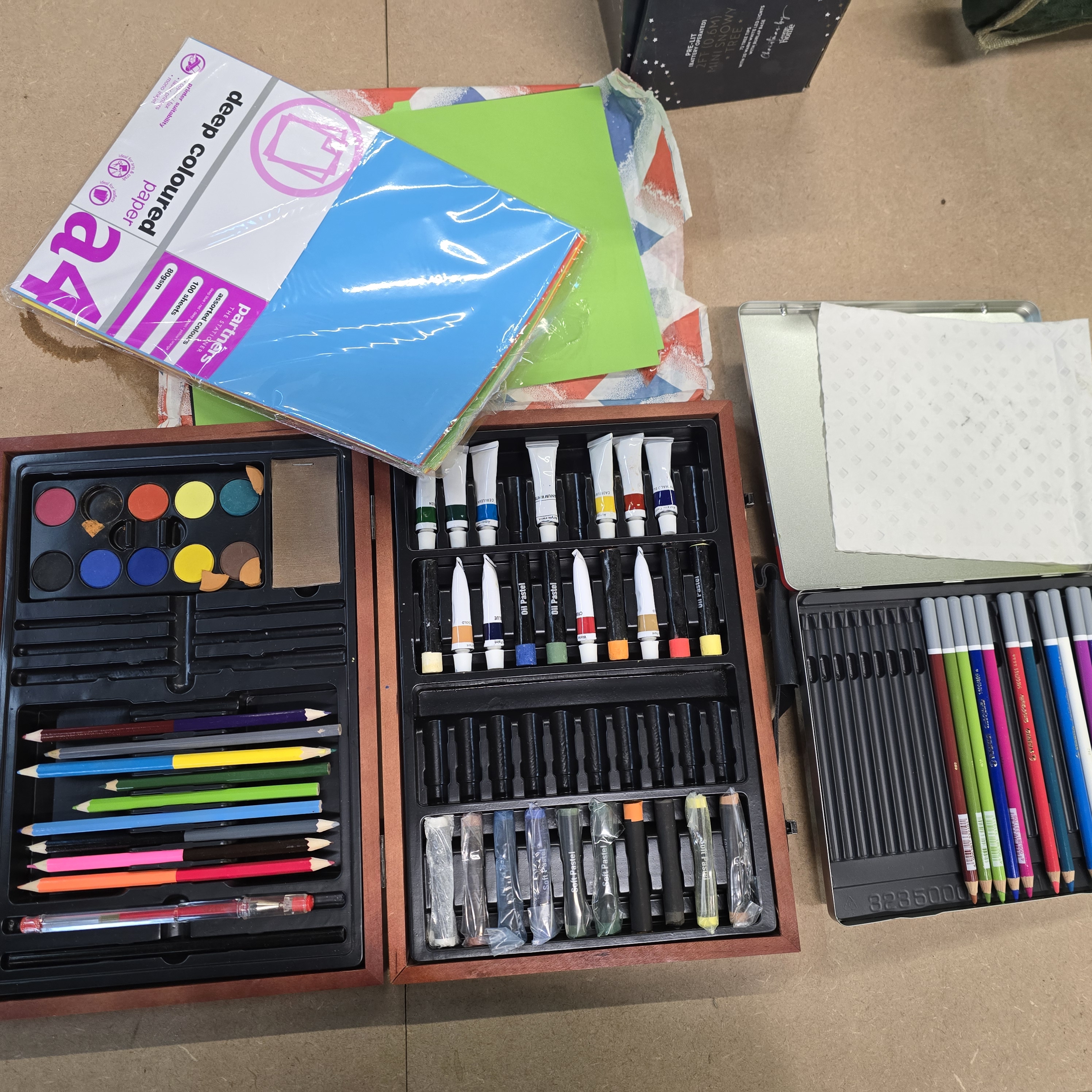 A collection of modern artist’s materials comprising a wooden-cased multi-media set, a metal tin of pencils, and a pack of coloured paper. The hinged wooden case contains various media including watercolour pans, coloured pencils, oil pastels, and soft pastels. The internal plastic dividers are marked with the text Oil Pastel and the wrapped sticks in the lower section are marked Soft Pastel. The metal tin contains a selection of graphite drawing pencils and coloured pencils, with the internal plastic tray embossed with the digits 3235000. Also included is a pack of A4 deep coloured paper in clear plastic packaging, bearing the label for Partners THE STATIONER.