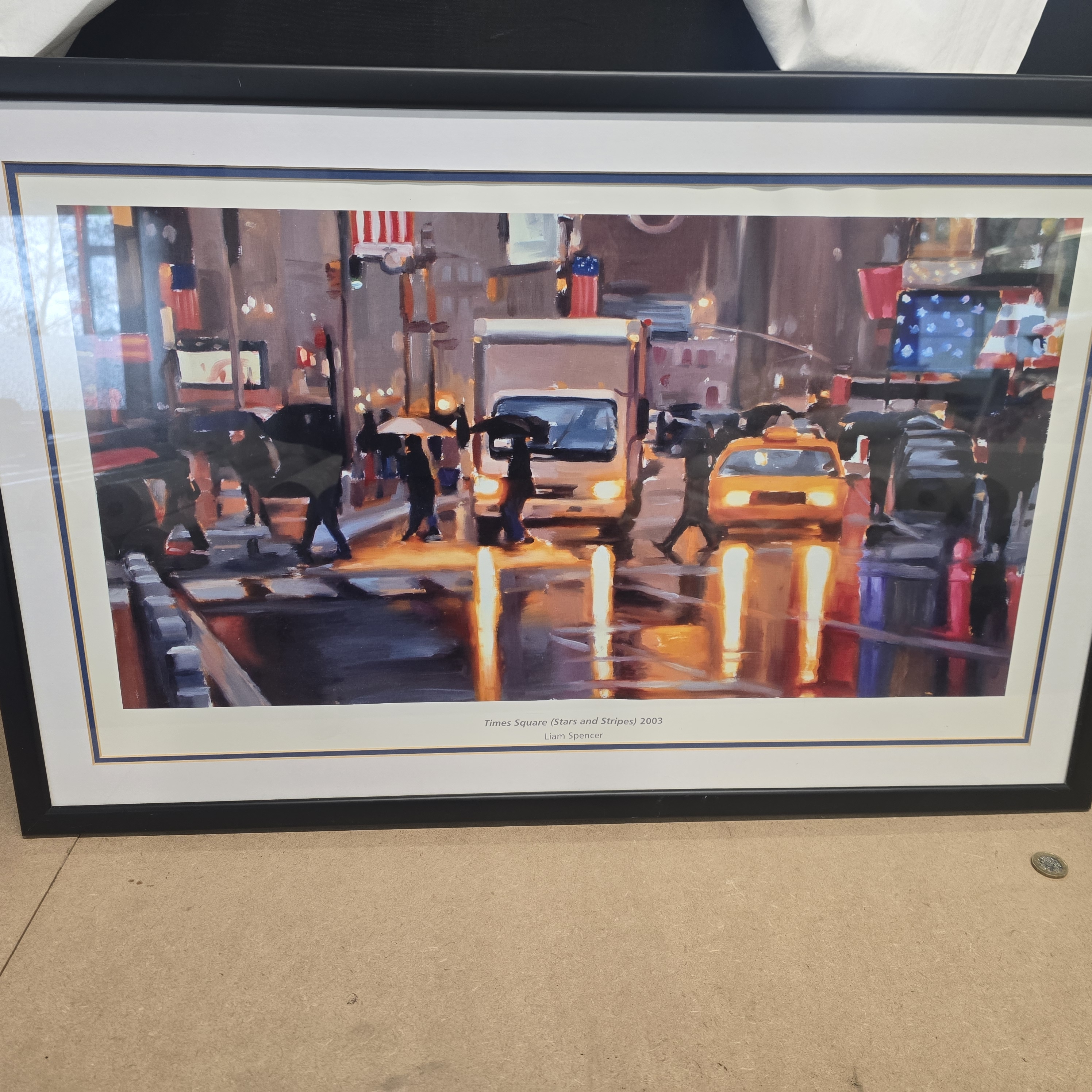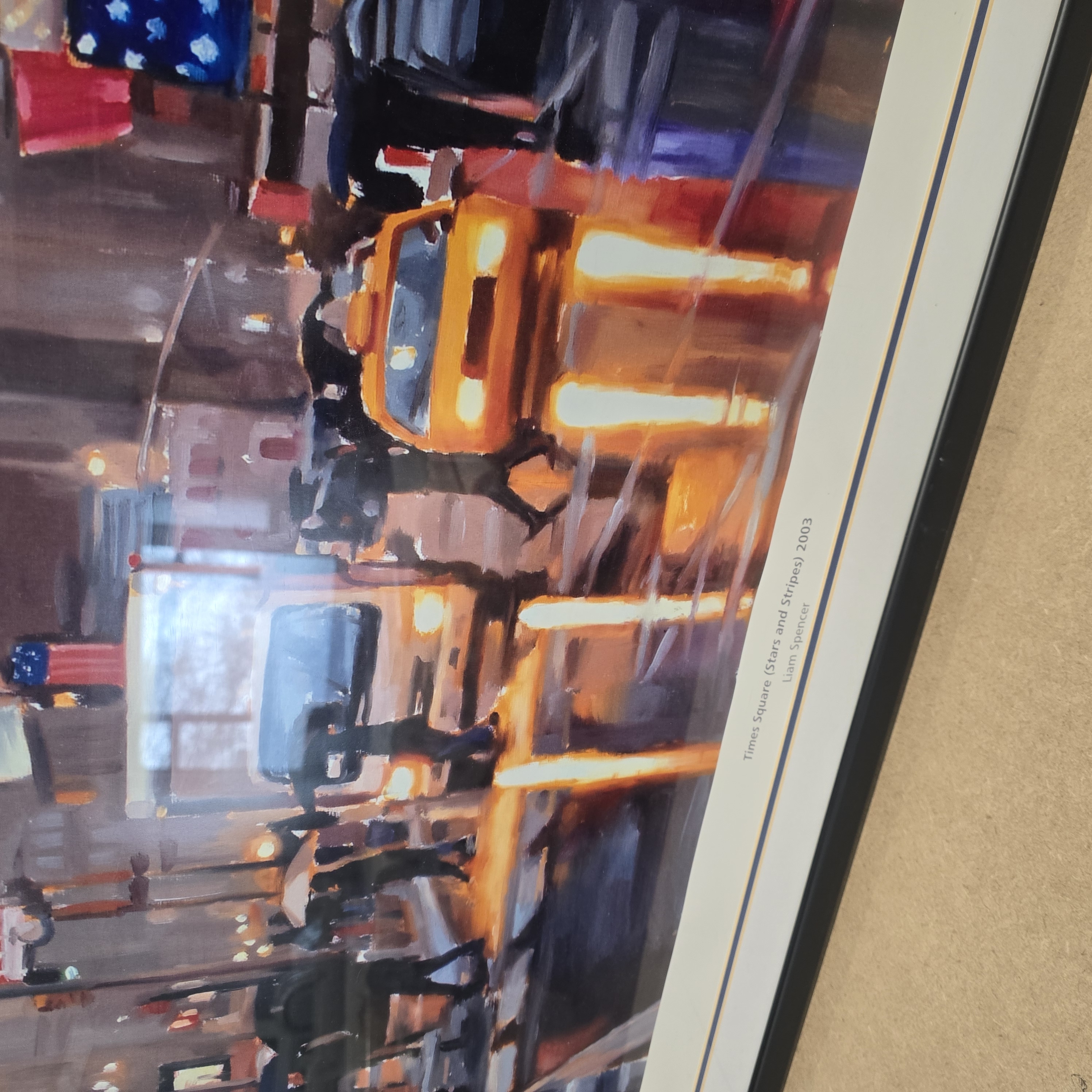 A giclée print on paper after an original work by Liam Spencer (British, b. 1964). The image depicts an impressionistic street scene of Times Square, New York, in the rain. The composition includes yellow taxis with reflections on the wet pavement, pedestrians with umbrellas, and American flags. The work features the printed title Times Square (Stars and Stripes) 2003 and the artist’s name Liam Spencer in the lower margin. No hand-signature or edition numbering is visible. The print is set within a white mount featuring a blue inner border and is housed in a contemporary black frame.