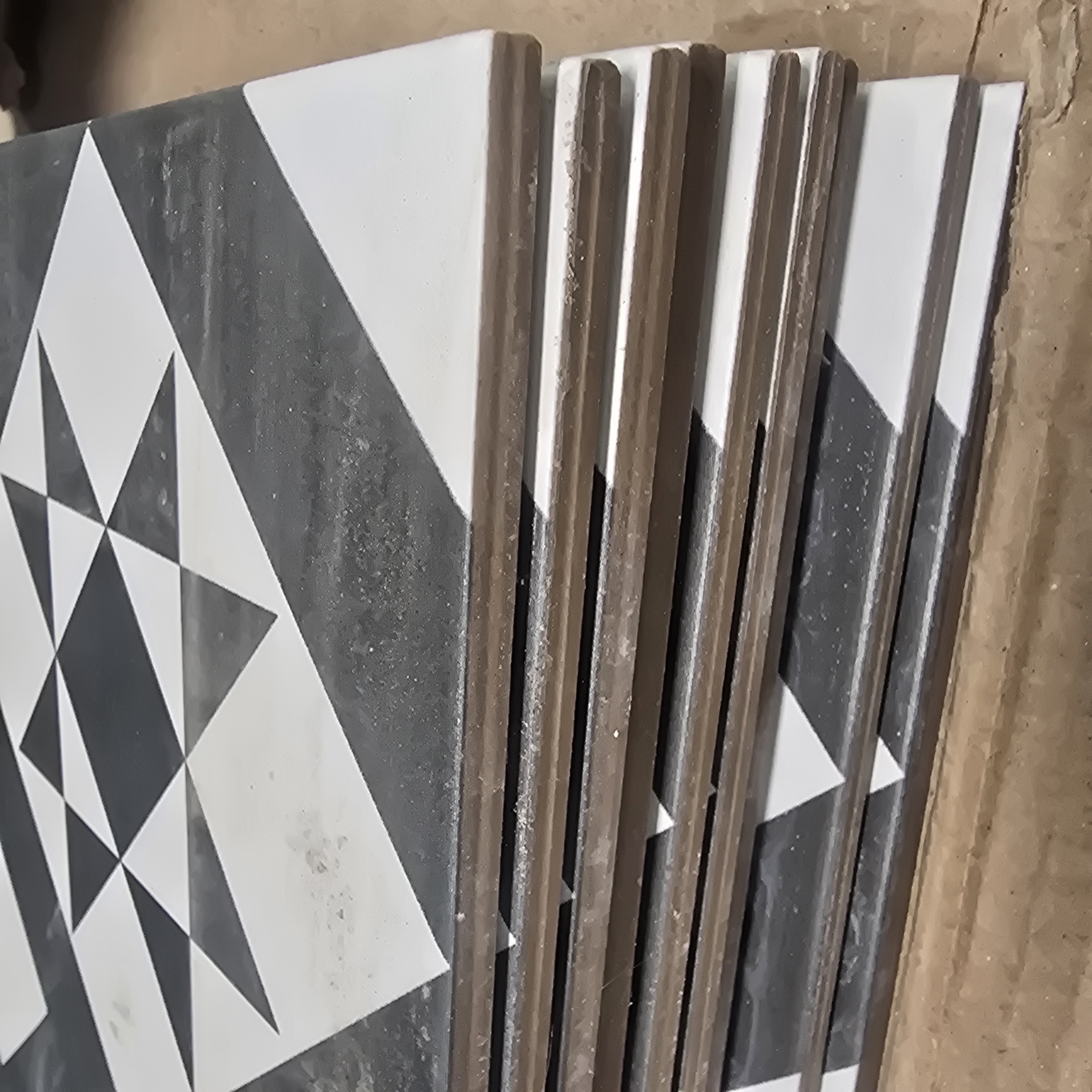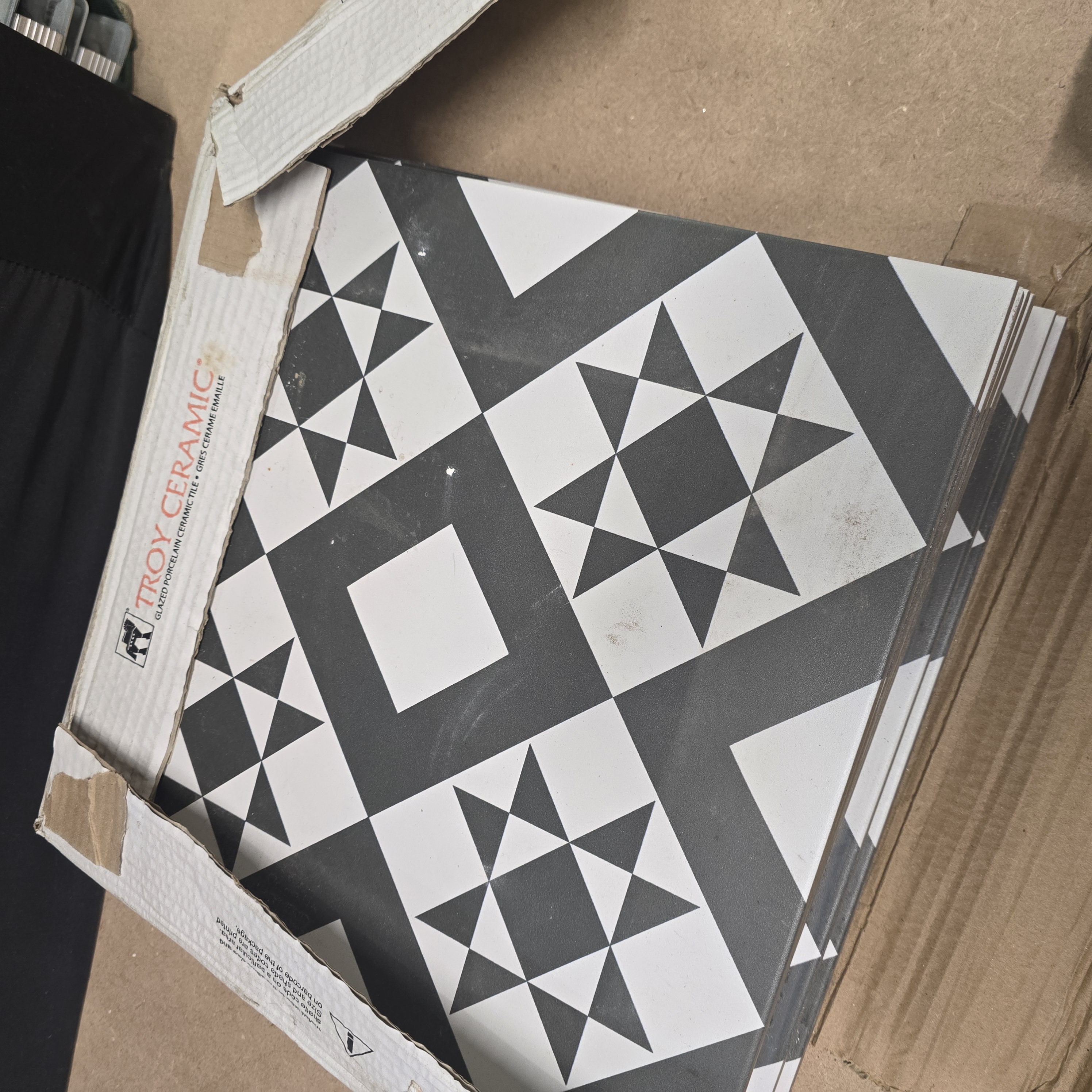 A set of glazed porcelain ceramic tiles produced by Troy Ceramic. The tiles feature a repeating geometric star pattern in a black and white colour palette. The construction is glazed porcelain, as indicated by the manufacturer packaging which also carries the French designation Gres Cerame Emaille. The design incorporates a central star motif within a square frame, creating a continuous pattern when laid. The tiles have a matte surface finish.