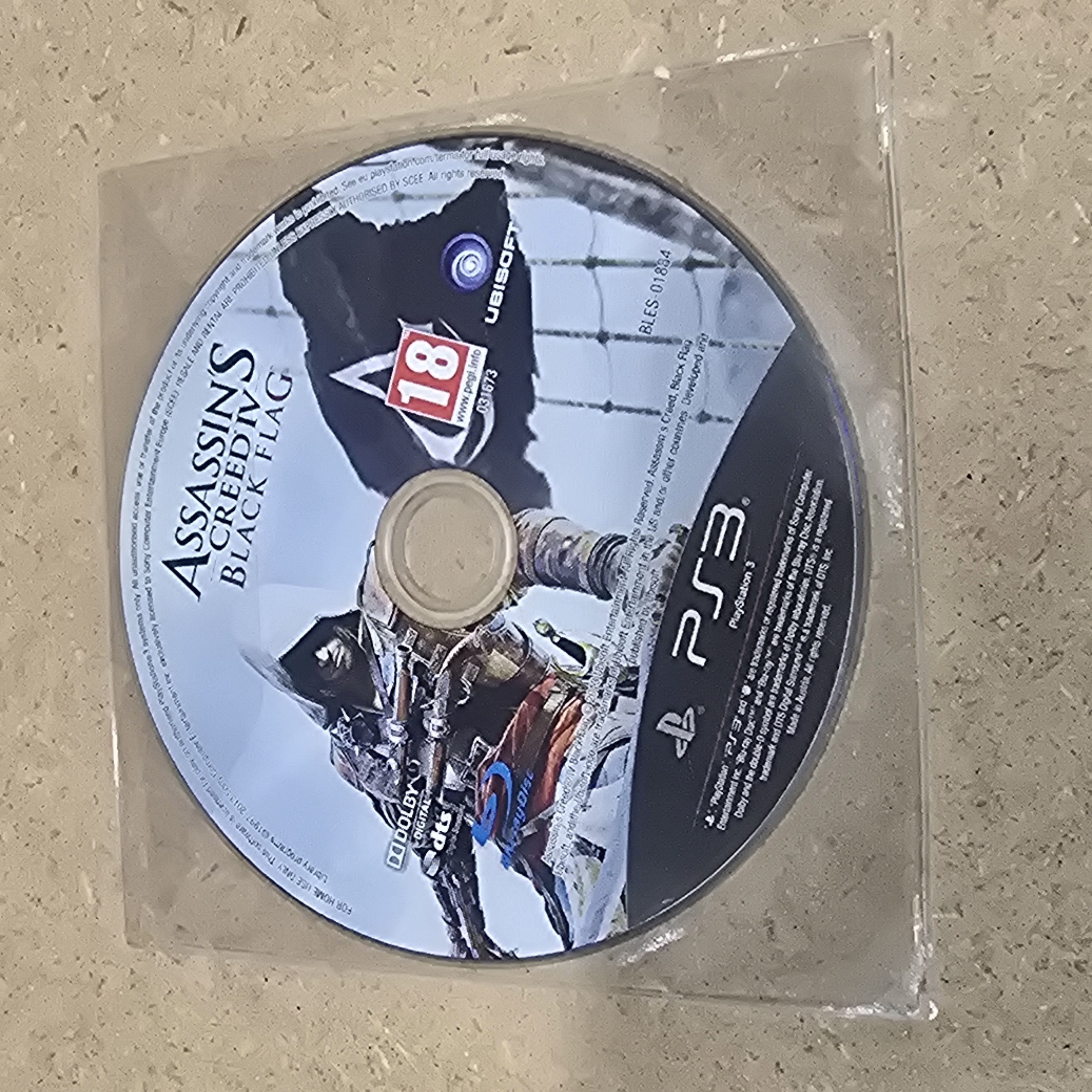 A video game software disc for the Sony PlayStation 3 console, Assassin’s Creed IV Black Flag, published by Ubisoft. The disc is a PAL region release, identified by the product code BLES 01884 and the PEGI 18 age rating logo. The upper surface is finished with a printed graphic depicting the game’s protagonist against a nautical-themed background, including the Ubisoft and PlayStation 3 logos. The disc is composed of polycarbonate. Legal and copyright information is printed in a circular format around the outer edge, including the mark © 2013 Ubisoft Entertainment. This lot consists of the disc only and is missing the original retail case and manual. It is housed in a generic clear plastic sleeve.