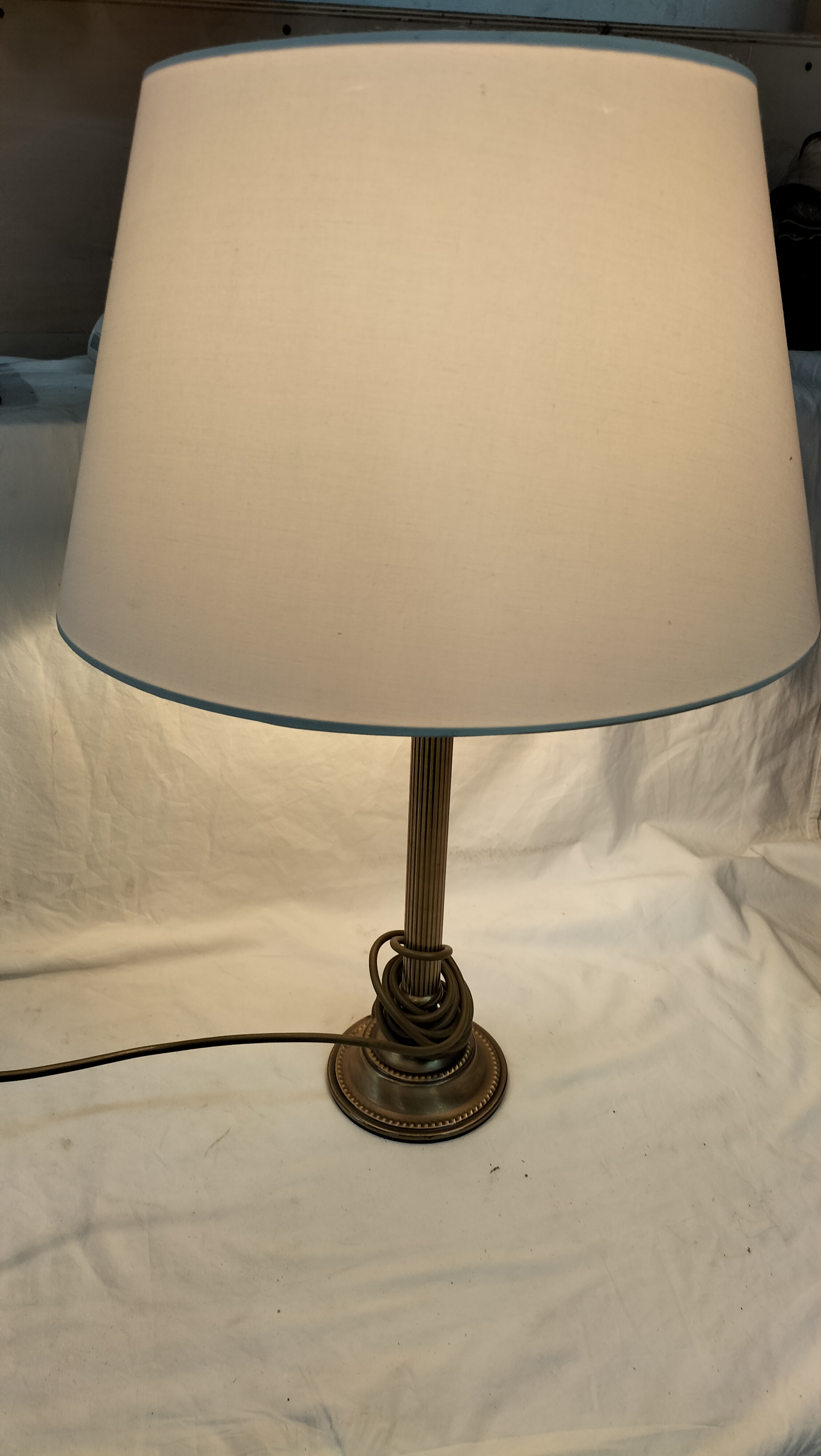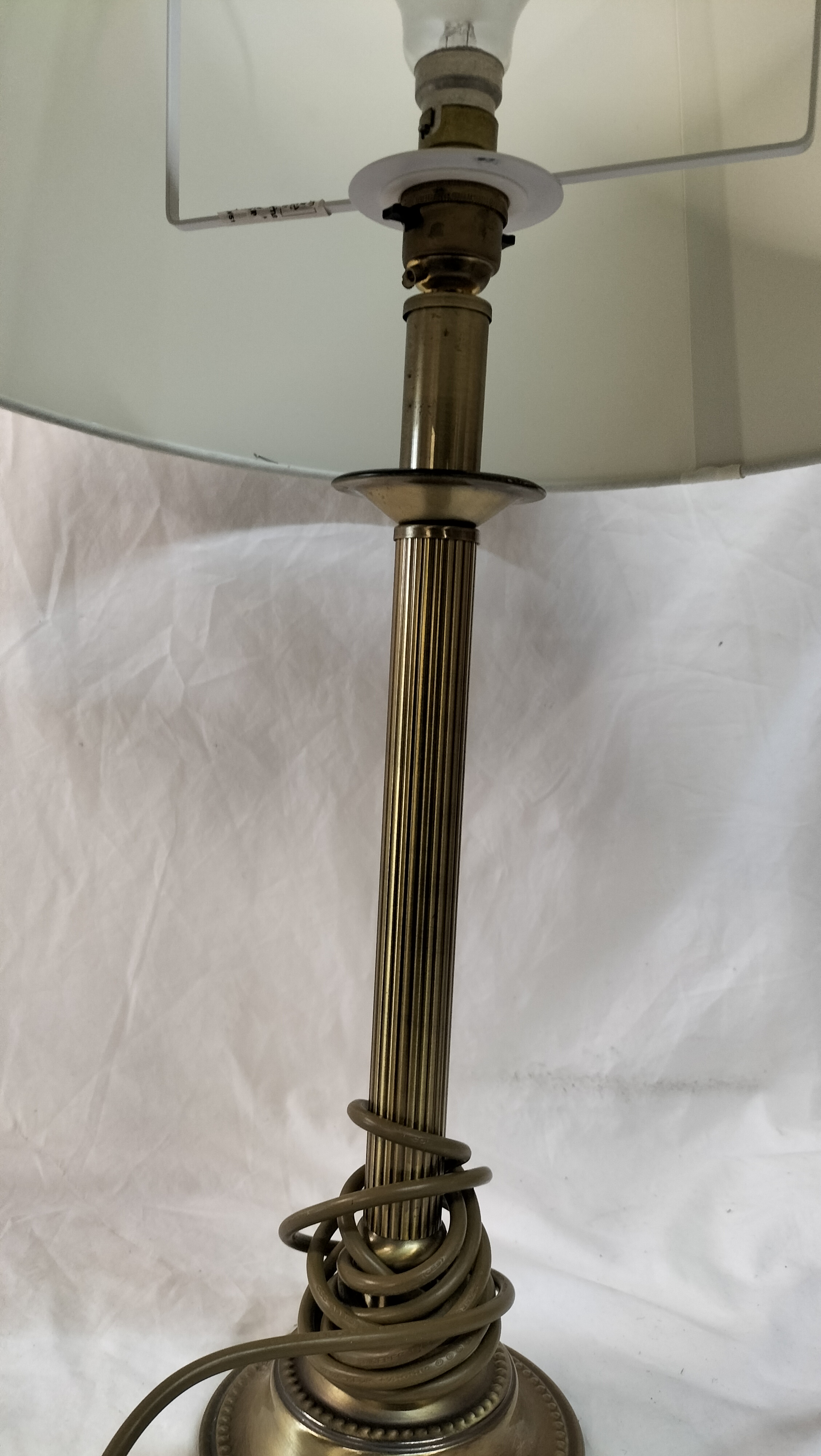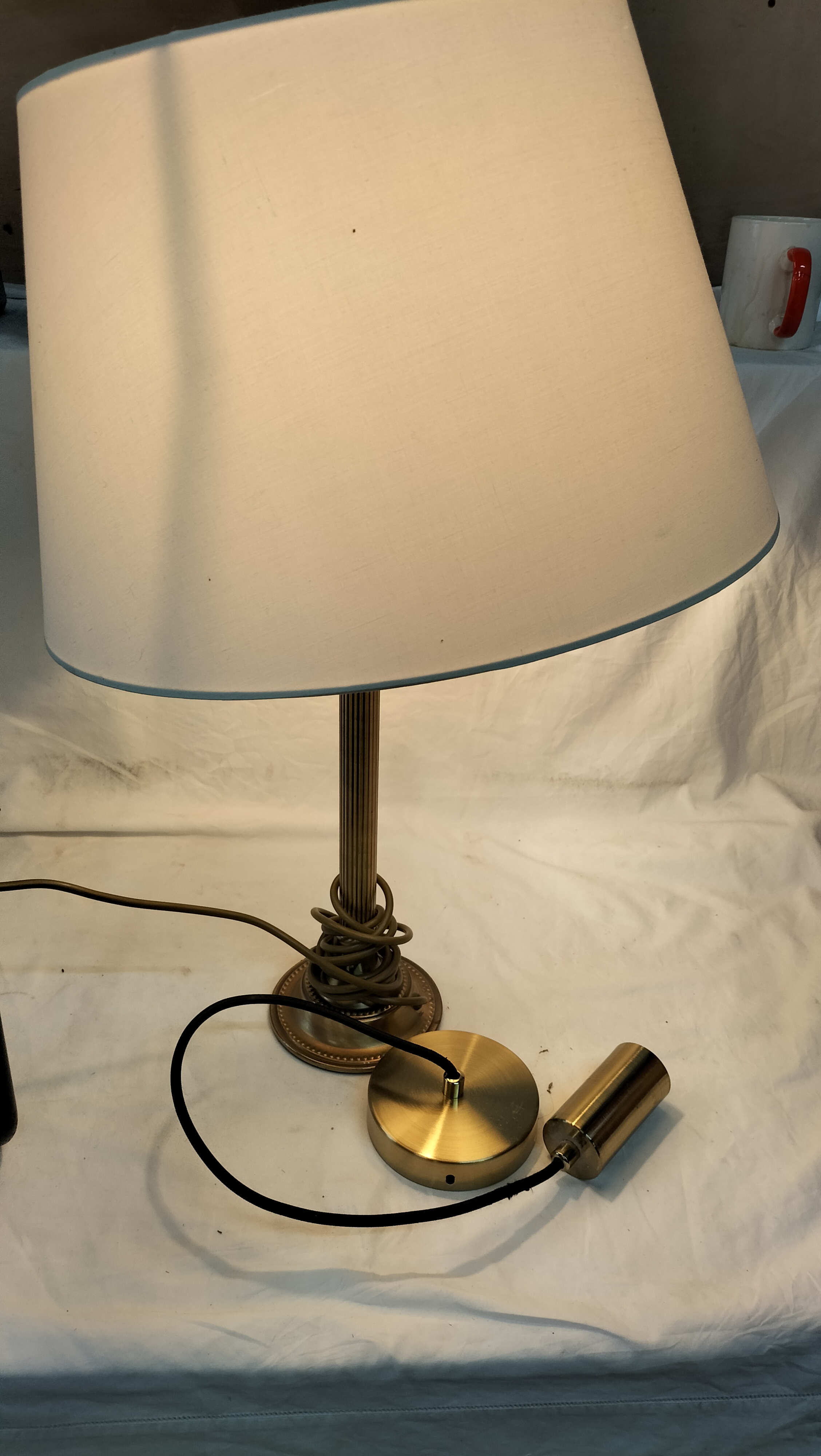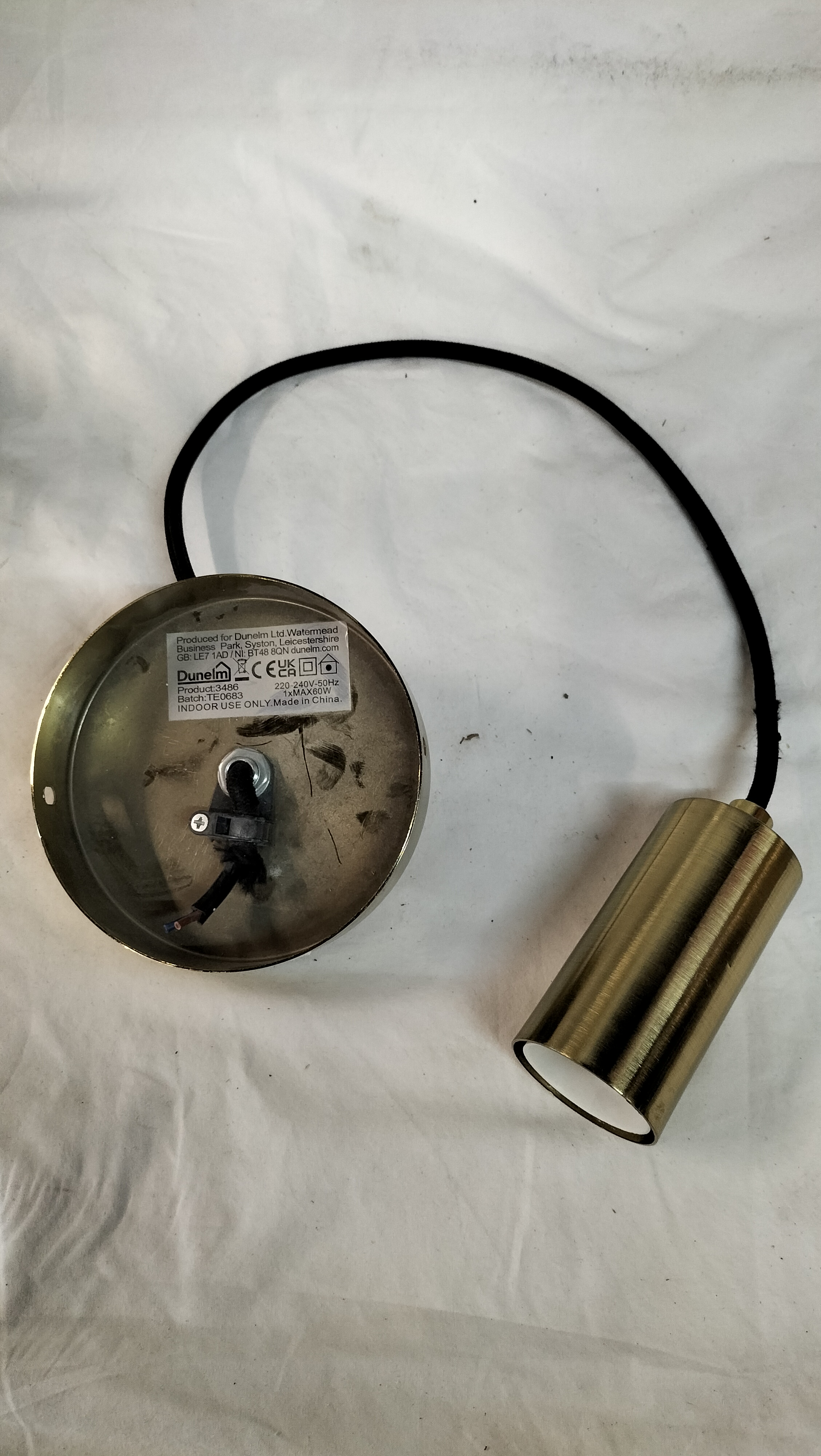 This lot features a table lamp identified as the IKEA FLYGHÖJD model and a modern ceiling pendant fixture by Dunelm. The table lamp is constructed from brass-finished metal in a neoclassical style, featuring a fluted central column set upon a circular stepped base with a beaded rim. It is accompanied by a large cream-coloured fabric tapered drum shade and is fitted with a brown power cord. The second item is a single-light pendant fixture bearing the manufacturer label for Dunelm Ltd, identified as product number 3486 and batch TE0683. This fixture consists of a brass-finished metal ceiling rose and a cylindrical lamp holder connected by a black fabric-covered cable. The pendant wiring terminates in bare ends for installation.
