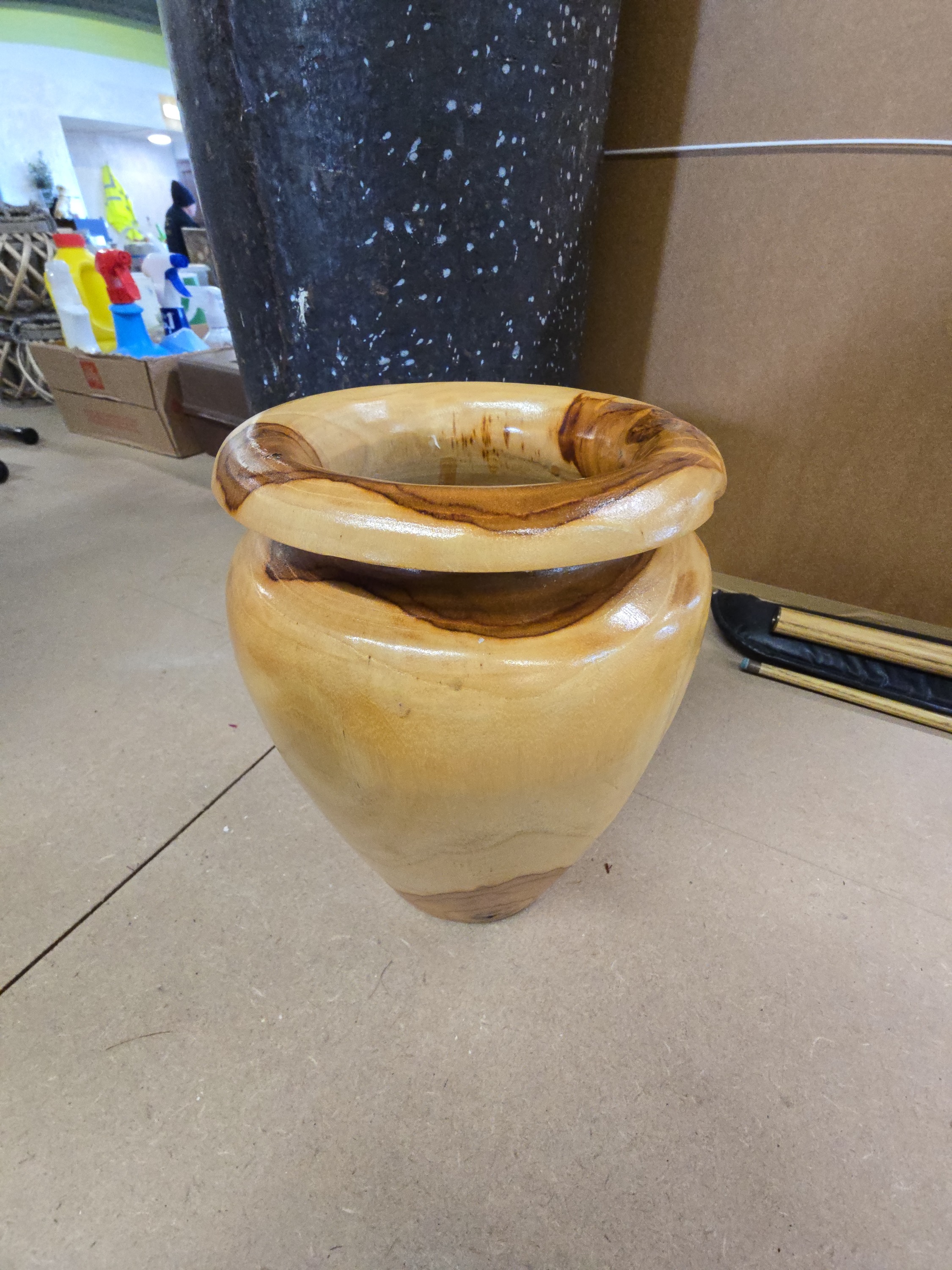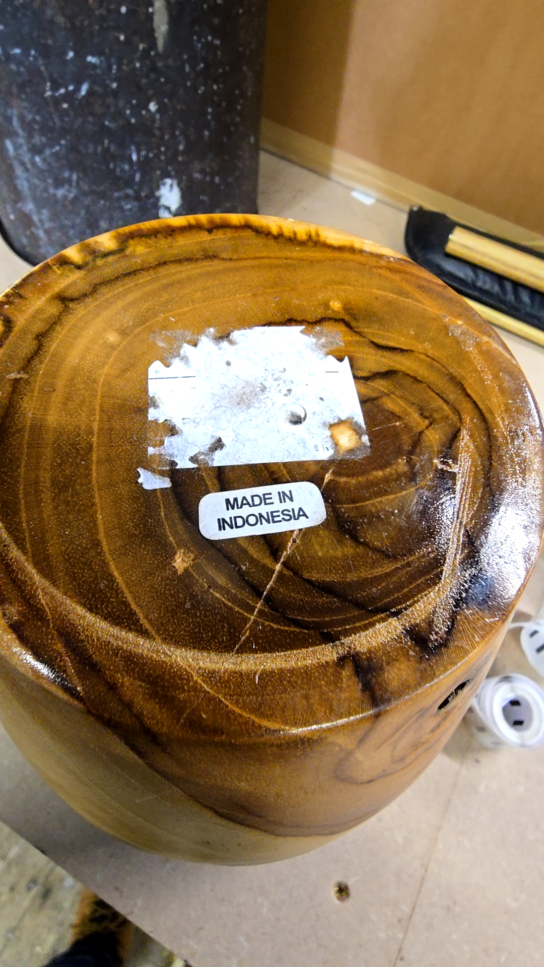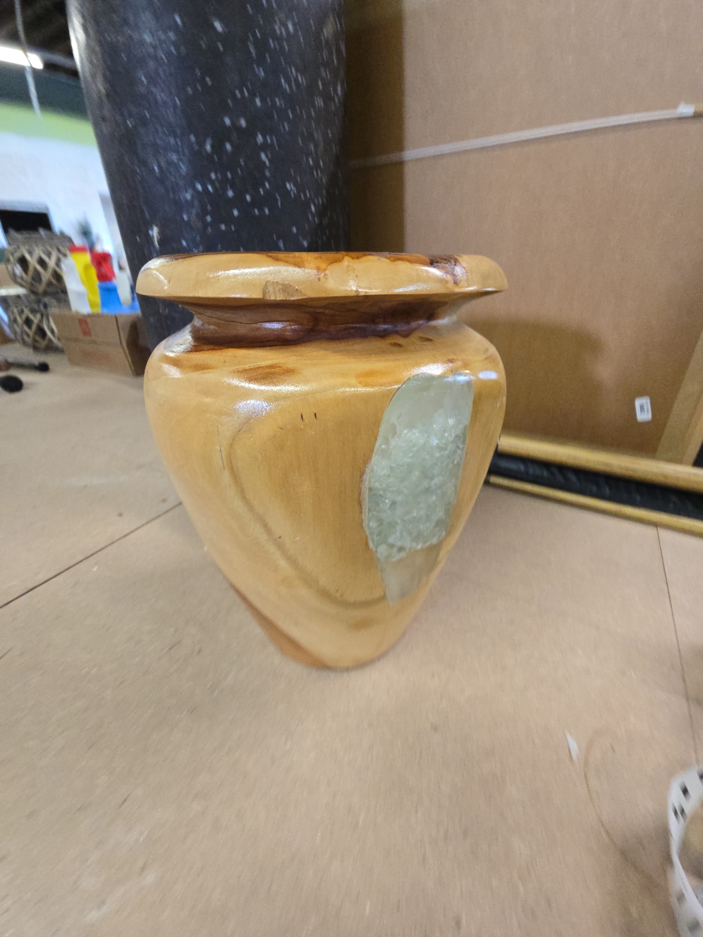 A contemporary hand-turned decorative wood vase of baluster form, originating from Indonesia. The piece features a wide, thick rolled rim and a body that tapers significantly towards a circular base. It is constructed from a light-toned wood displaying prominent natural graining and a high-gloss polished finish. The side of the vessel is accented with a raw, translucent greenish-white mineral or resin inlay, integrated into the natural contours of the wood. The underside of the base retains a printed label stating MADE IN INDONESIA and shows the remains of a partially removed rectangular white adhesive sticker. The interior is hollowed, consistent with turned wood vessels or decorative urns.