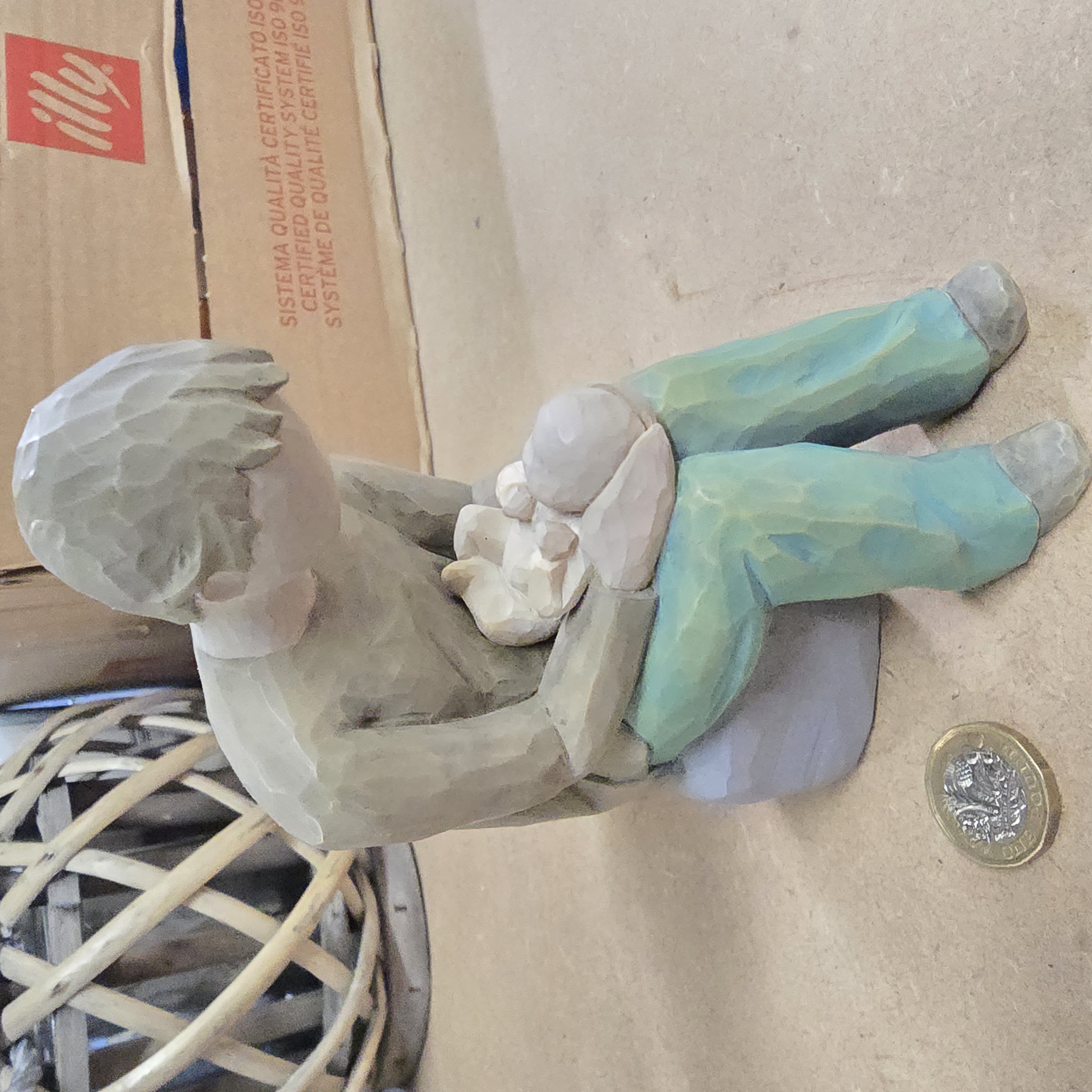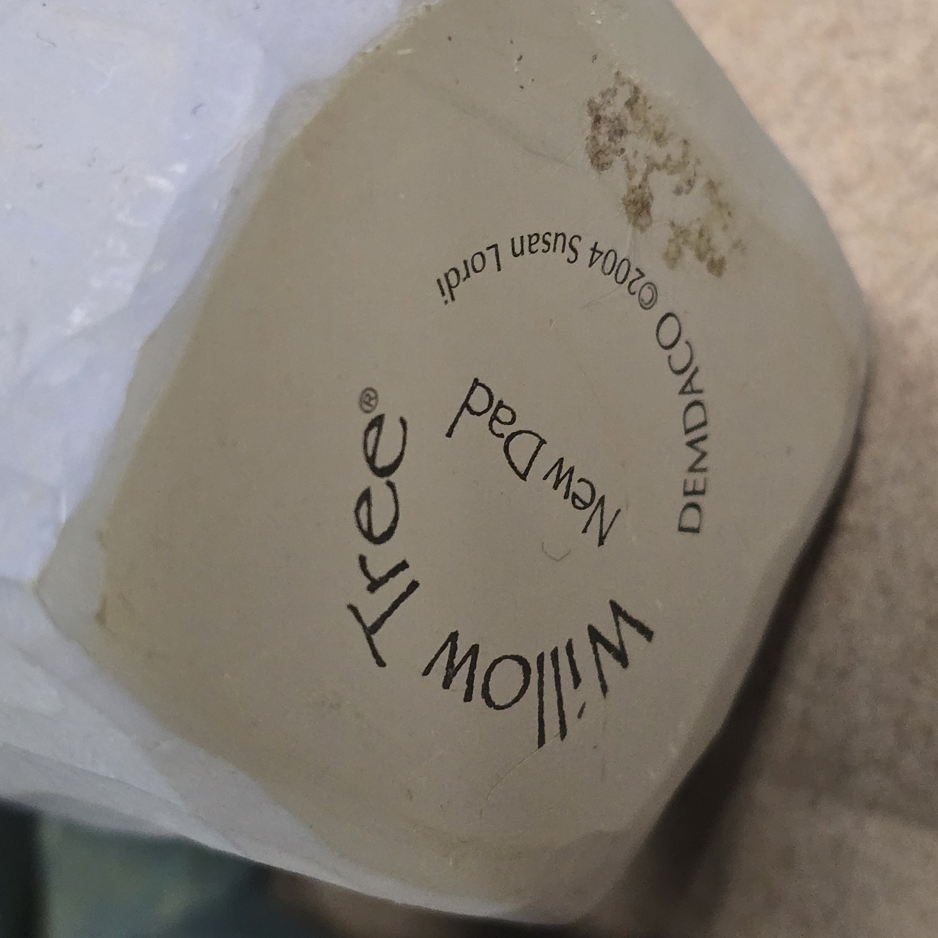 A Willow Tree figurine titled New Dad, designed by artist Susan Lordi for DEMDACO. The piece is manufactured from hand-painted cast resin with a textured surface finish designed to replicate the appearance of carved wood. The sculpture depicts a seated male figure wearing a brown top and teal trousers, cradling a swaddled infant. The underside of the base bears the printed marks Willow Tree, New Dad, and DEMDACO copyright 2004 Susan Lordi.