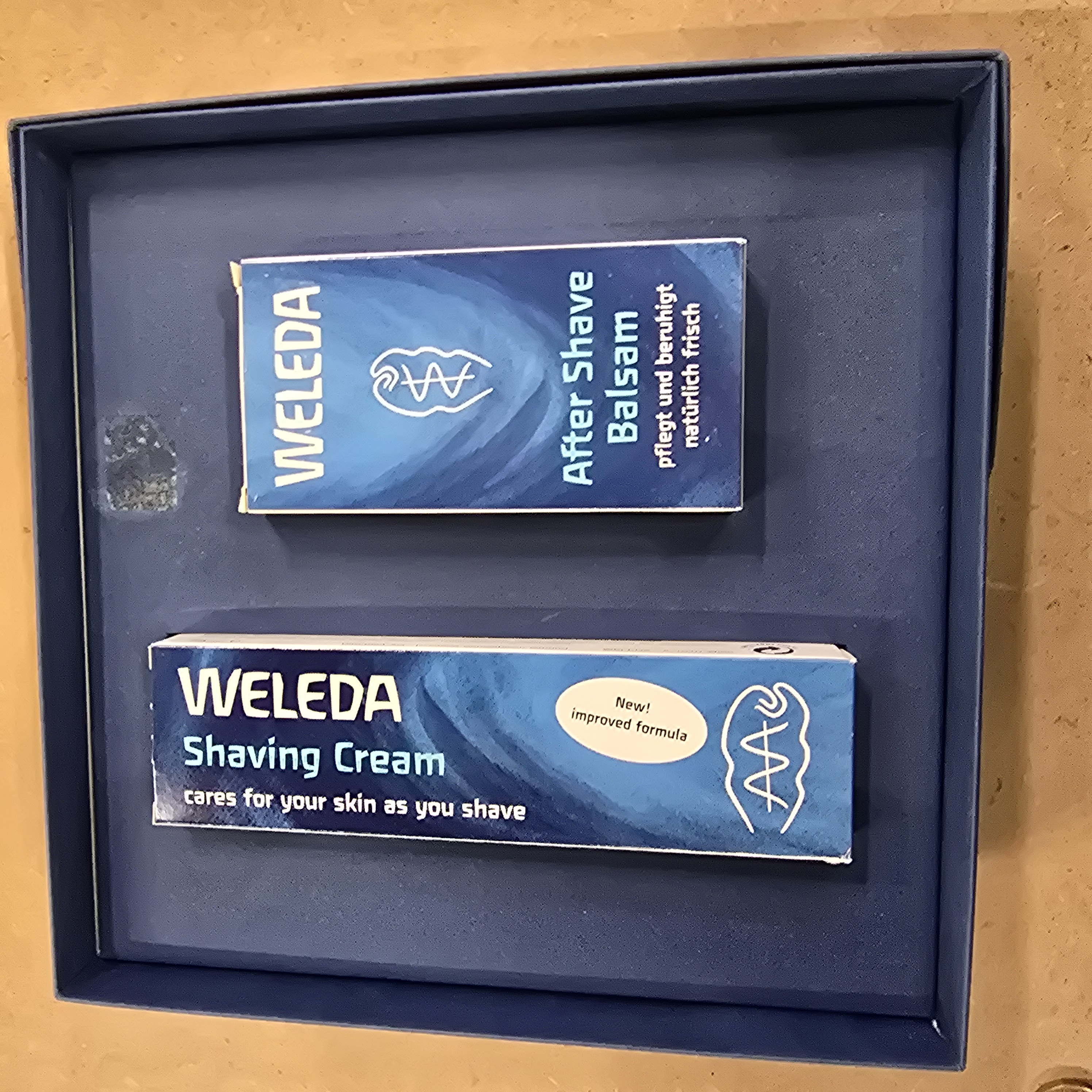 A grooming set by Weleda, featuring two individual products presented in a blue cardboard display tray. The set includes a tube of Weleda Shaving Cream, the packaging of which is marked with the text cares for your skin as you shave and New! improved formula. Also included is a tube of Weleda After Shave Balsam, with packaging featuring the German text pflegt und beruhigt natürlich frisch. Both boxes are printed with the stylized Weleda logo and brand name. The items are contained within their original individual cardboard boxes.