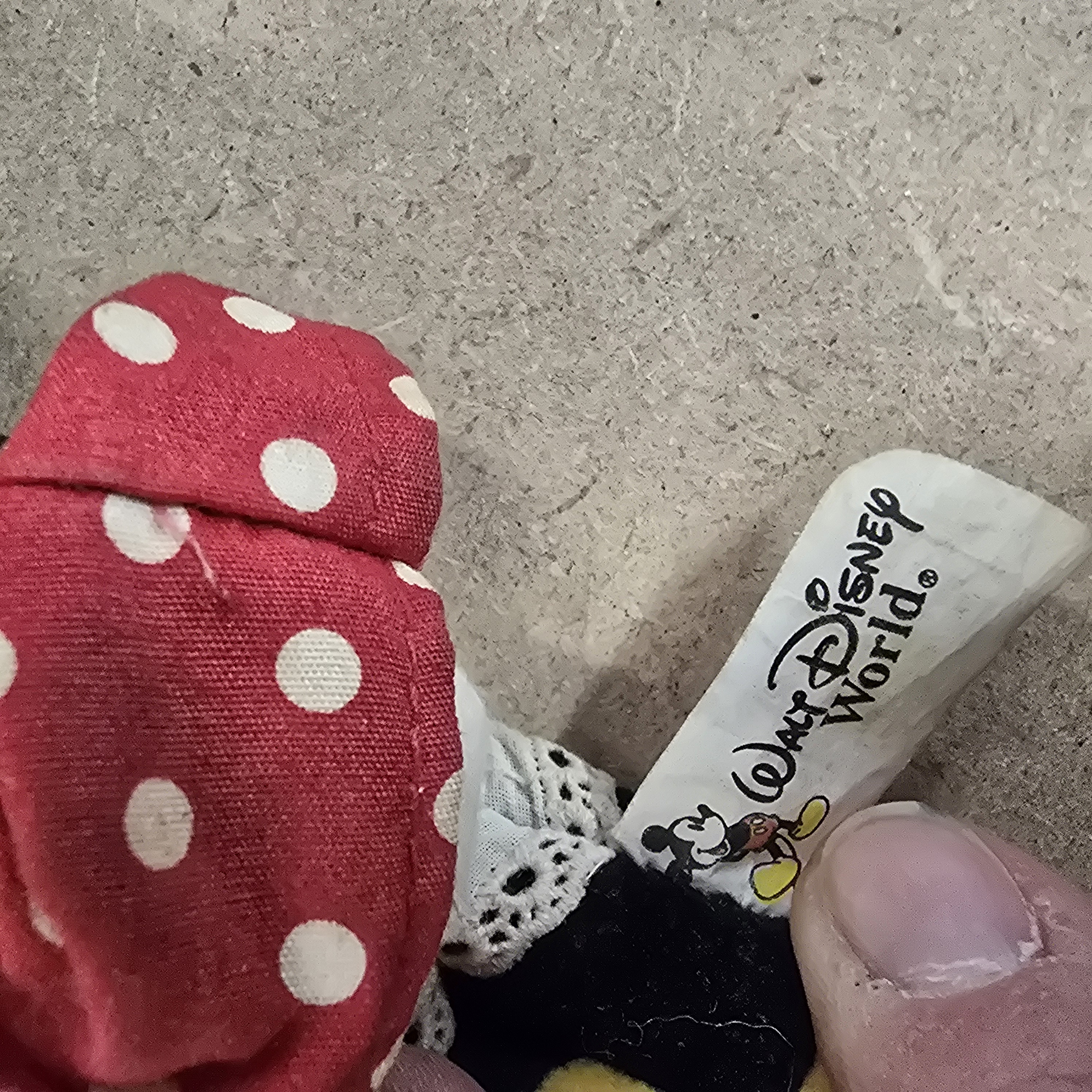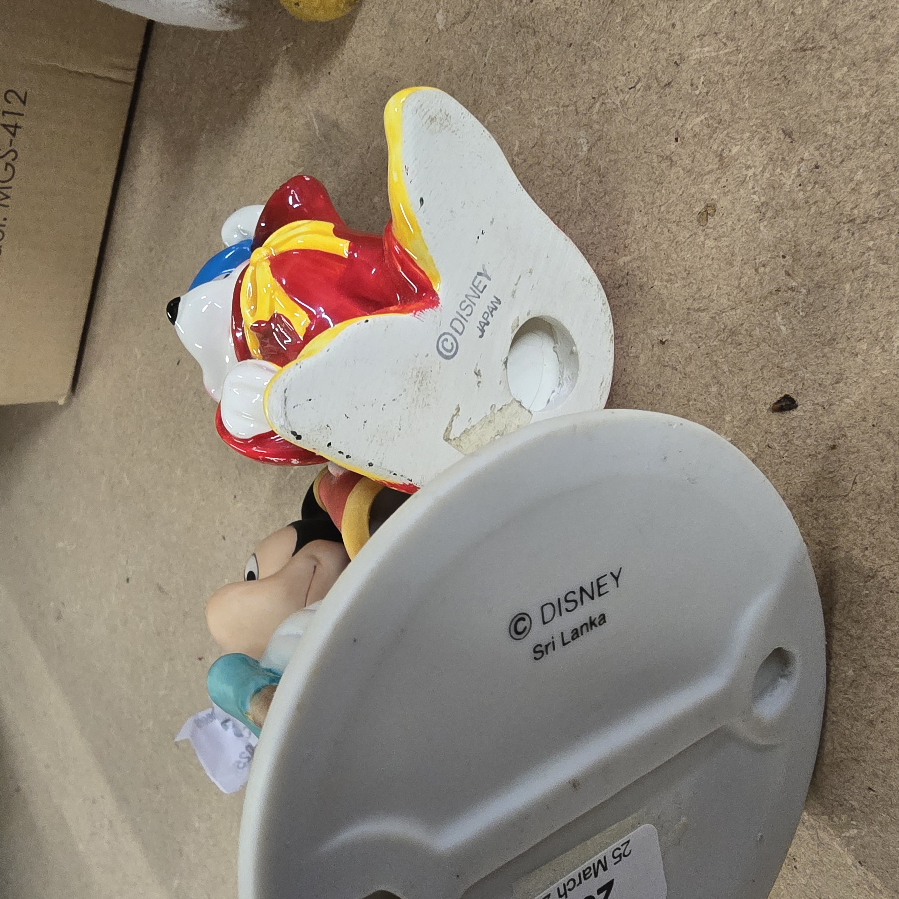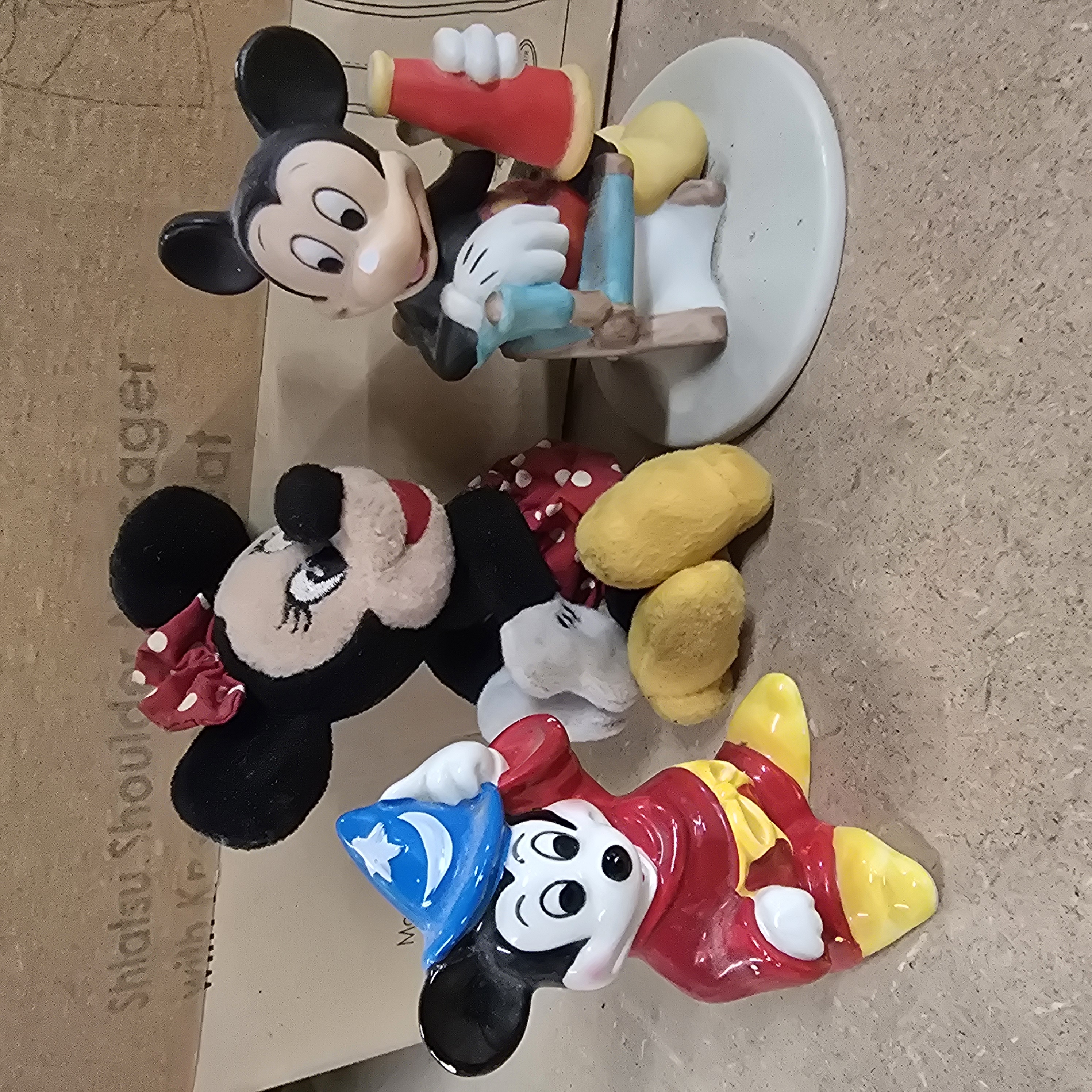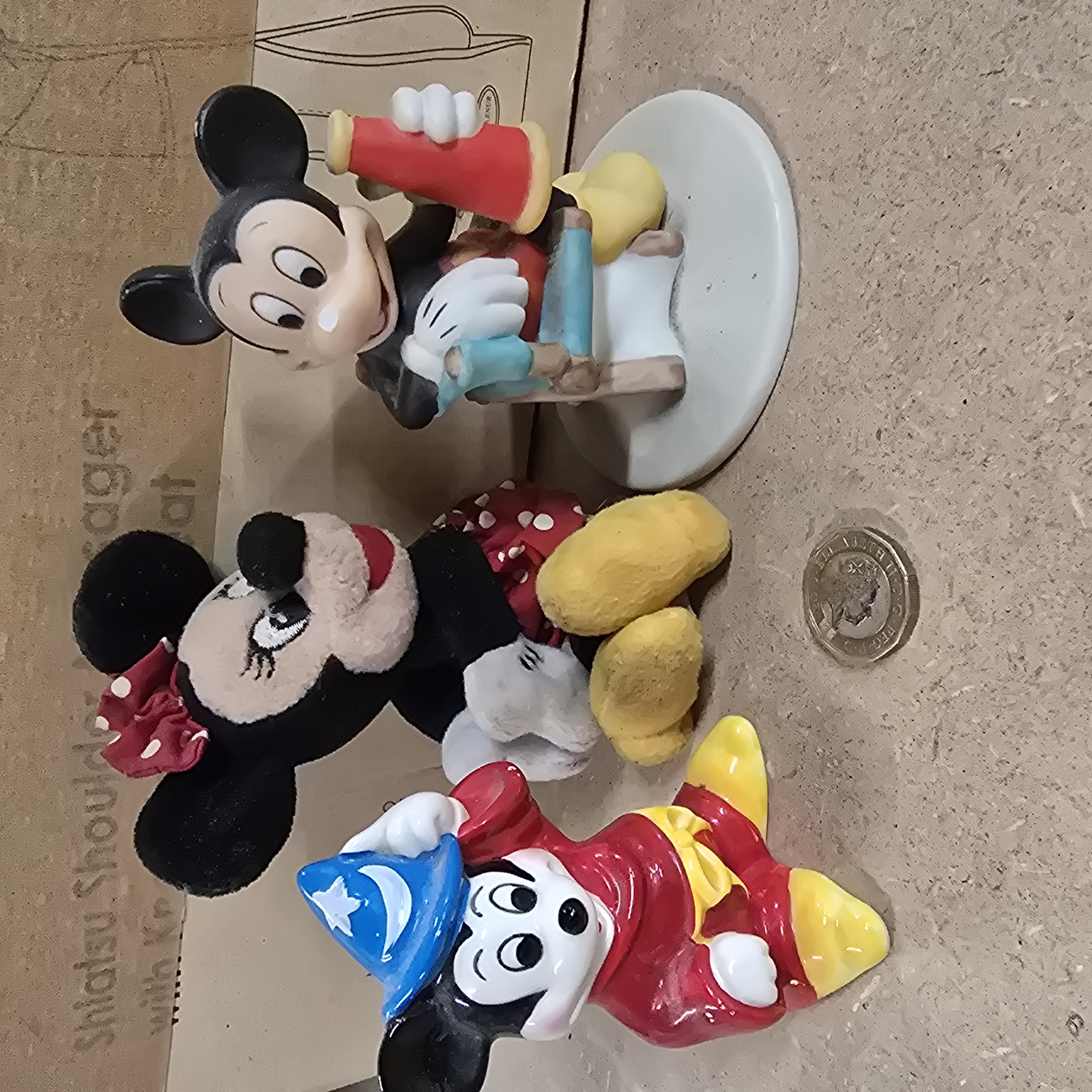 This lot comprises three Disney-themed collectible items. The first is a glazed ceramic figurine depicting Mickey Mouse in his role as the Sorcerer’s Apprentice from the film Fantasia, featuring his signature red robe and blue celestial hat. The unglazed underside bears the mark Disney Japan. The second item is a matt-finished bisque porcelain figurine of Mickey Mouse portrayed as a film director, seated on a stool and holding a megaphone. The base of this piece is marked Disney Sri Lanka. The third item is a Minnie Mouse plush toy dressed in a classic red and white polka-dot outfit. The fabric tush tag identifies it as official Walt Disney World merchandise produced for Walt Disney Attractions and manufactured in China. A UK one-pound coin is included in the images for scale.