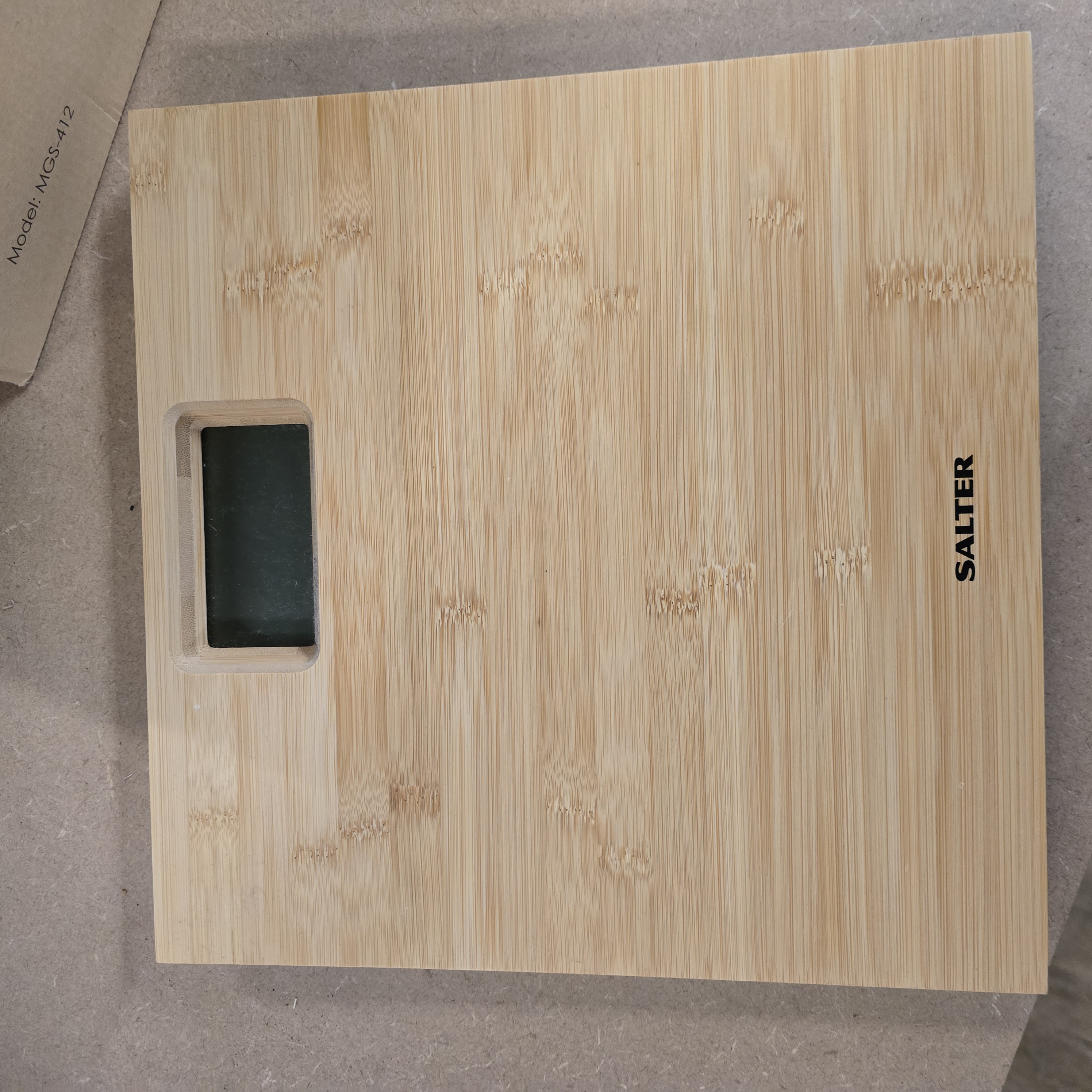 A modern digital personal weighing scale by Salter, model MGS-412. The scale features a square platform with a natural bamboo-veneer finish and a recessed digital display window on the left. The name SALTER is printed in black capital letters on the right side of the platform. The item is accompanied by part of its original cardboard box which is marked with the model number MGS-412.