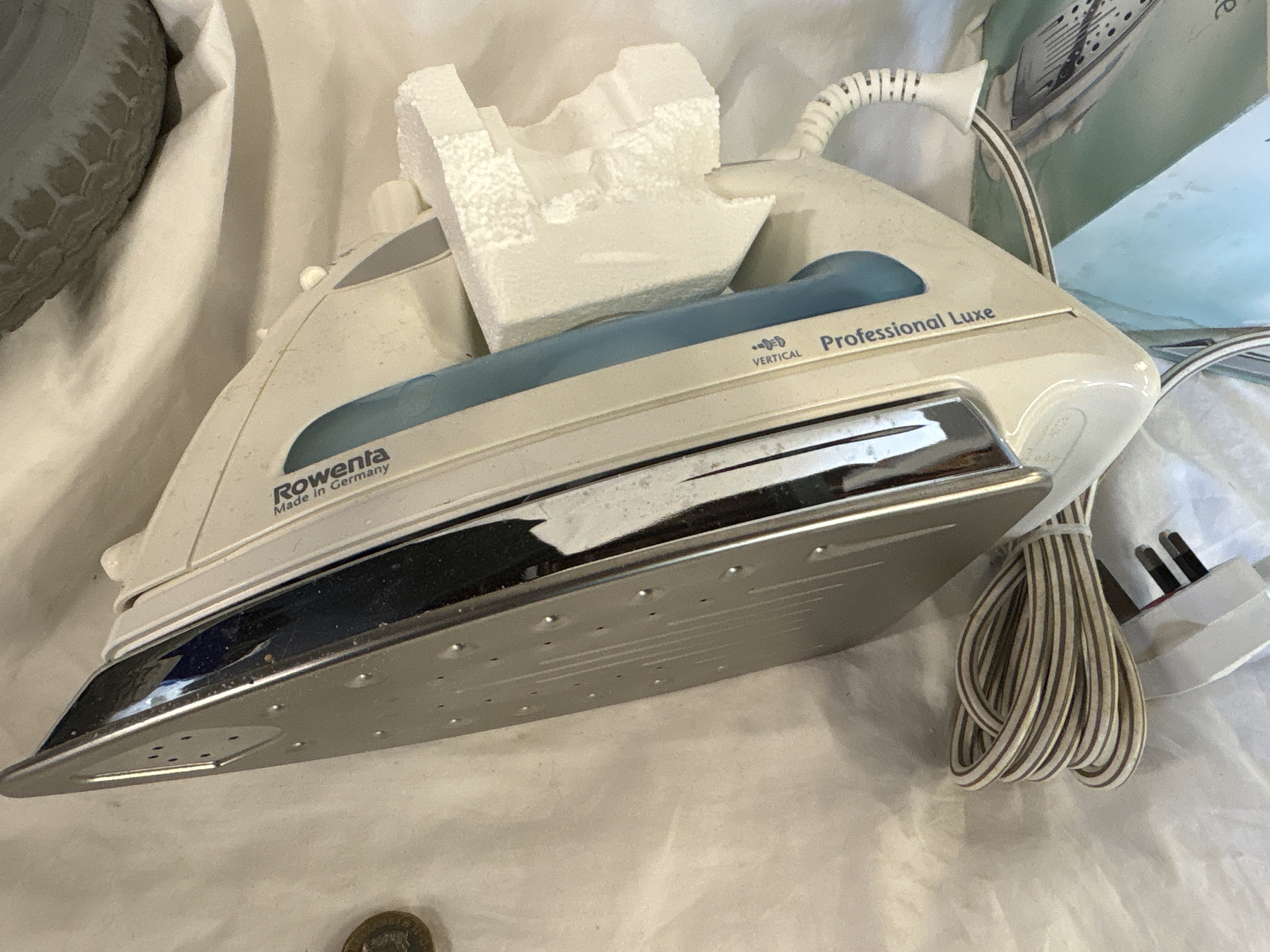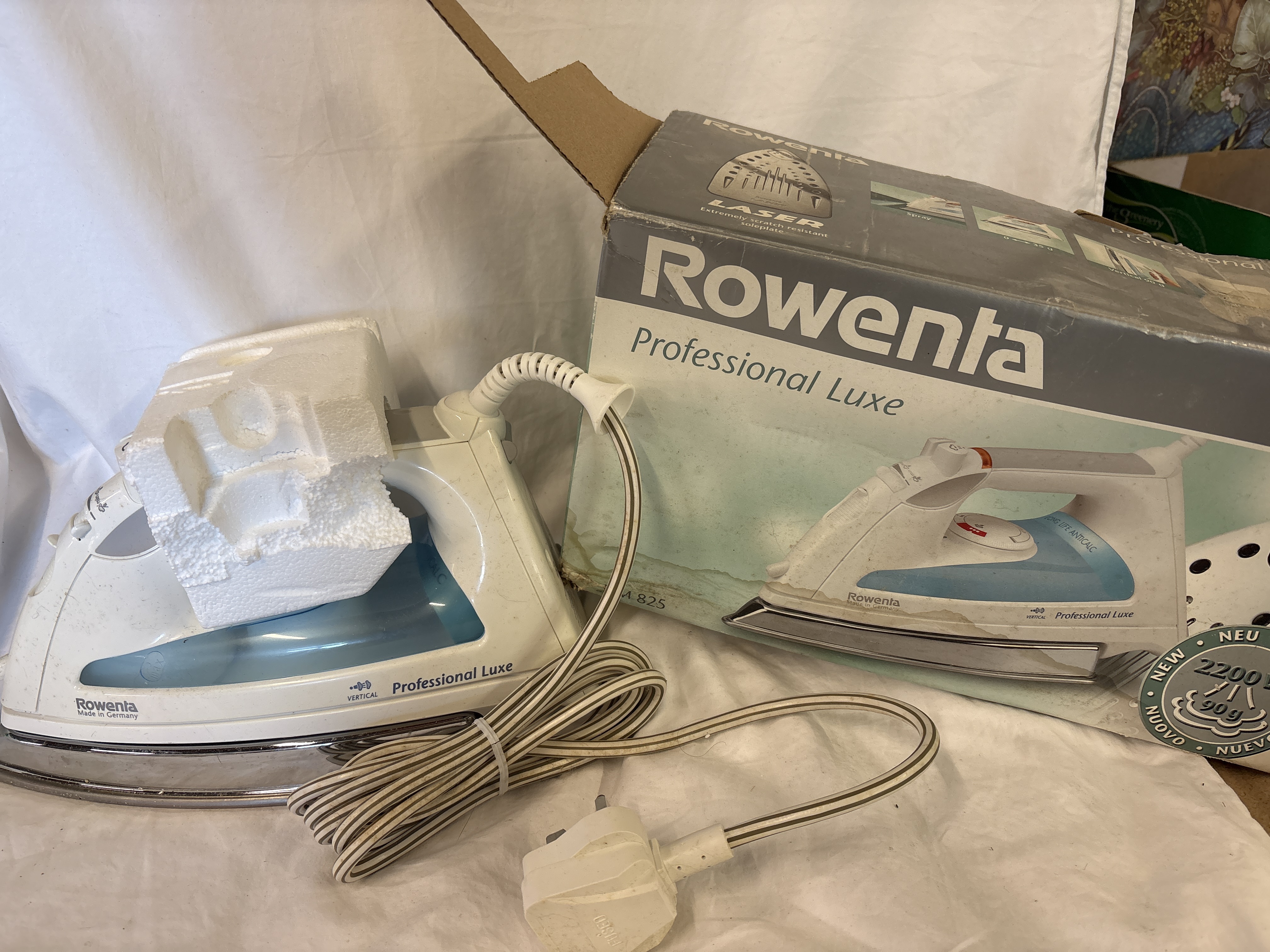 A Rowenta Professional Luxe steam iron, model DA 825. This 2200W appliance is marked Made in Germany and features a 90g steam output with a Laser scratch-resistant soleplate and vertical steam functionality. The unit is fitted with a standard UK 3-pin plug and is accompanied by its original retail box and internal polystyrene packaging.