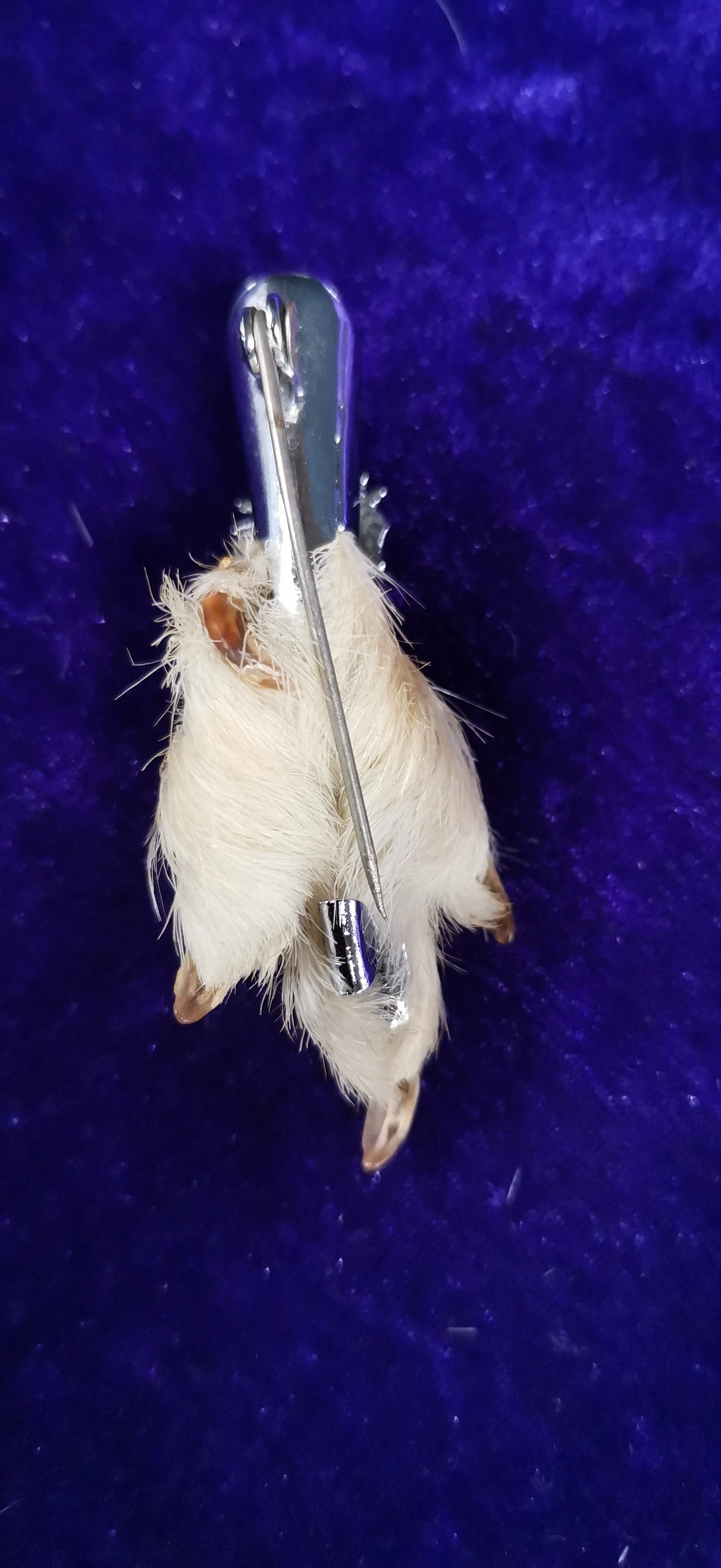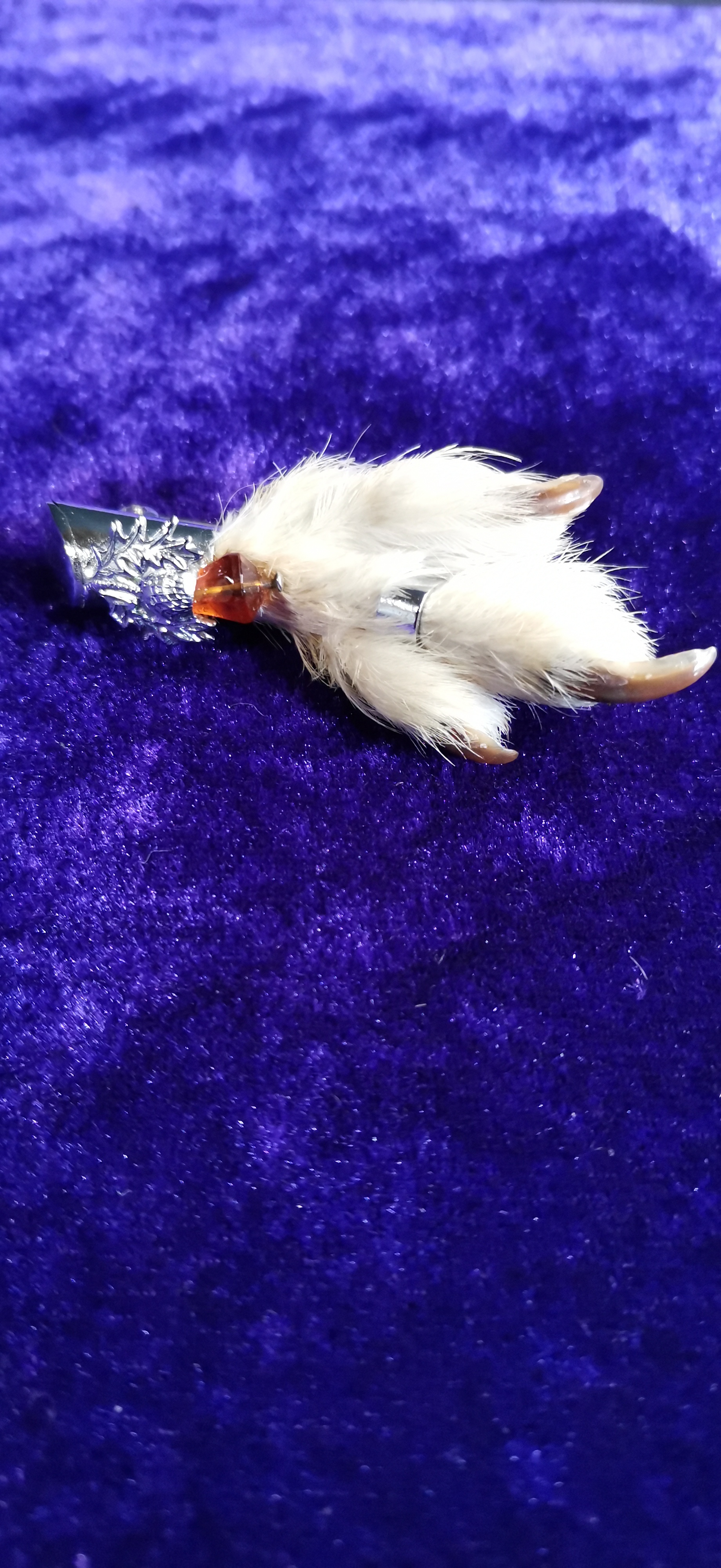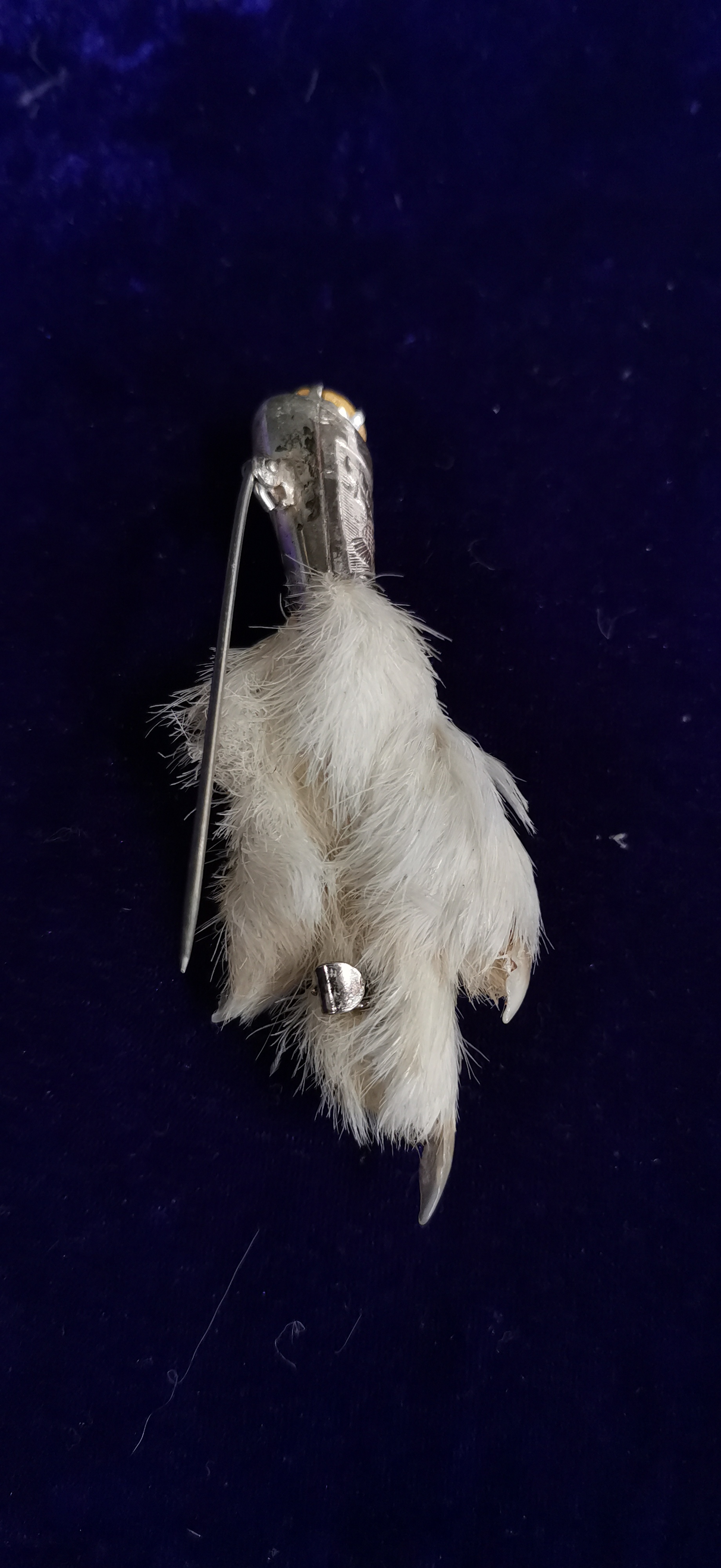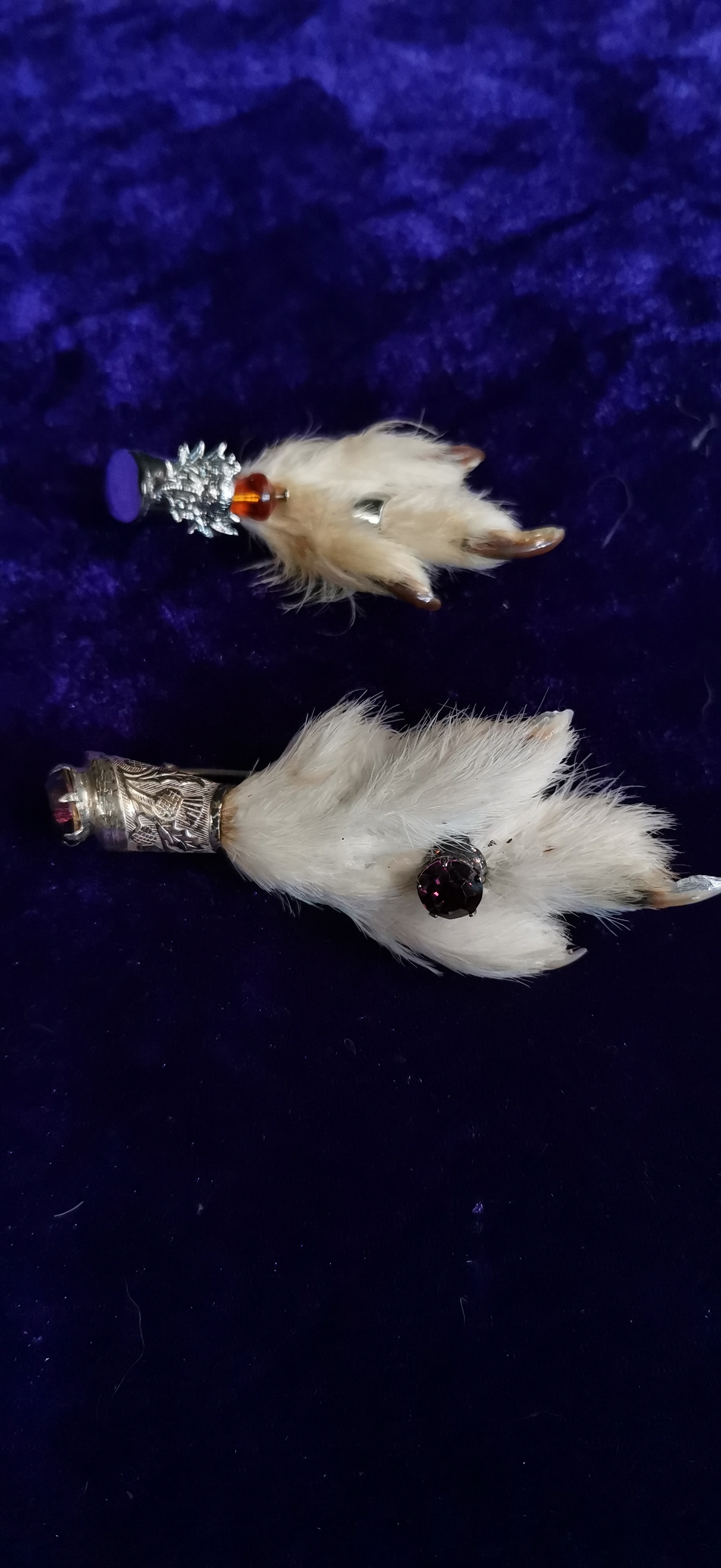 This lot consists of two traditional Scottish grouse foot brooches, typically worn as kilt pins or sporting accessories. The larger brooch features a preserved bird foot with white plumage, set into a white metal mount with hand-bright-cut thistle and foliage engraving. This mount is set with two faceted purple stones, one at the terminal and one claw-set into the foot. Stamped marks are present on the reverse but are worn and illegible. The smaller brooch features a foot with mottled brown and white plumage, set into a cast white metal mount with a thistle motif and a single faceted orange-brown stone. Both brooches are fitted with long white metal pins and simple C-clasps.