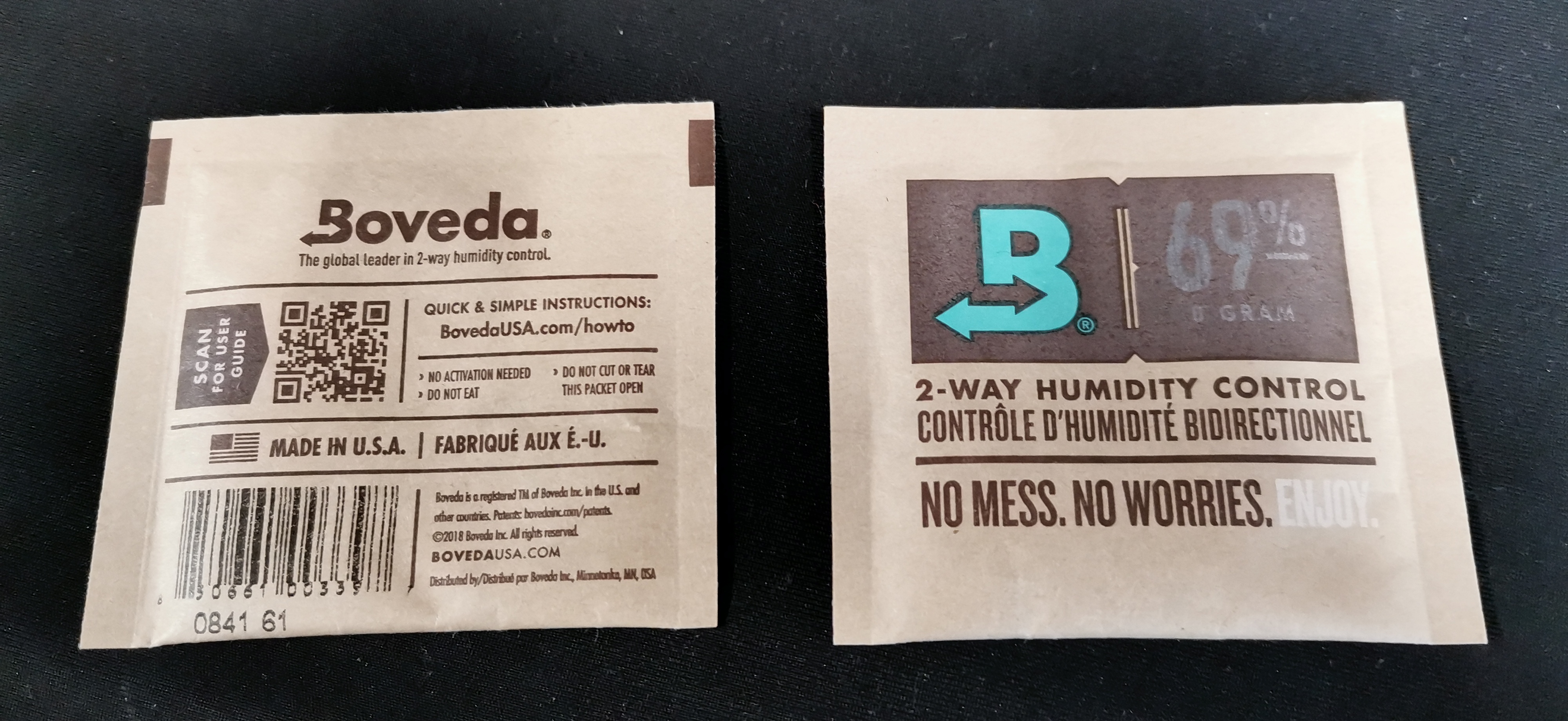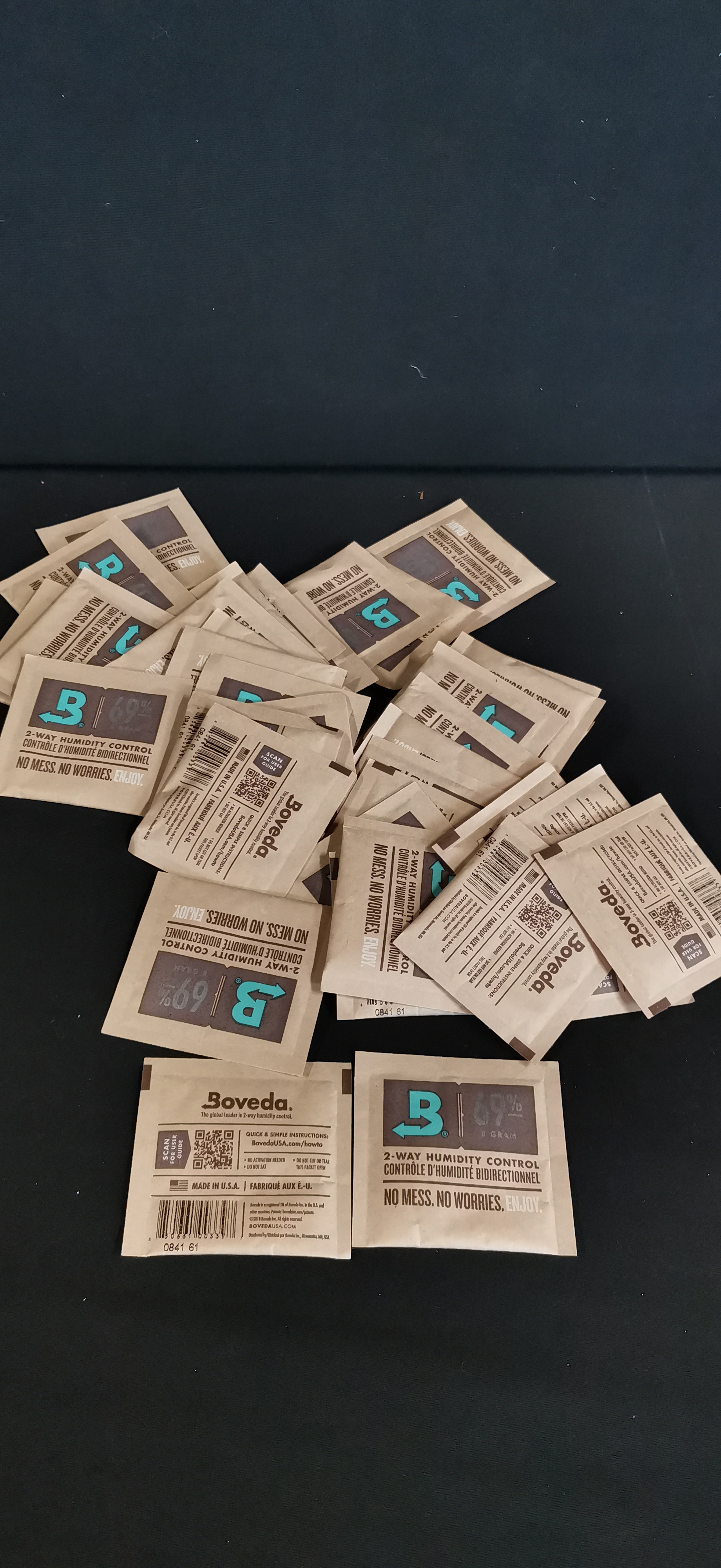 A collection of 40 Boveda brand 2-way humidity control packets. Each packet is designed to maintain a constant relative humidity of 69 percent. The packets are constructed with a semi-permeable membrane and feature the Boveda logo in teal alongside a brown field containing the 69 percent designation. Printed text on the front includes 2-WAY HUMIDITY CONTROL and the French translation CONTRÔLE D’HUMIDITÉ BIDIRECTIONNEL. The reverse of each packet includes instructions for use, a QR code, and a barcode numbered 8 50661 00339 5 with the secondary number 0841 61. These items are marked as manufactured in the USA.