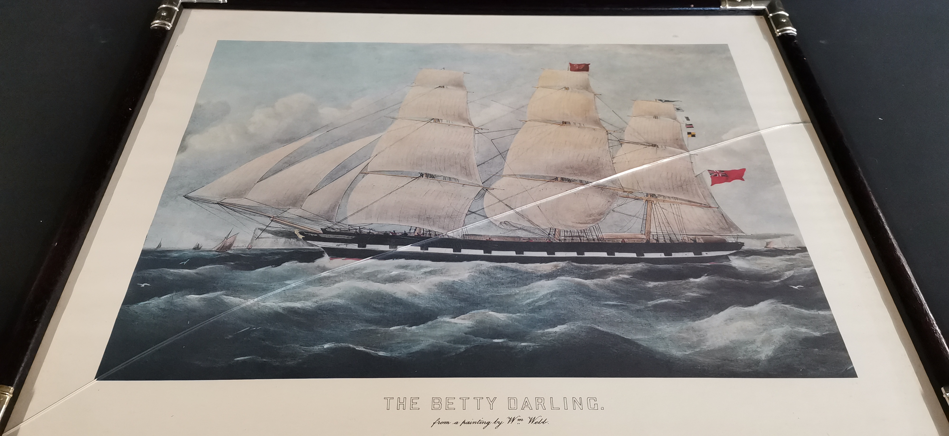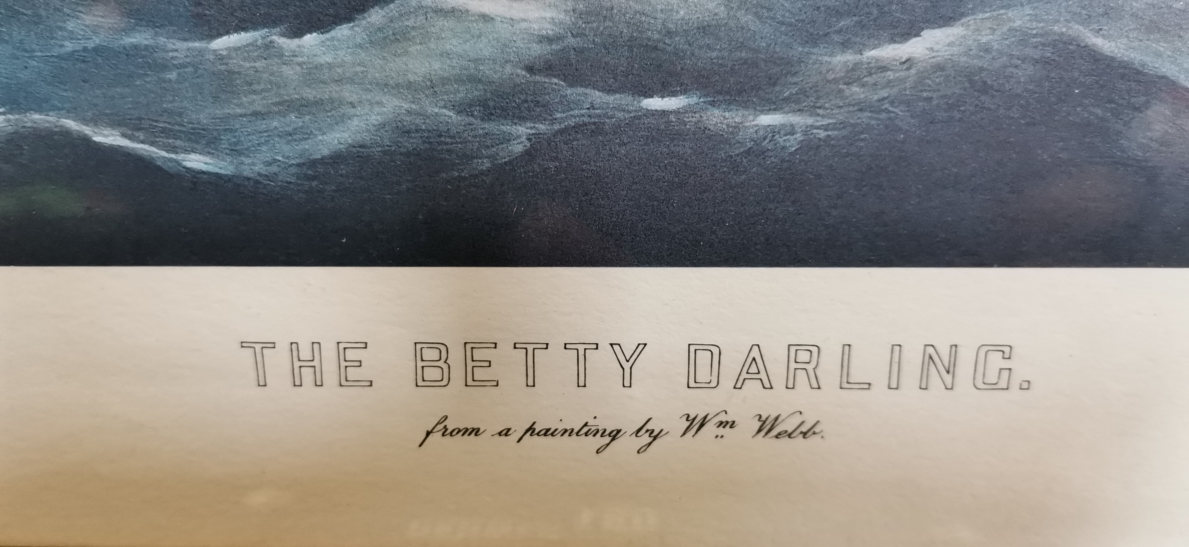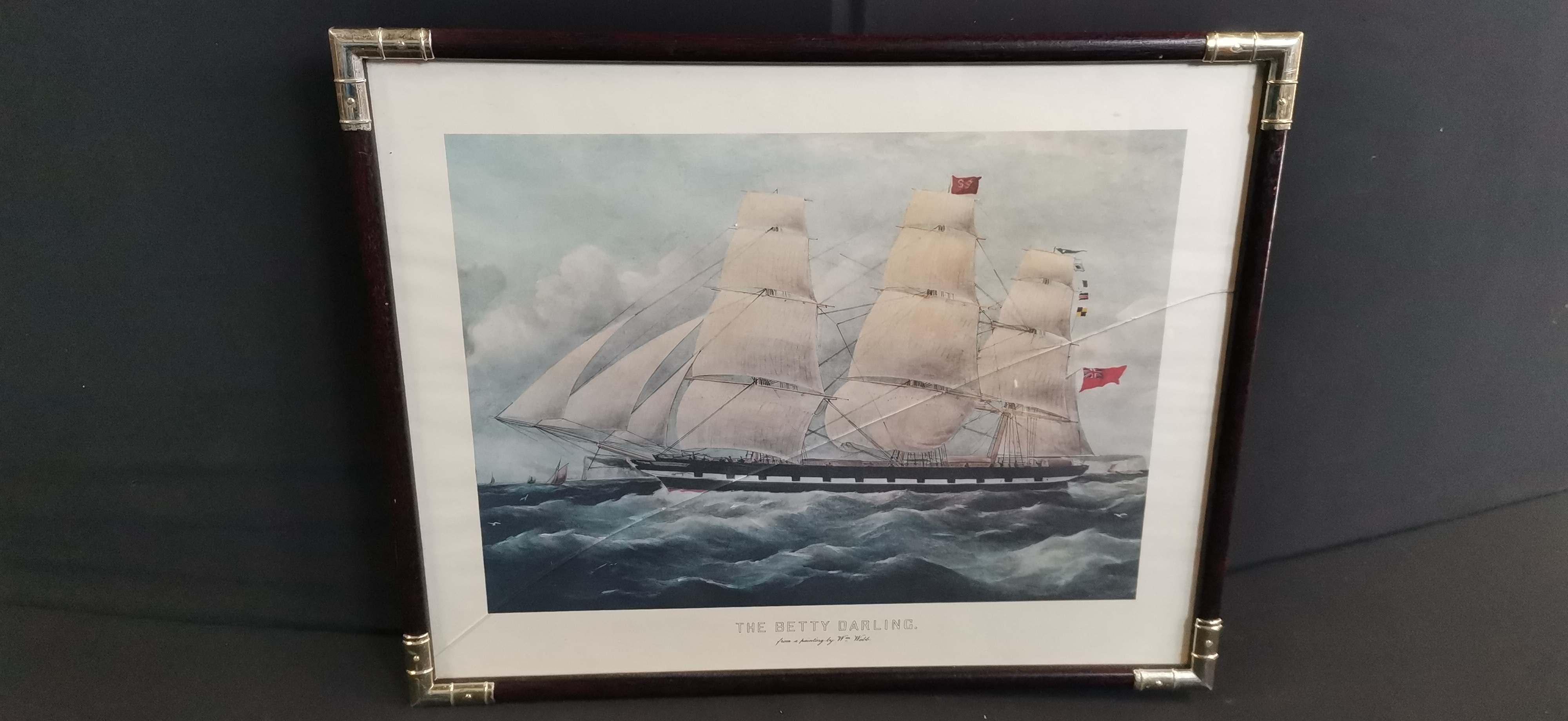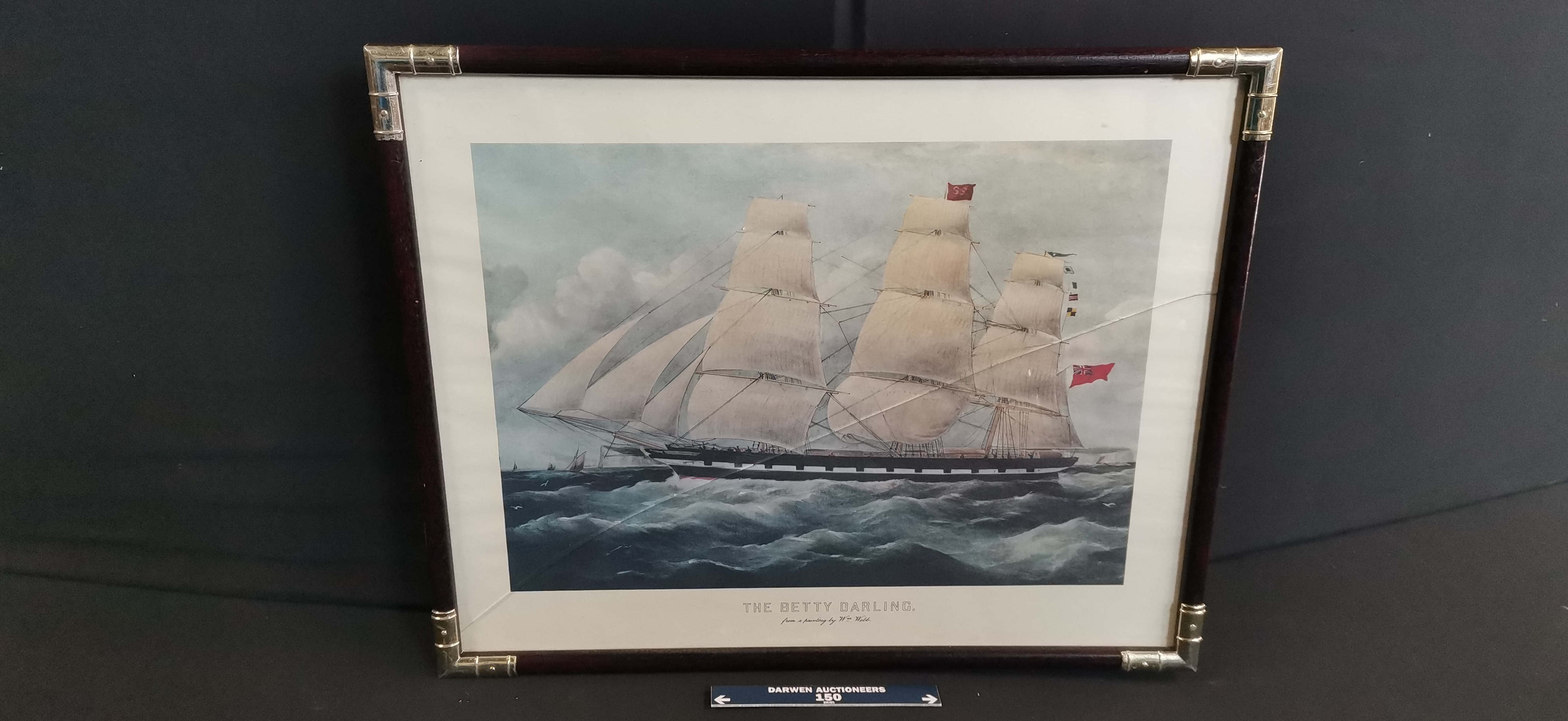 A photomechanical reproduction print, after an original painting by William Webb, titled The Betty Darling. The composition features a three-masted sailing ship in full sail traversing a choppy sea under a cloudy sky. The vessel is depicted flying a Red Ensign and multiple signal flags. The lower margin bears the printed title THE BETTY DARLING. followed by the attribution from a painting by Wm. Webb. The print is presented within a mount and housed in a dark-stained wood frame with polished white-metal corner brackets. No hand-signature, edition number, or publisher marks are visible.