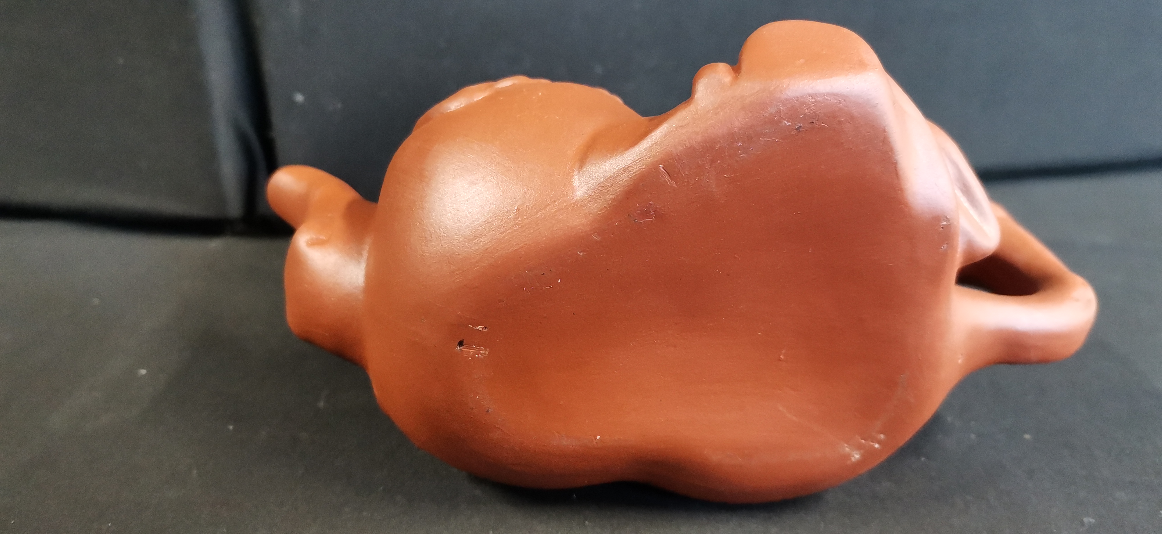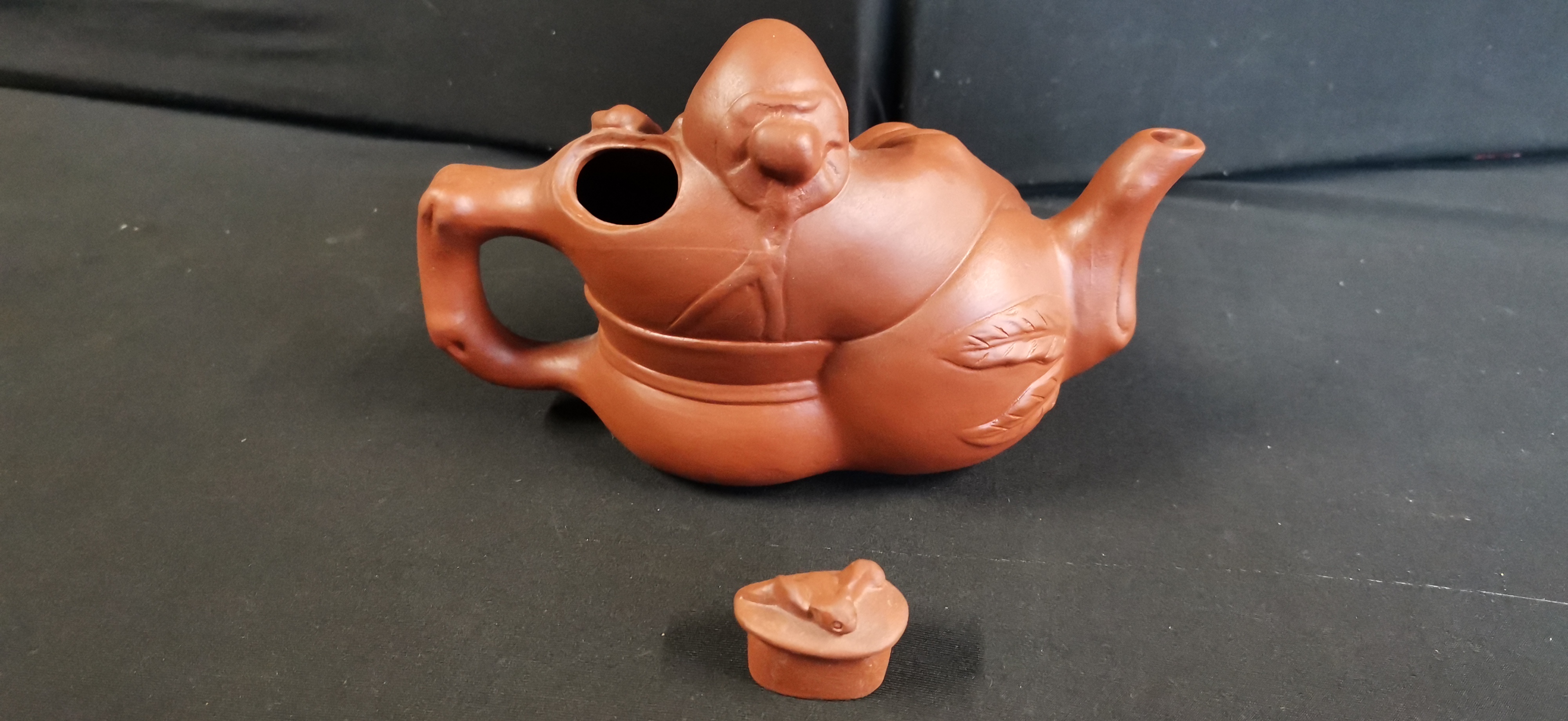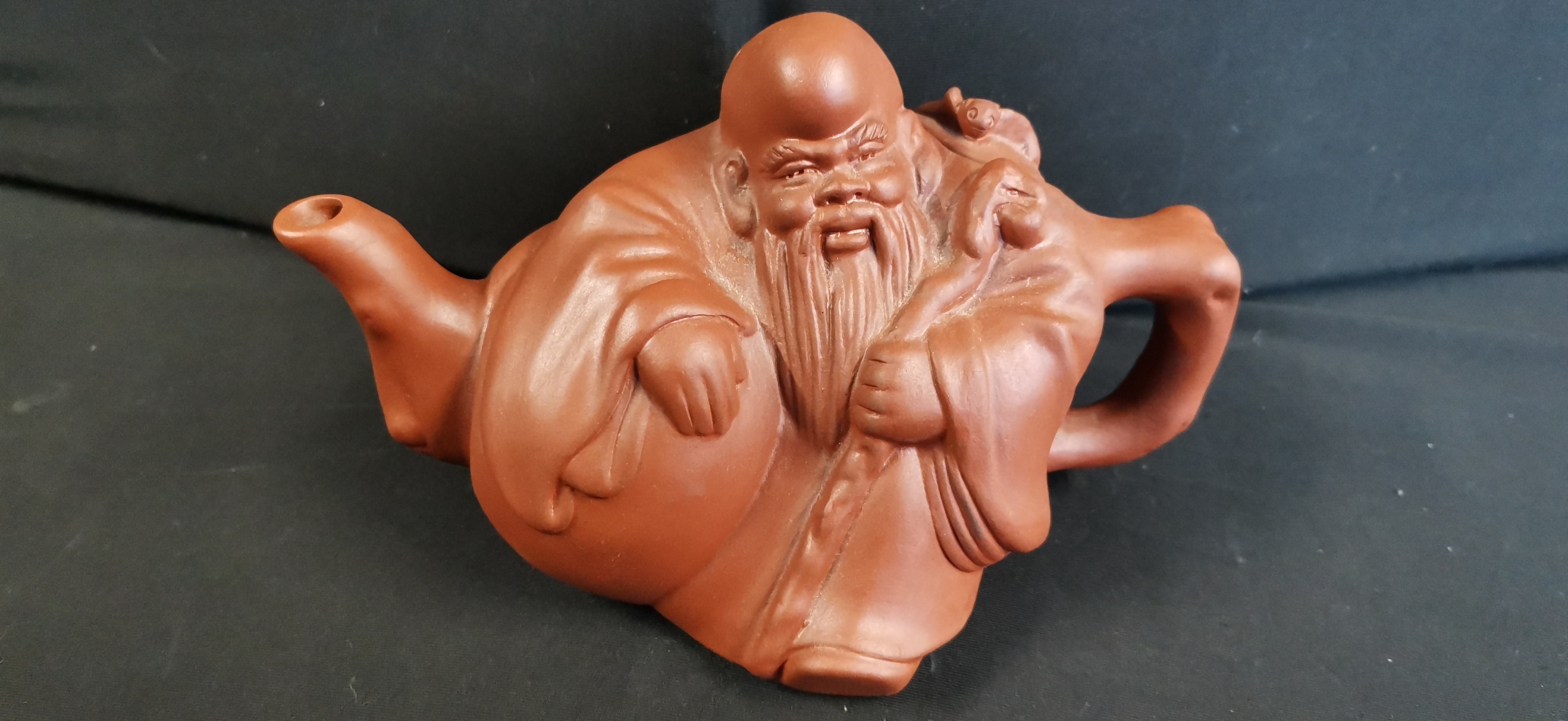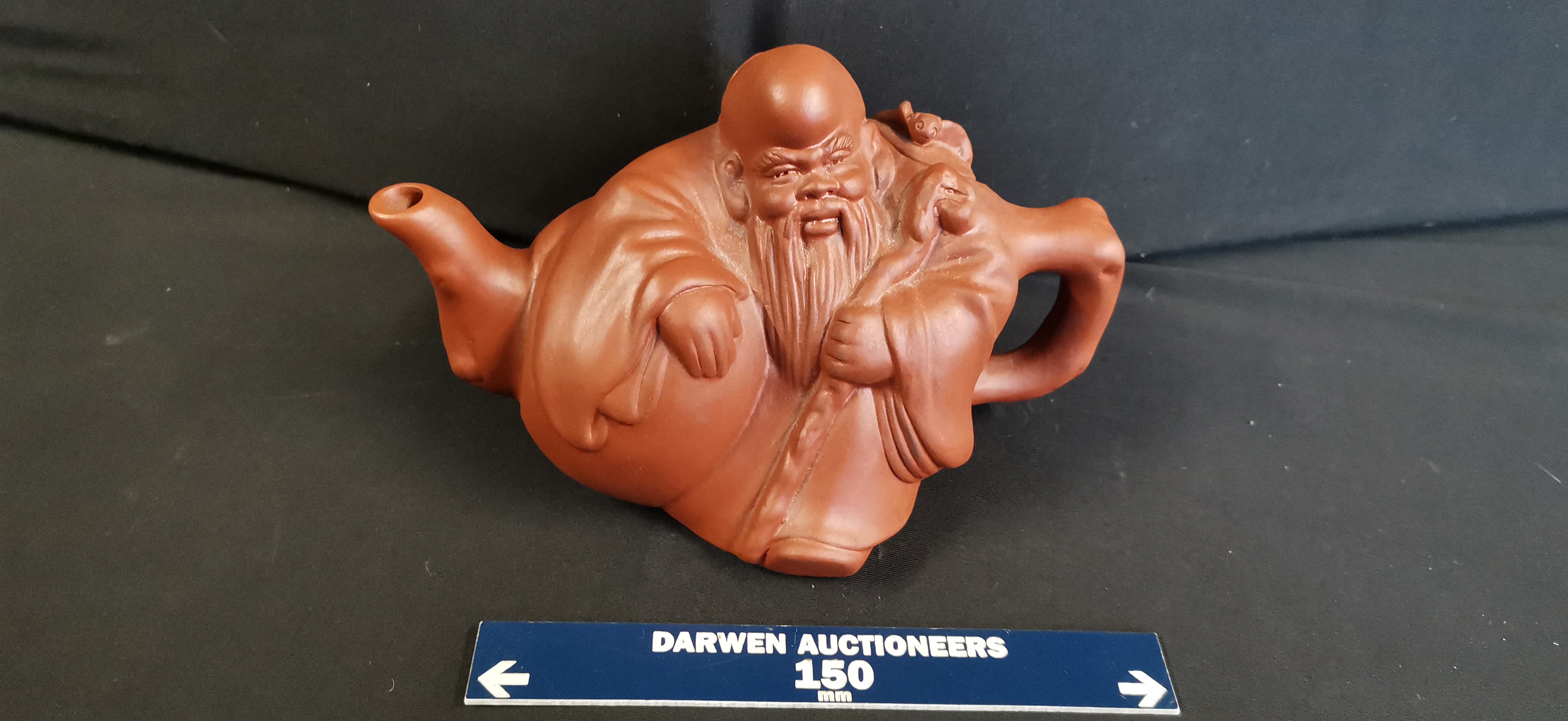 A Chinese figural teapot constructed from unglazed reddish-brown zisha clay. The vessel is sculpted in the form of Shoulao, the God of Longevity, featuring a high forehead and long flowing beard. The body of the teapot is integrated into the form of a large peach, a traditional symbol of immortality. The handle is designed as a rustic branch, while the spout extends from the side of the figure. A small animal figure is positioned on the staff held by the main figure. The removable lid is situated on the back of the deity. No maker’s marks or reign marks are visible on the base.