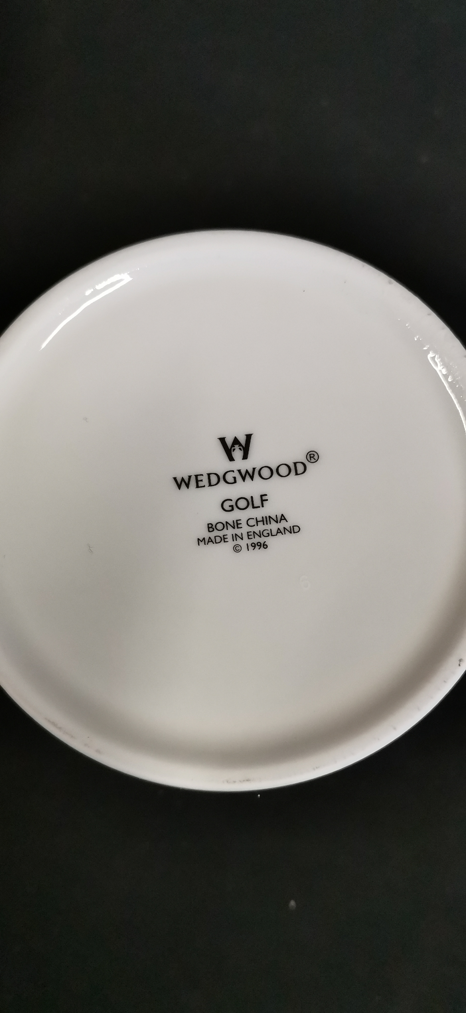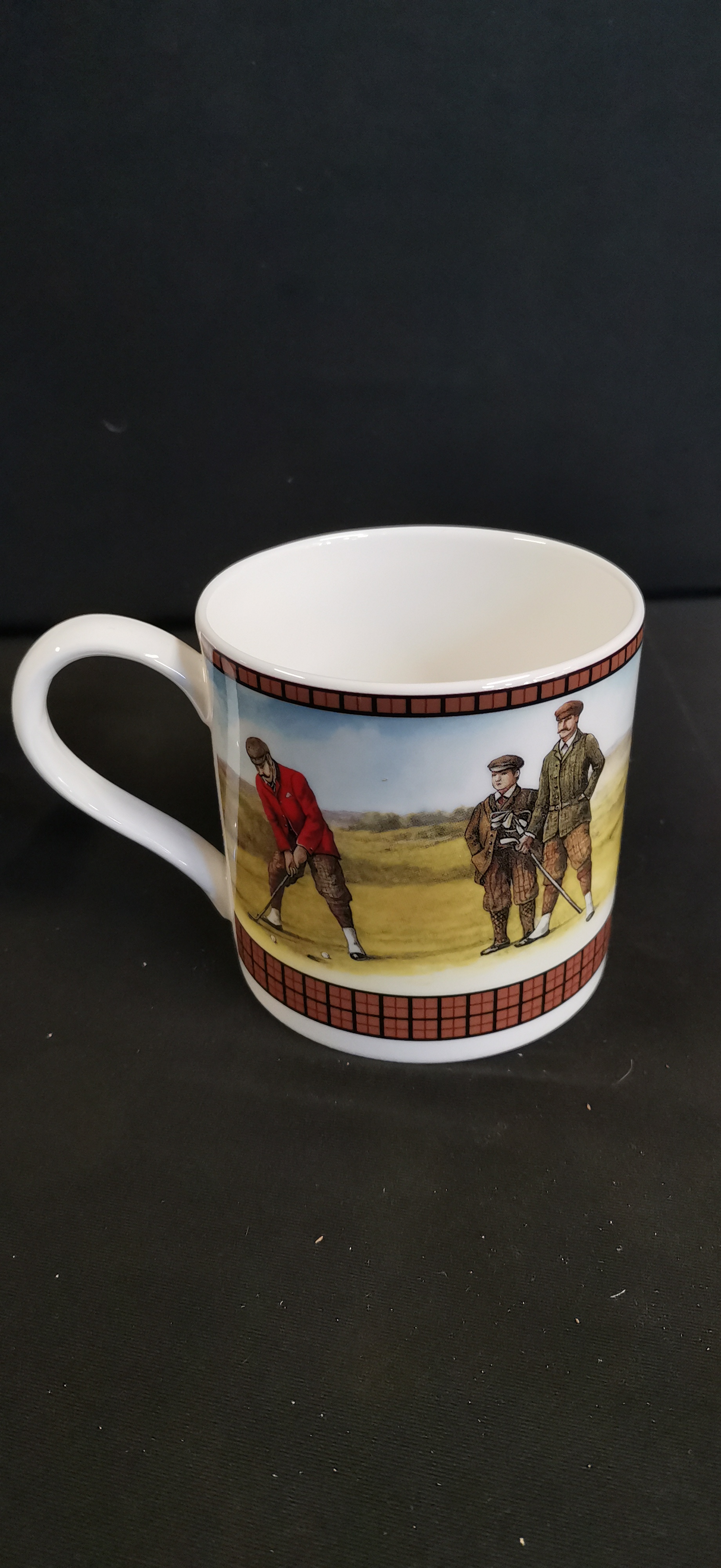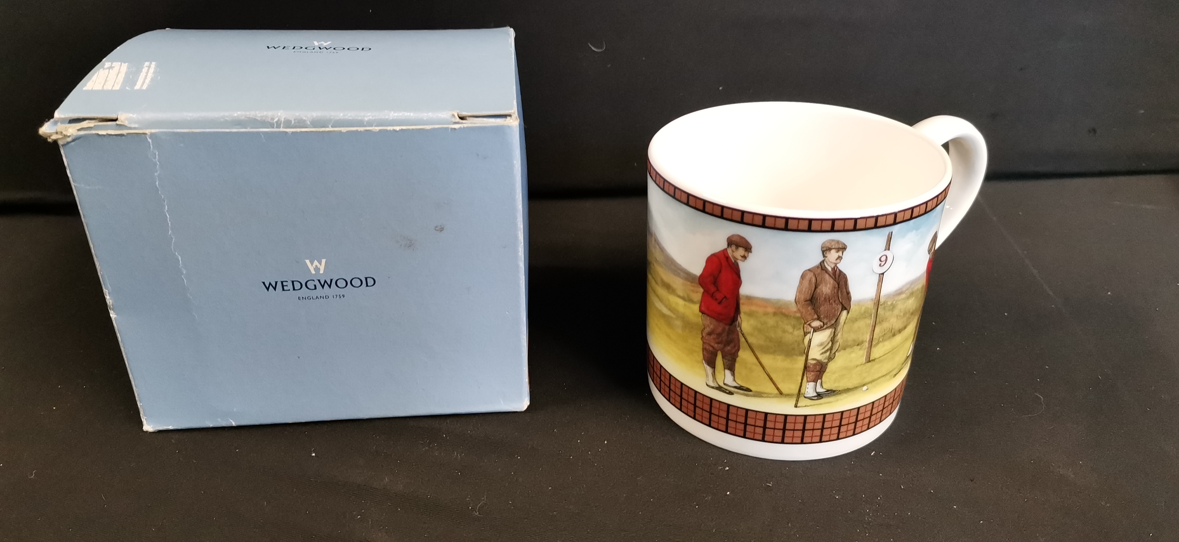A Wedgwood bone china mug from the Golf series, manufactured in England in 1996. The cylindrical form features a plain loop handle and wrap-around transfer-printed decoration. The scenes depict golfers in traditional early 20th-century dress, including flat caps, jackets, and knickerbockers, set within a links landscape. A flagstick marked with the number 9 is visible in one scene. The central pictorial band is bordered at the top and bottom by a brown and black chequered pattern. The base is marked with a black printed factory stamp including the stylised W logo, Wedgwood, Golf, Bone China, Made in England, and the copyright date 1996. The mug is accompanied by its original blue card presentation box.