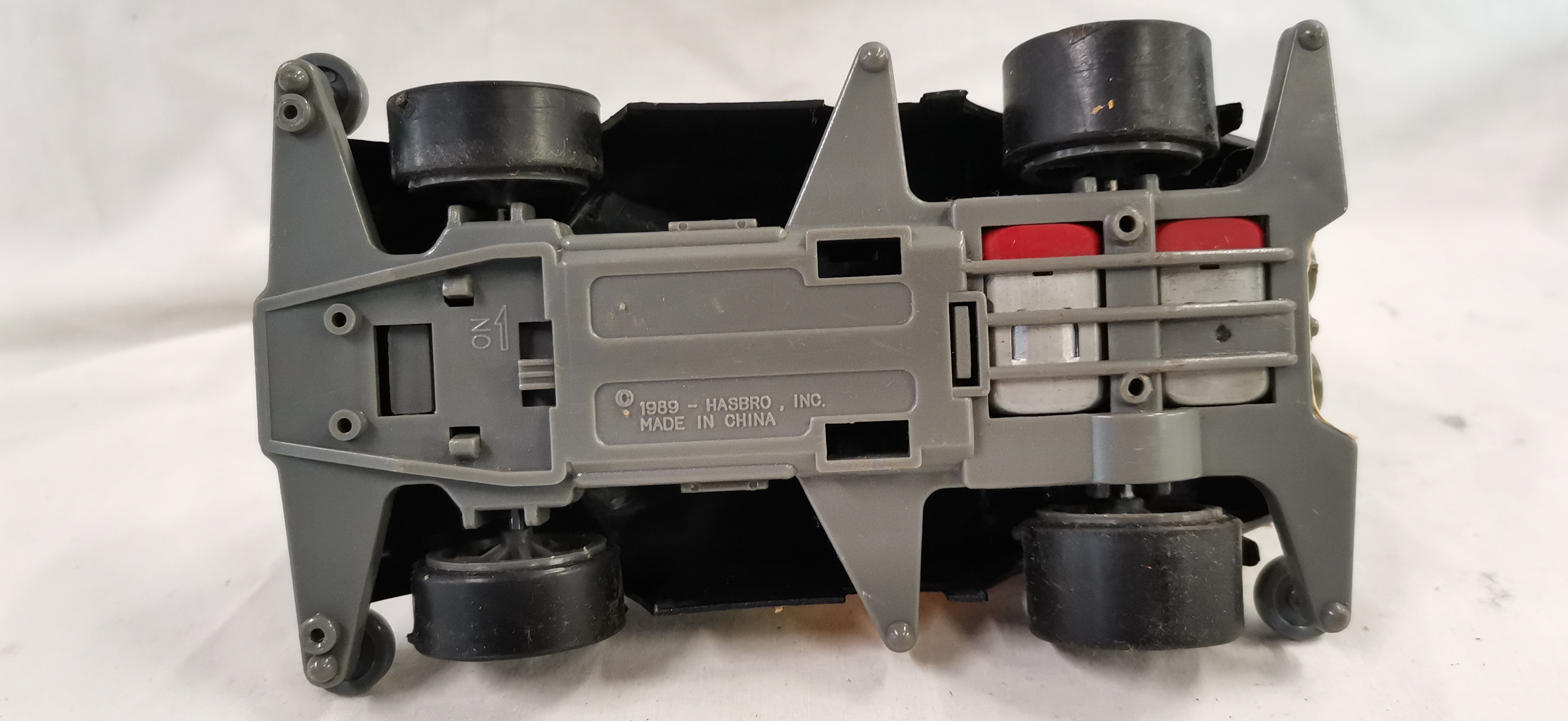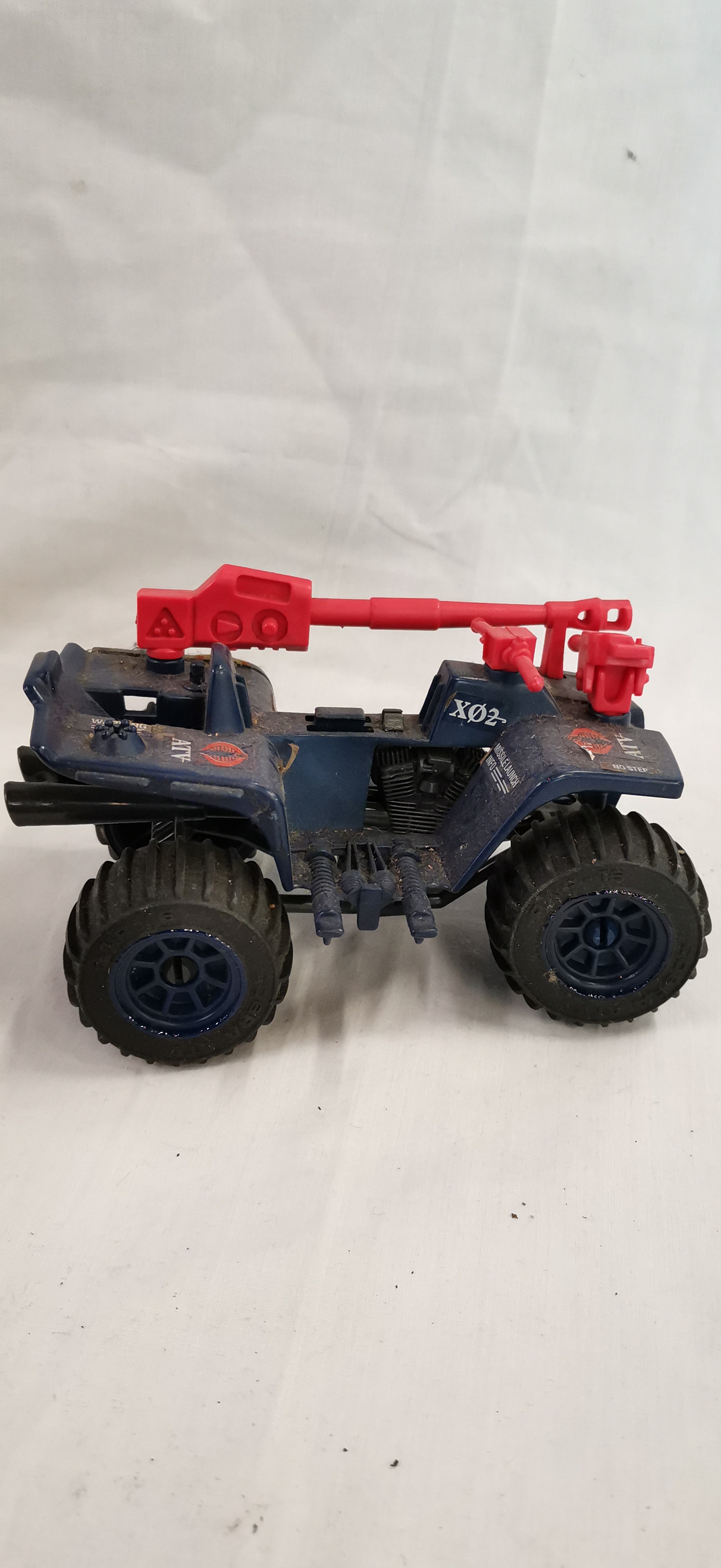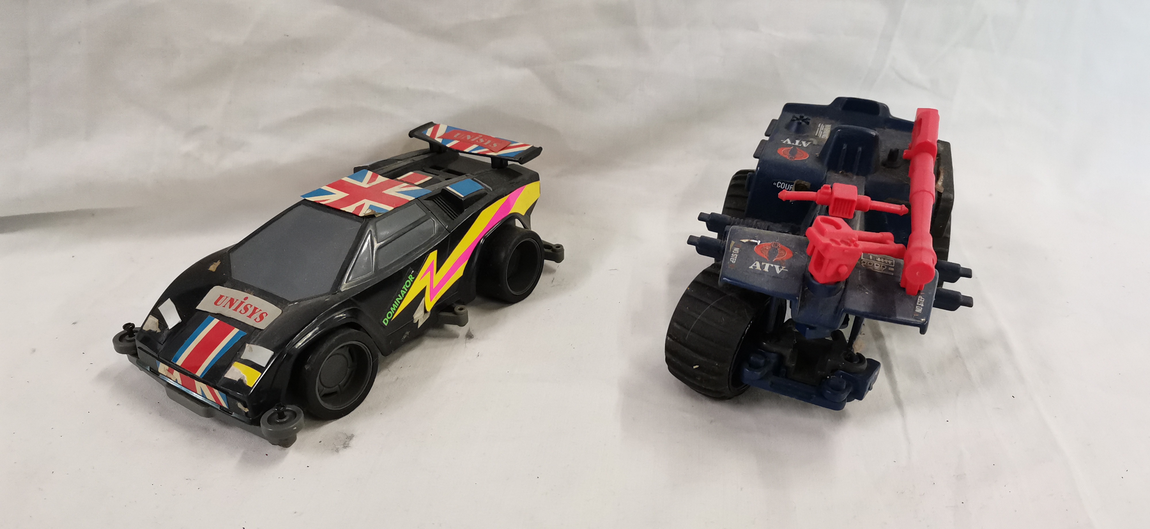 Two plastic toy vehicles comprising a 1989 Hasbro Dominator racing car with Unisys decals and a blue Cobra faction military ATV with red weapon attachments.