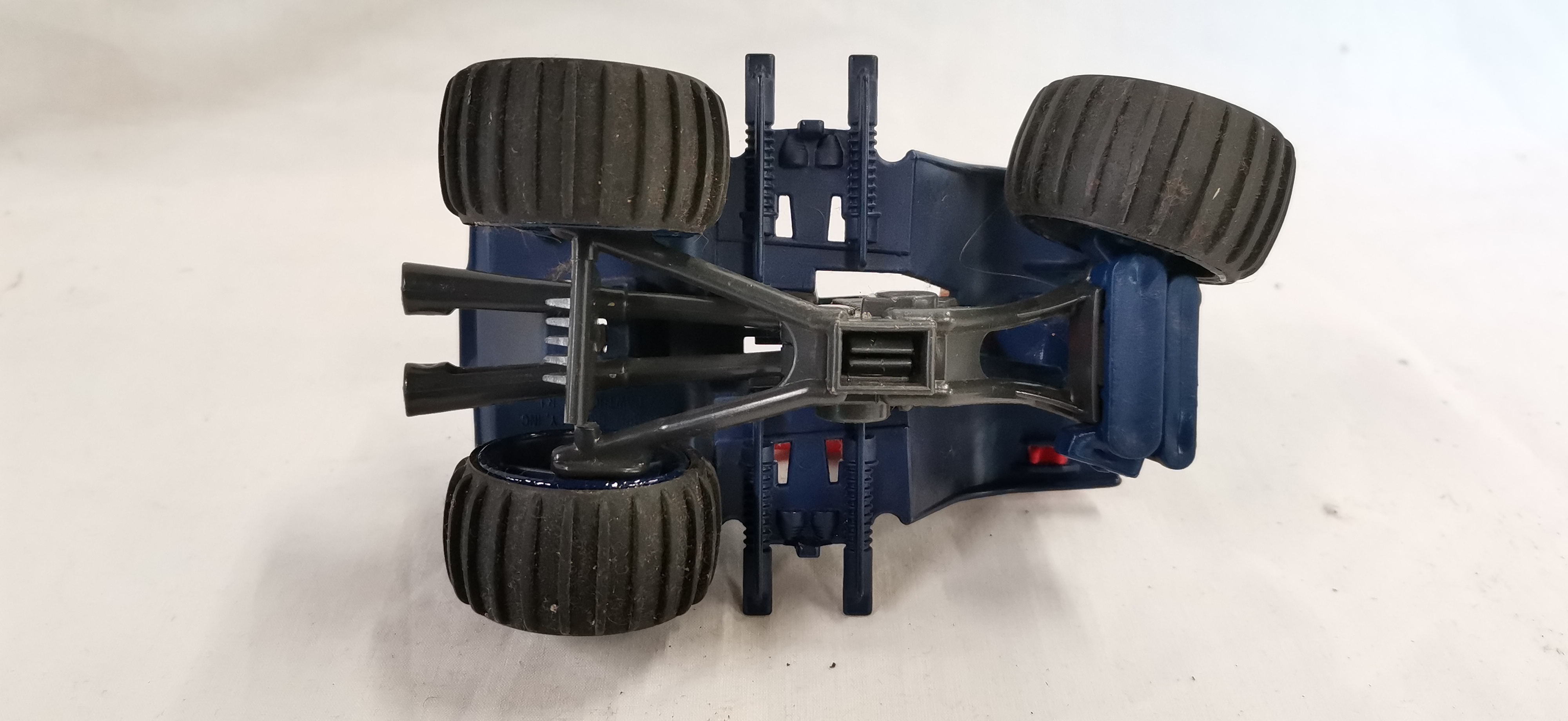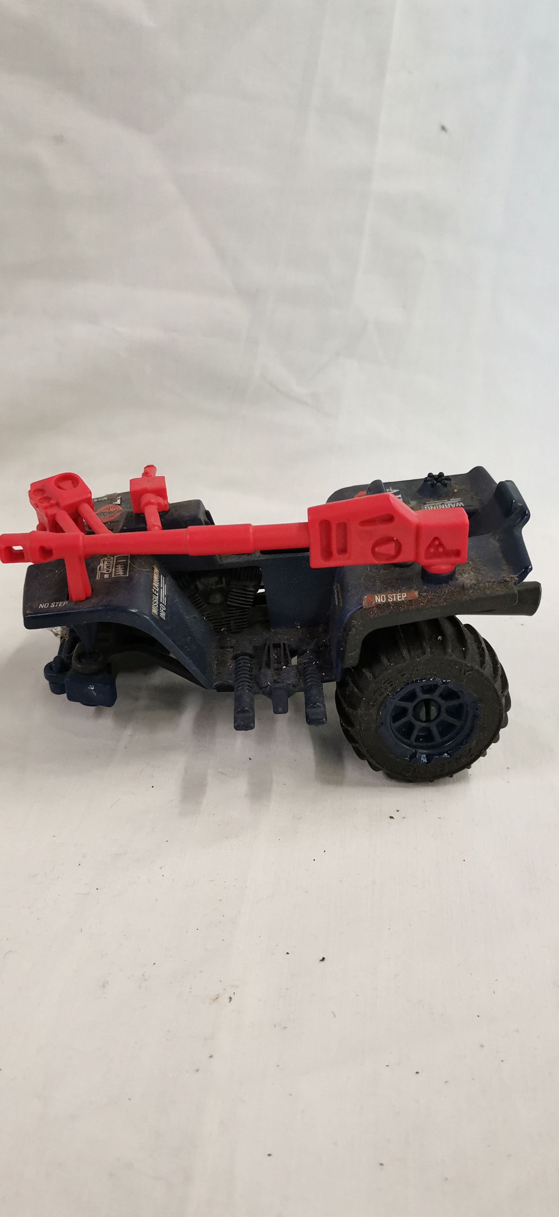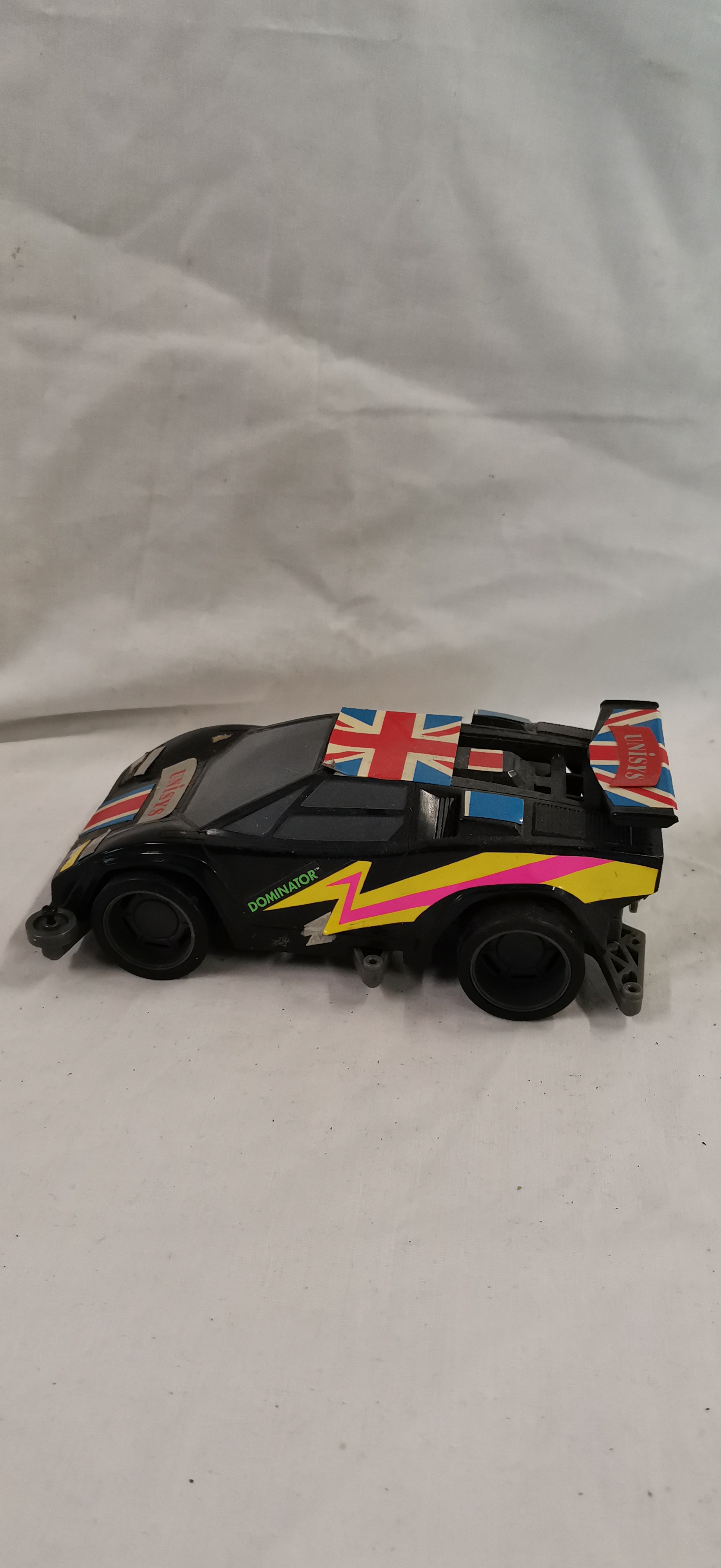 Two plastic toy vehicles comprising a 1989 Hasbro Dominator racing car with Unisys decals and a blue Cobra faction military ATV with red weapon attachments.