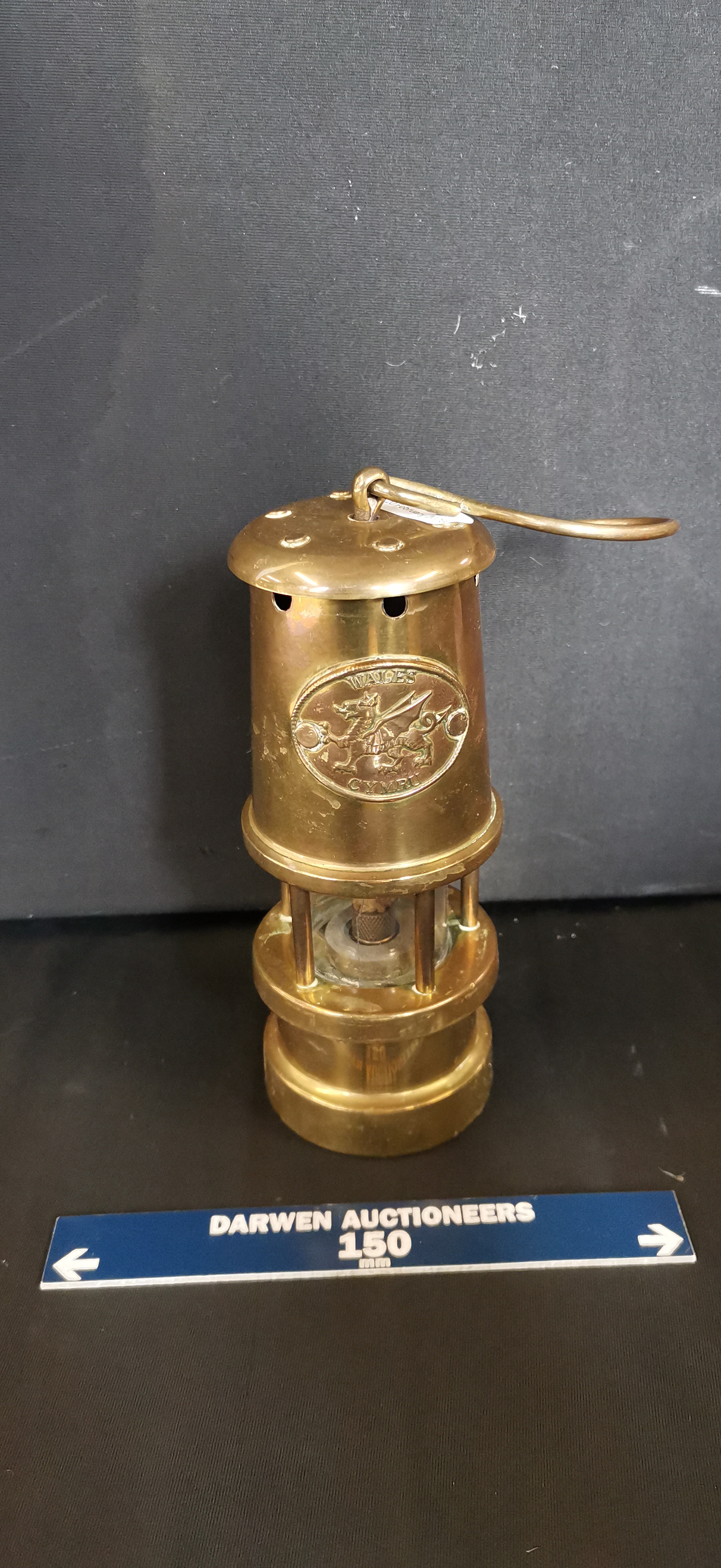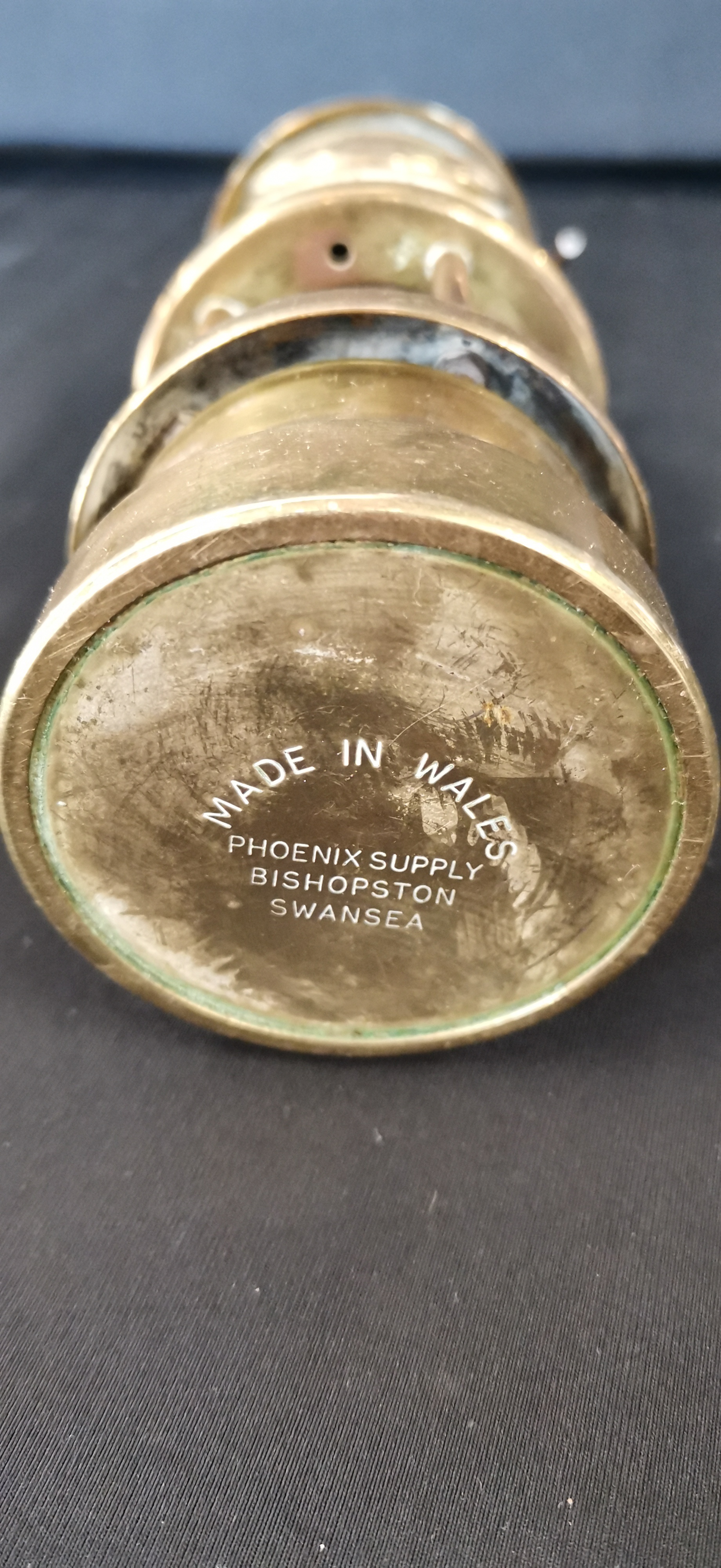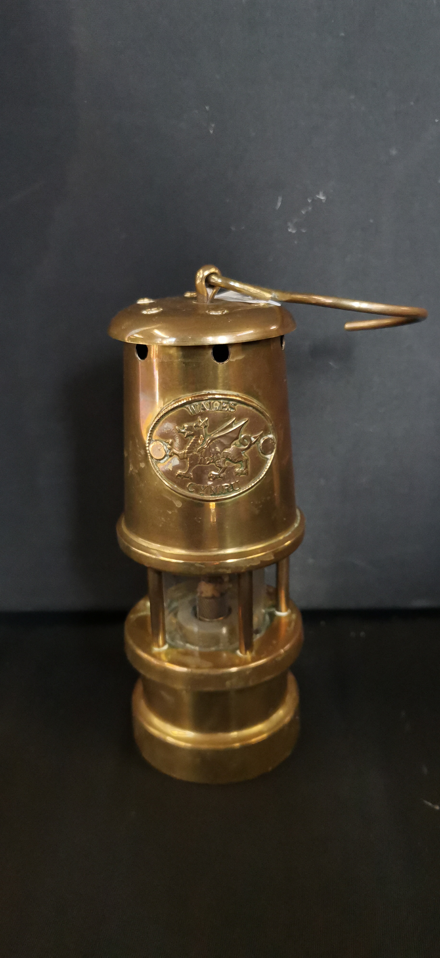 A miniature decorative miners safety lamp manufactured by Phoenix Supply of Bishopston, Swansea. The item is constructed from brass with a central cylindrical glass chimney. The upper section features an applied oval plaque embossed with a dragon and the words WALES and CYMRU. The lamp includes a screw-off base with an internal wick assembly and a brass suspension hook at the top. The base is stamped with the maker’s mark and location.