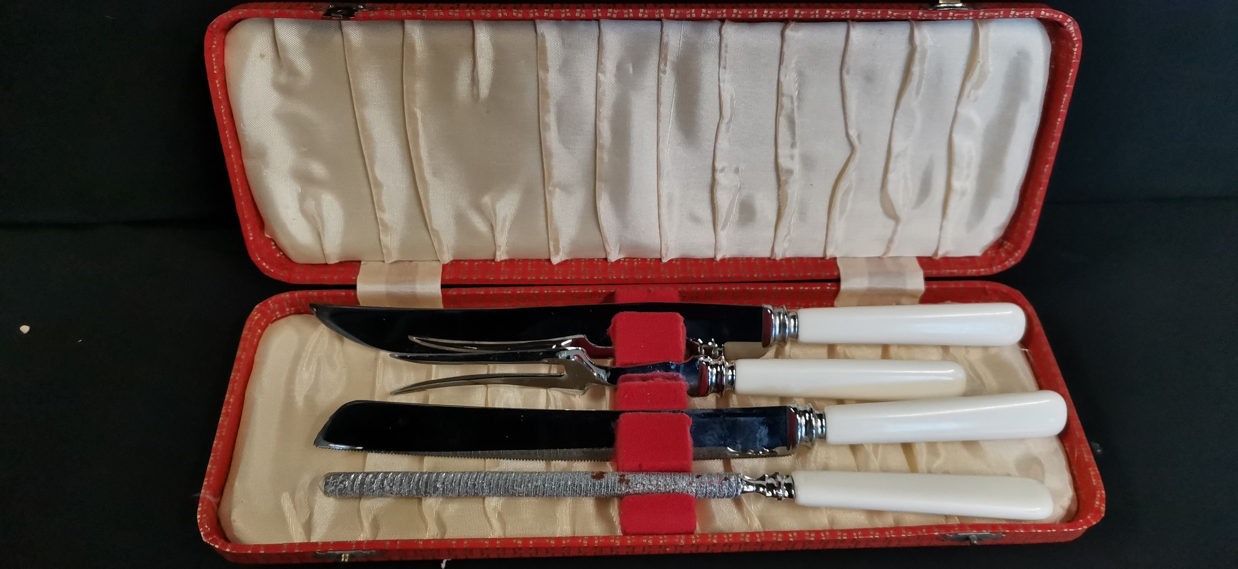 This four-piece carving set is presented in its original fitted red case. The set comprises a two-prong carving fork, a plain-edge carving knife, a serrated-edge knife, and a sharpening steel. Each piece features a tapered, cream-coloured handle, likely crafted from an early synthetic material such as celluloid, fitted with polished white metal collars. The blades and implements are made of steel. The design and presentation are consistent with the work of Hiram Wild of Sheffield, though the marks on the blades are worn and cannot be definitively read. The original red presentation box features a cream satin-lined interior with red fabric accents.