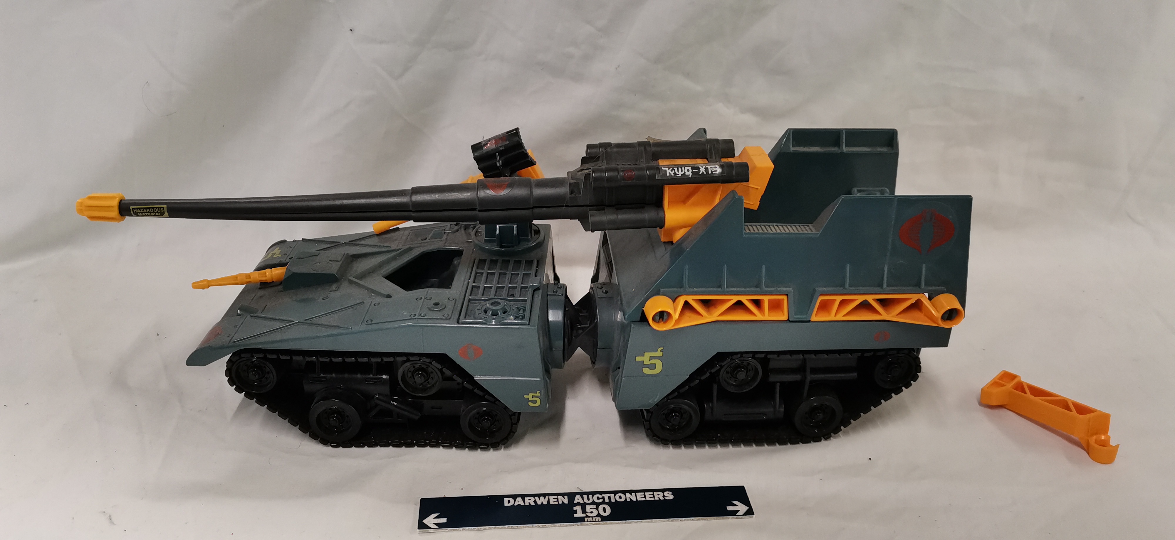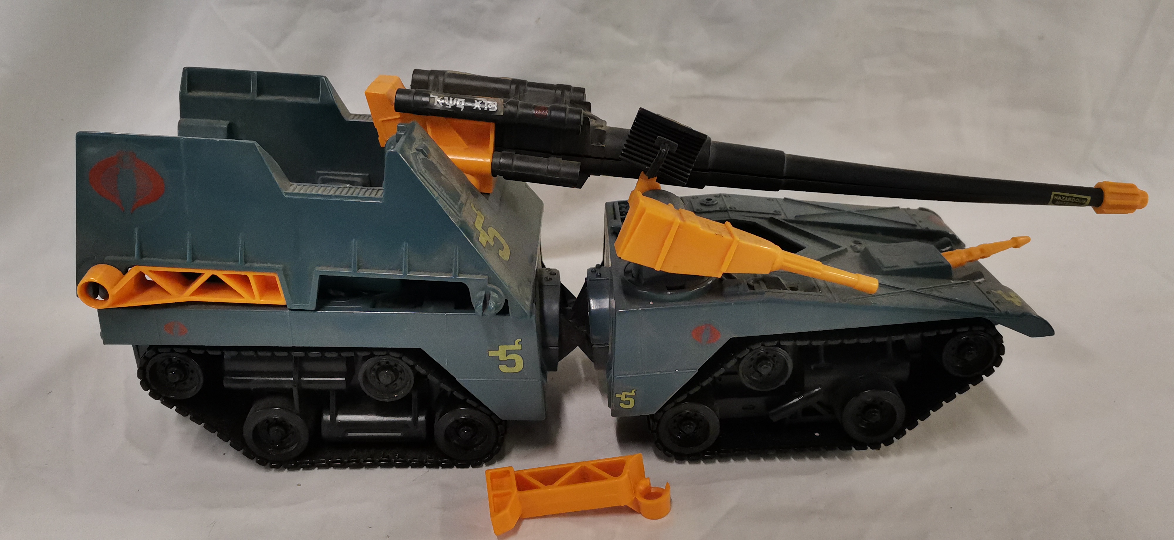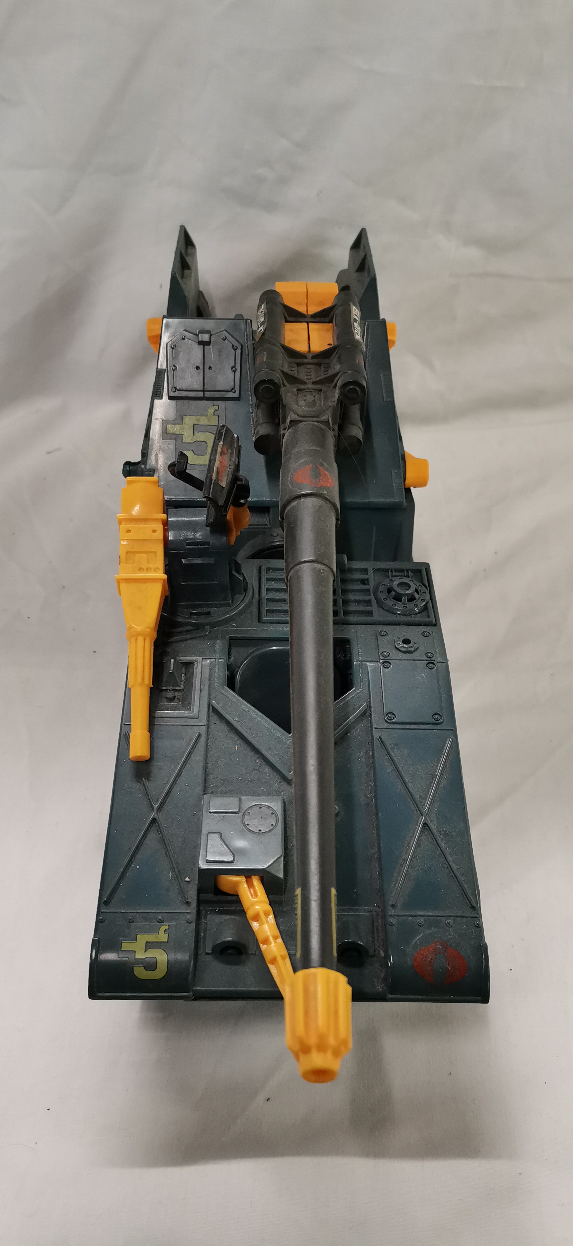 A Hasbro G.I. Joe Cobra Maggot modular battle vehicle, dated 1987. The vehicle is constructed from blue-grey plastic with contrasting orange and yellow components. This modular unit is designed to separate into three distinct sections: a front command tank, a middle radar and control section, and a rear heavy artillery platform. Features include multiple rotatable gun turrets, a long-range black main cannon, and independent track units for each section. The underside is embossed with the marks © 1987 HASBRO INC, PAWTUCKET R.I. 02862, and ALL RIGHTS RESERVED. Various decals are applied, including the Cobra insignia and the identification number 5. This model was distributed in the United Kingdom under the Action Force brand.