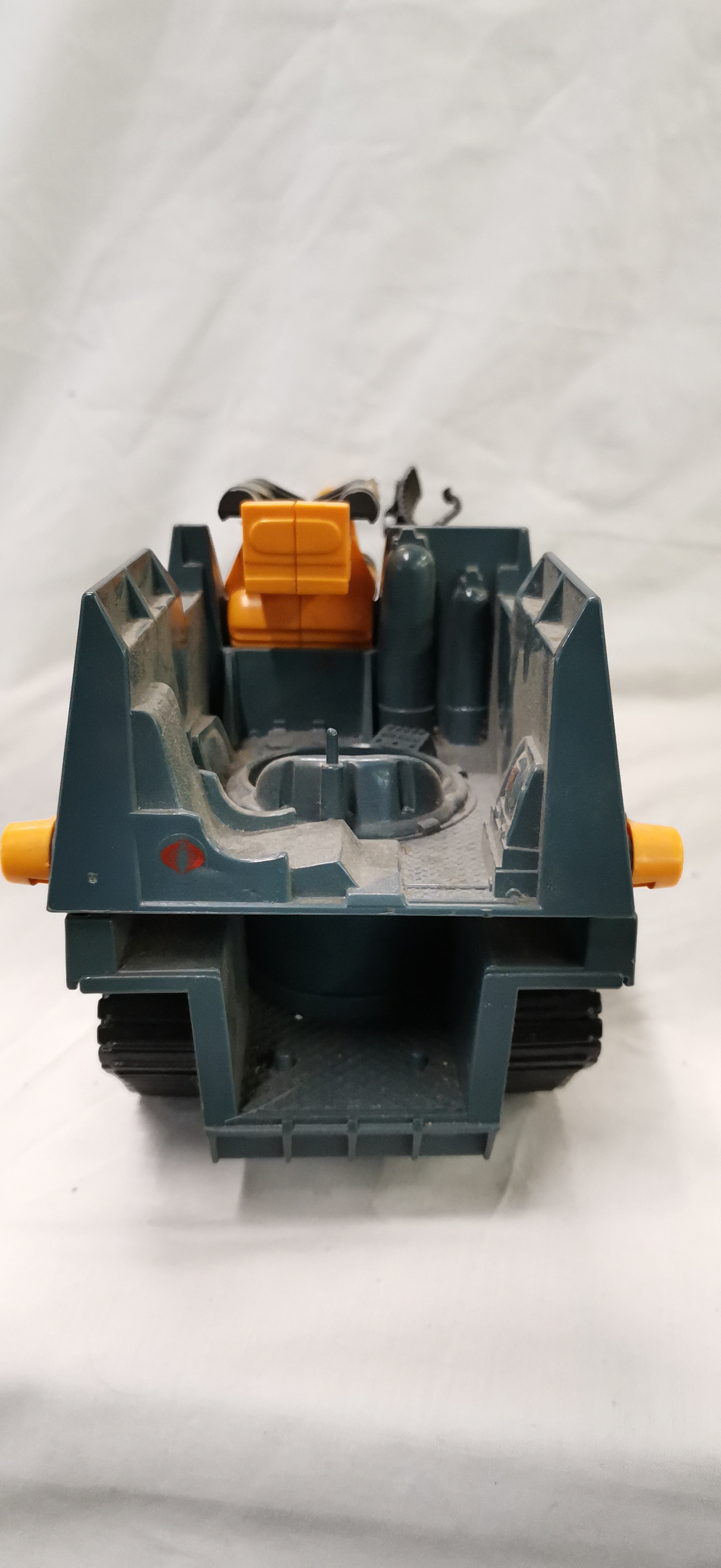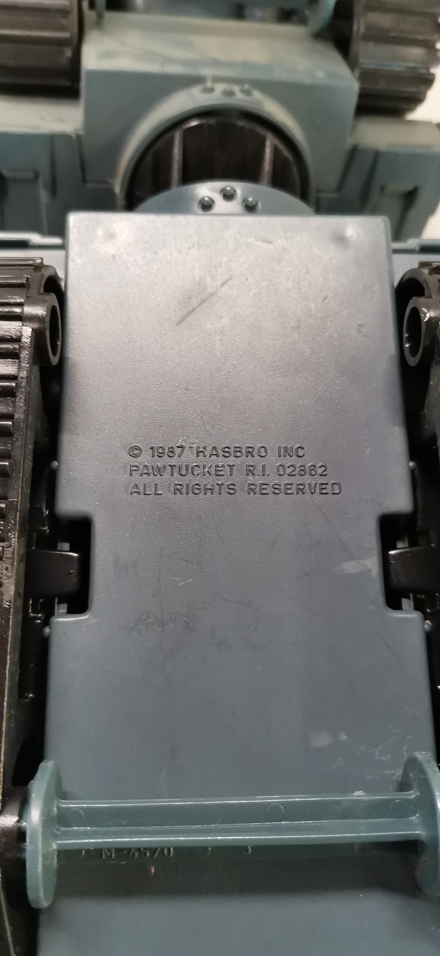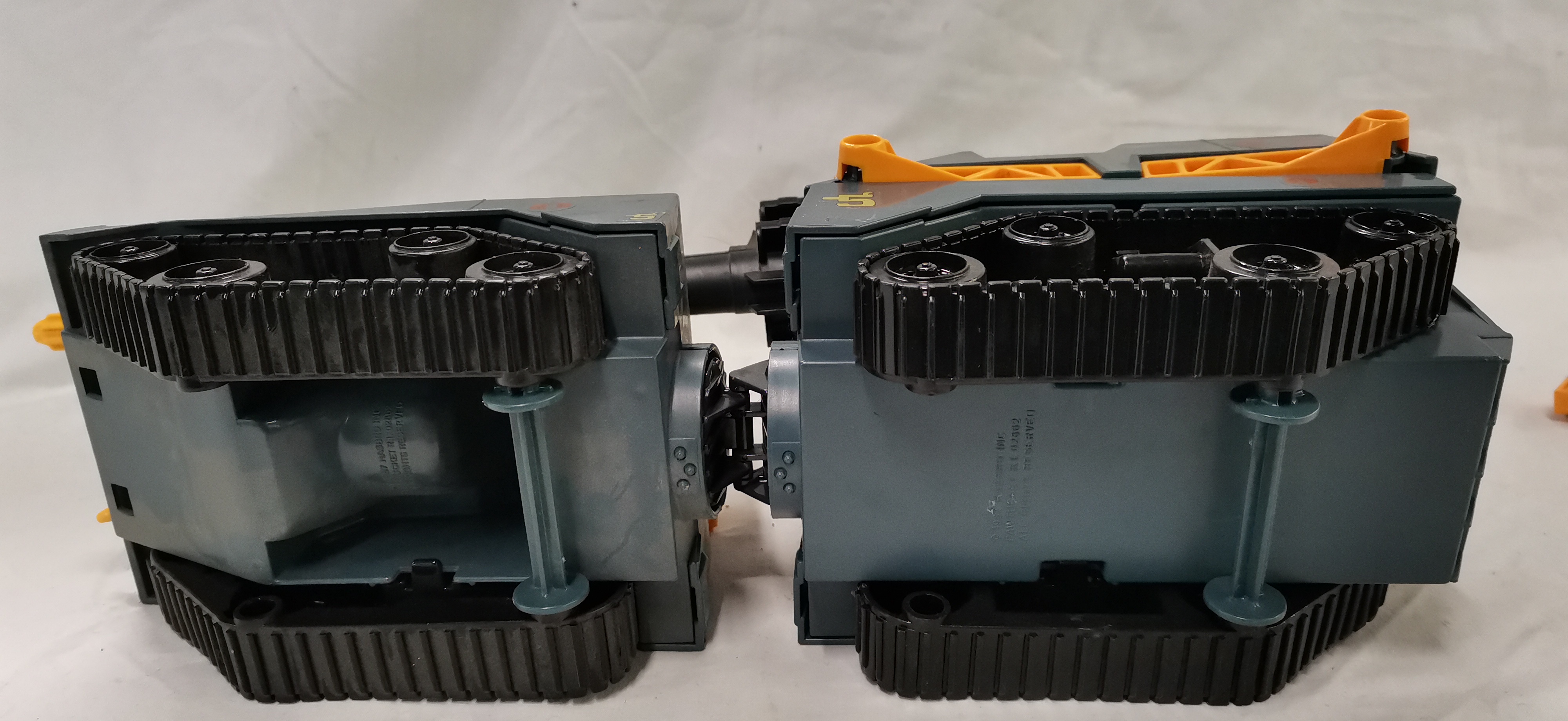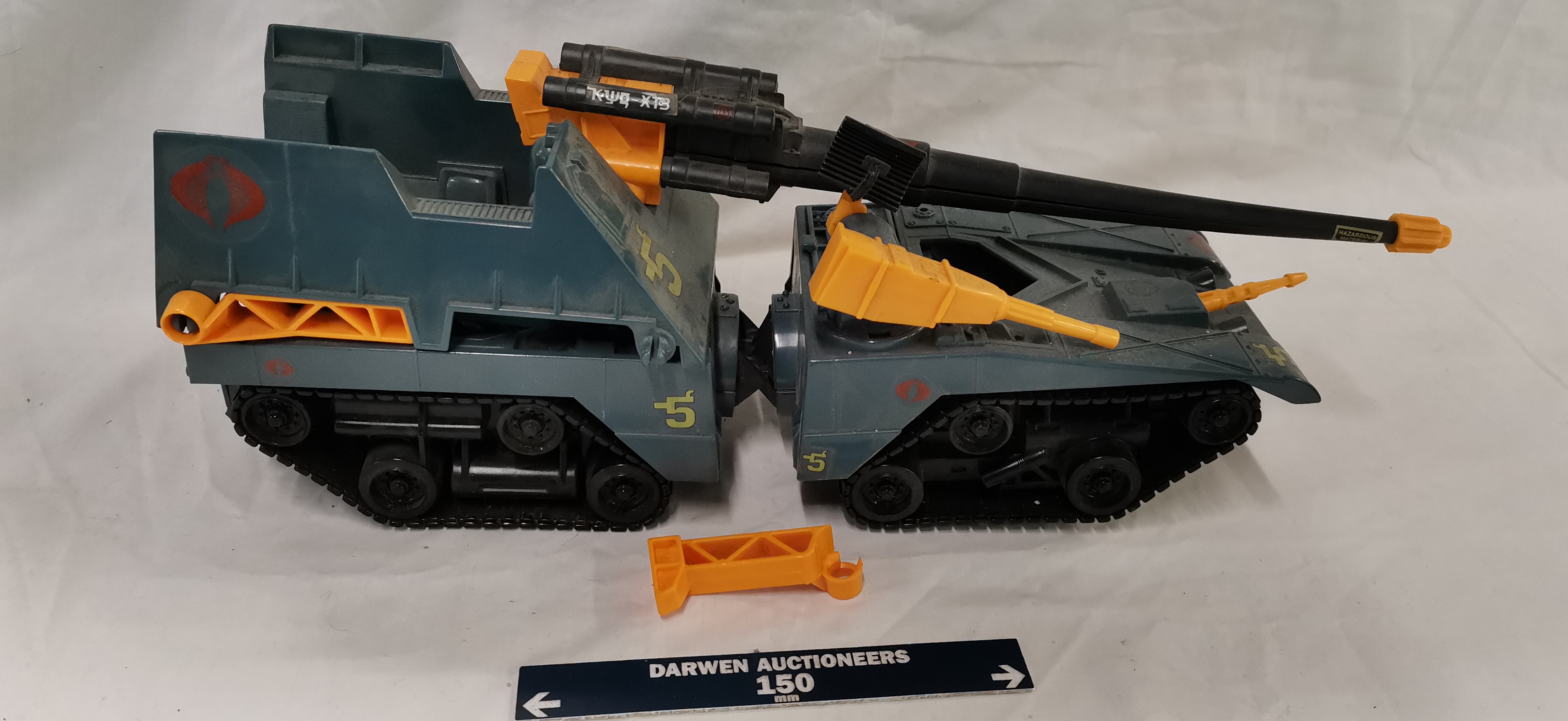 A Hasbro G.I. Joe Cobra Maggot modular battle vehicle, dated 1987. The vehicle is constructed from blue-grey plastic with contrasting orange and yellow components. This modular unit is designed to separate into three distinct sections: a front command tank, a middle radar and control section, and a rear heavy artillery platform. Features include multiple rotatable gun turrets, a long-range black main cannon, and independent track units for each section. The underside is embossed with the marks © 1987 HASBRO INC, PAWTUCKET R.I. 02862, and ALL RIGHTS RESERVED. Various decals are applied, including the Cobra insignia and the identification number 5. This model was distributed in the United Kingdom under the Action Force brand.