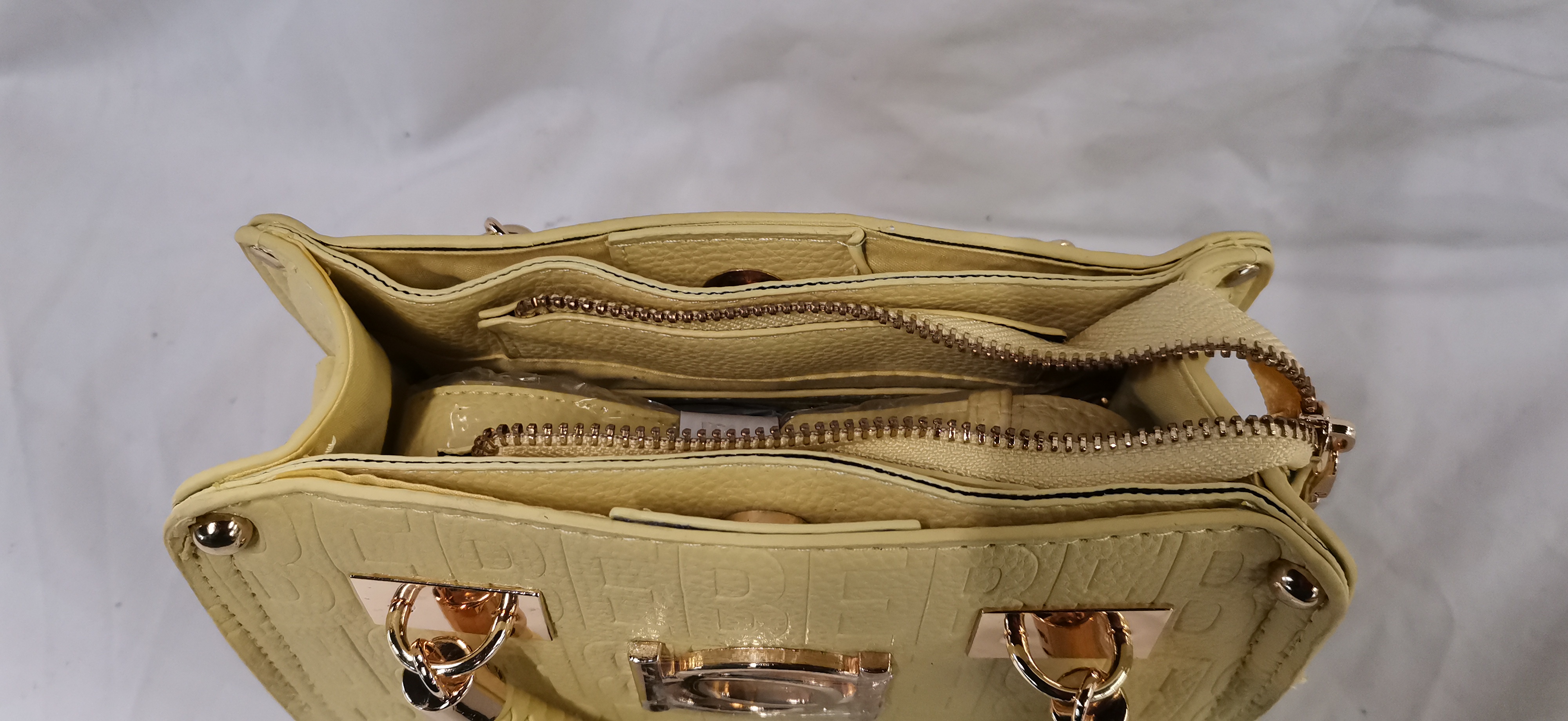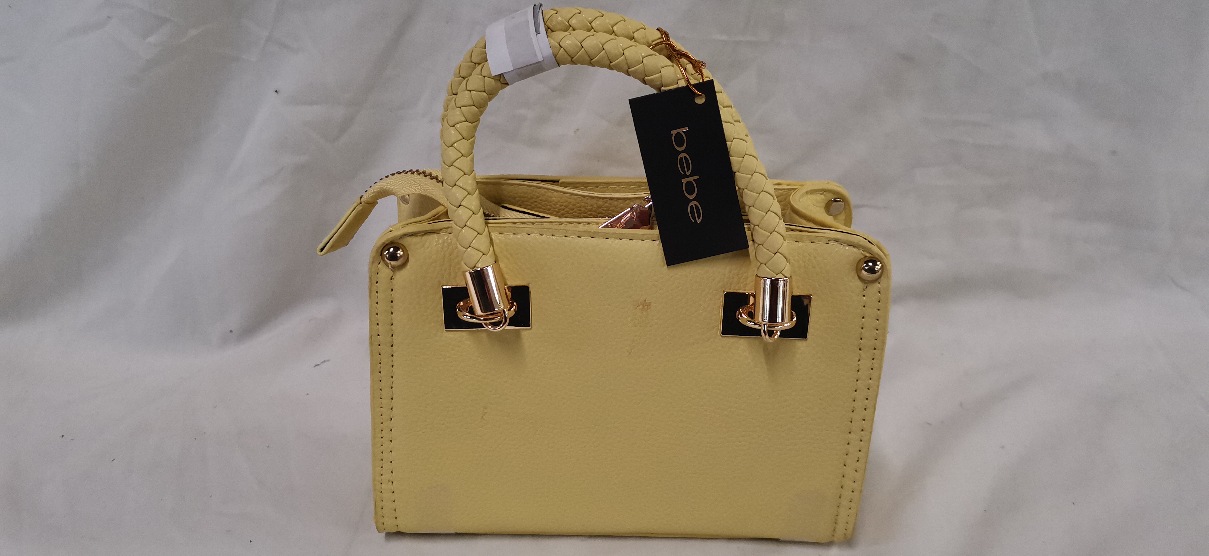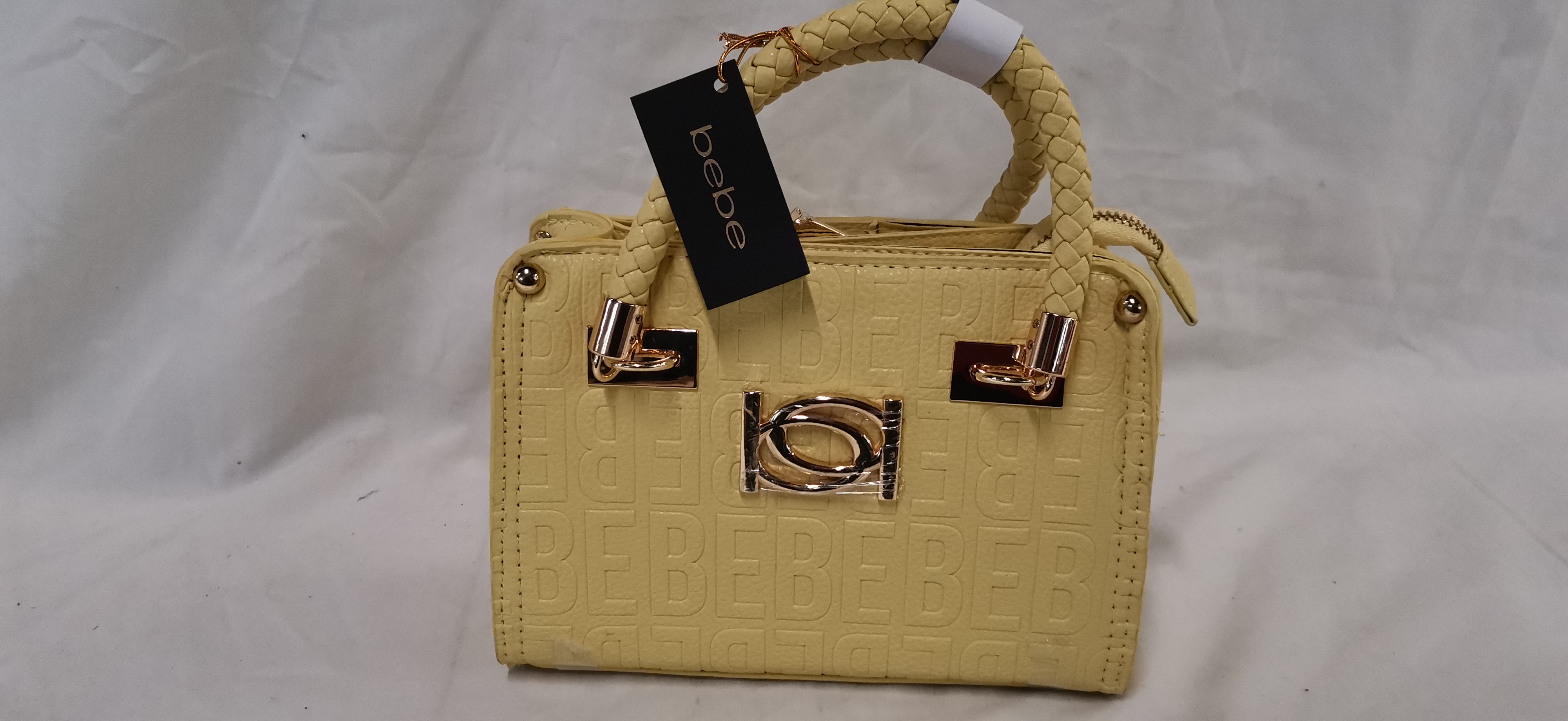 A Bebe Alexandra small structured satchel handbag in pale yellow textured synthetic leather. The front panel features an embossed repeating BEBE logo pattern and a central gold-tone metal brand plaque. The bag is designed with twin braided top handles and a triple-compartment interior, comprising a central zip-fastened section flanked by two compartments with magnetic snap closures. The item is finished with polished gold-tone hardware, including D-rings for a detachable shoulder strap and four protective metal feet to the base. The interior is lined in a coordinating fabric and contains the detachable shoulder strap in its original protective plastic.