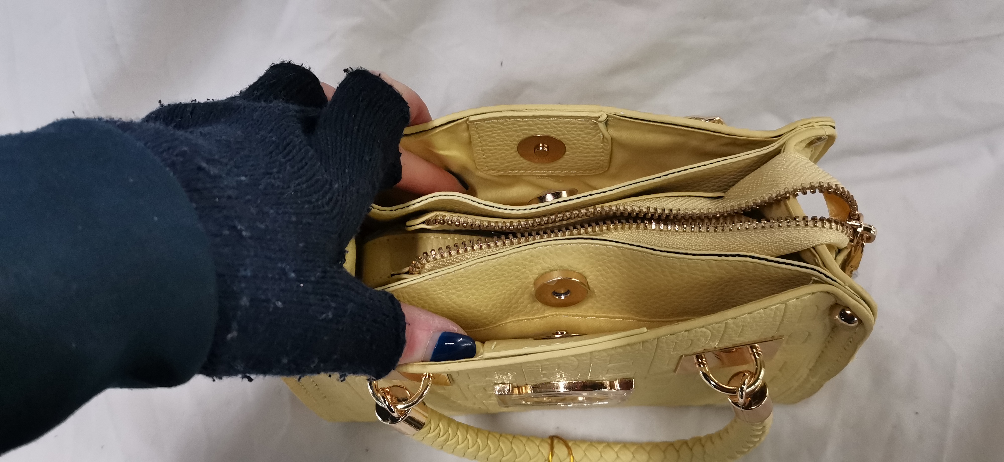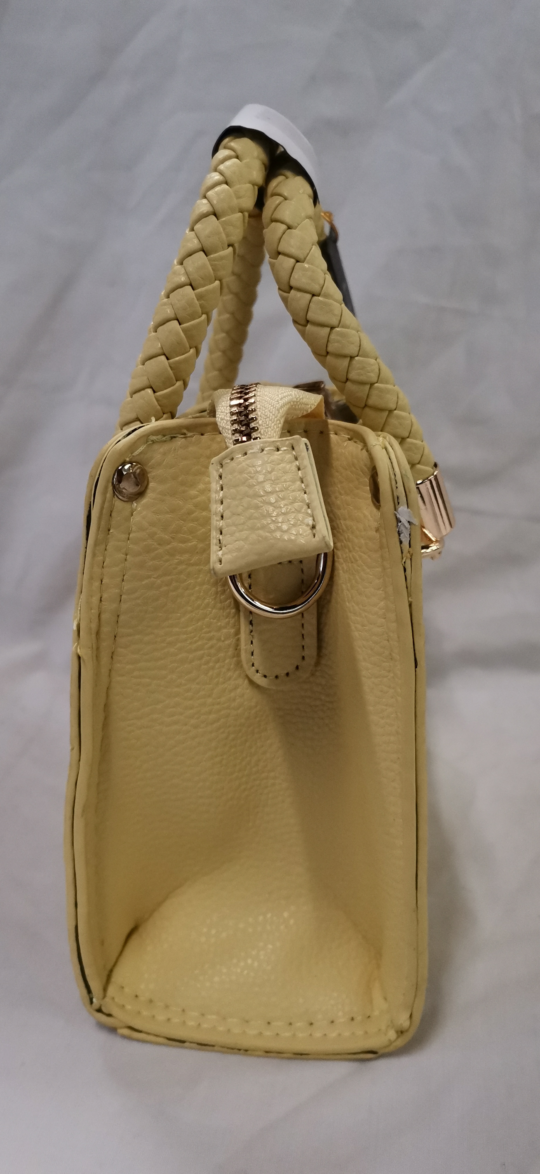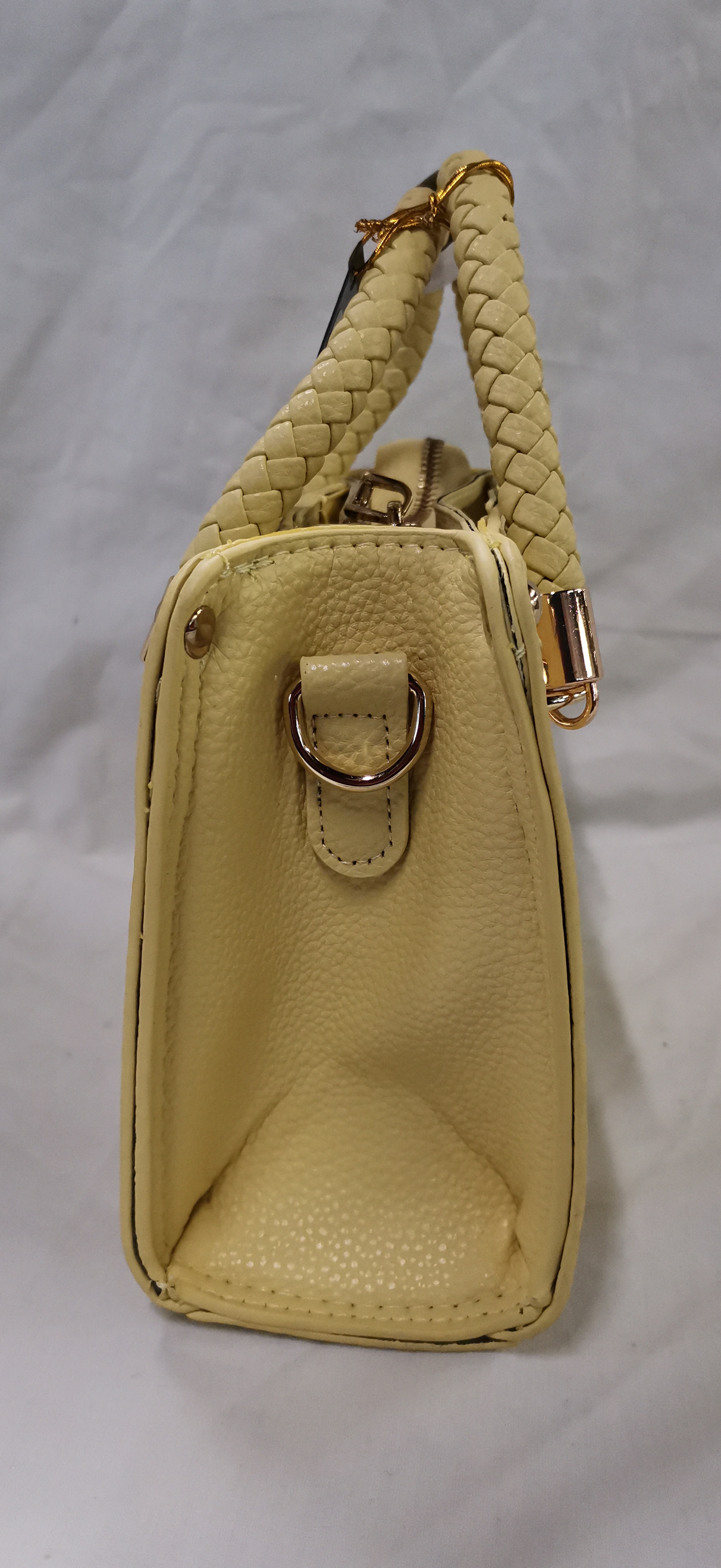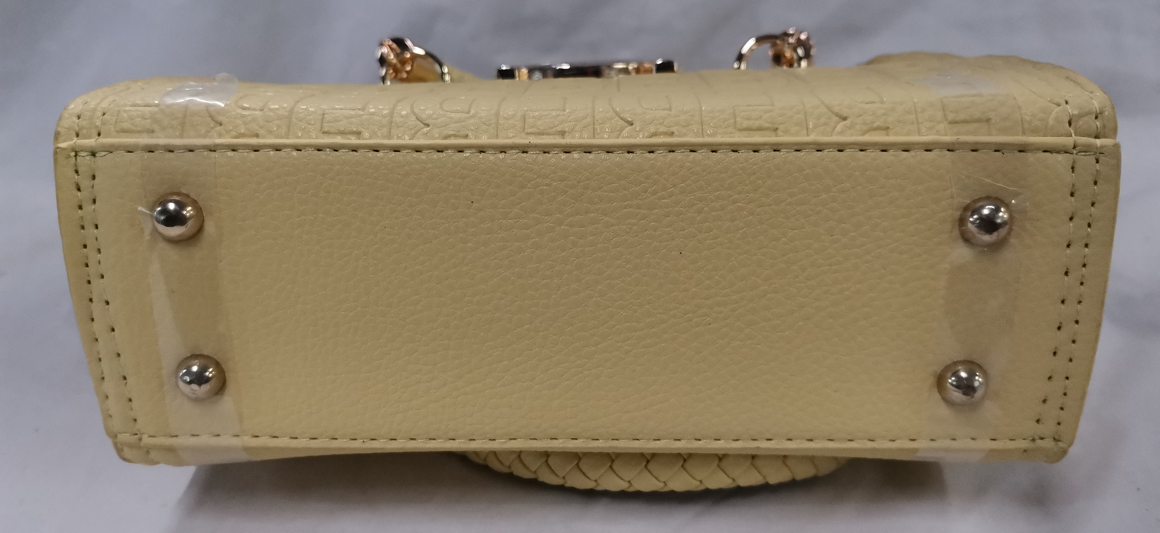 A Bebe Alexandra small structured satchel handbag in pale yellow textured synthetic leather. The front panel features an embossed repeating BEBE logo pattern and a central gold-tone metal brand plaque. The bag is designed with twin braided top handles and a triple-compartment interior, comprising a central zip-fastened section flanked by two compartments with magnetic snap closures. The item is finished with polished gold-tone hardware, including D-rings for a detachable shoulder strap and four protective metal feet to the base. The interior is lined in a coordinating fabric and contains the detachable shoulder strap in its original protective plastic.