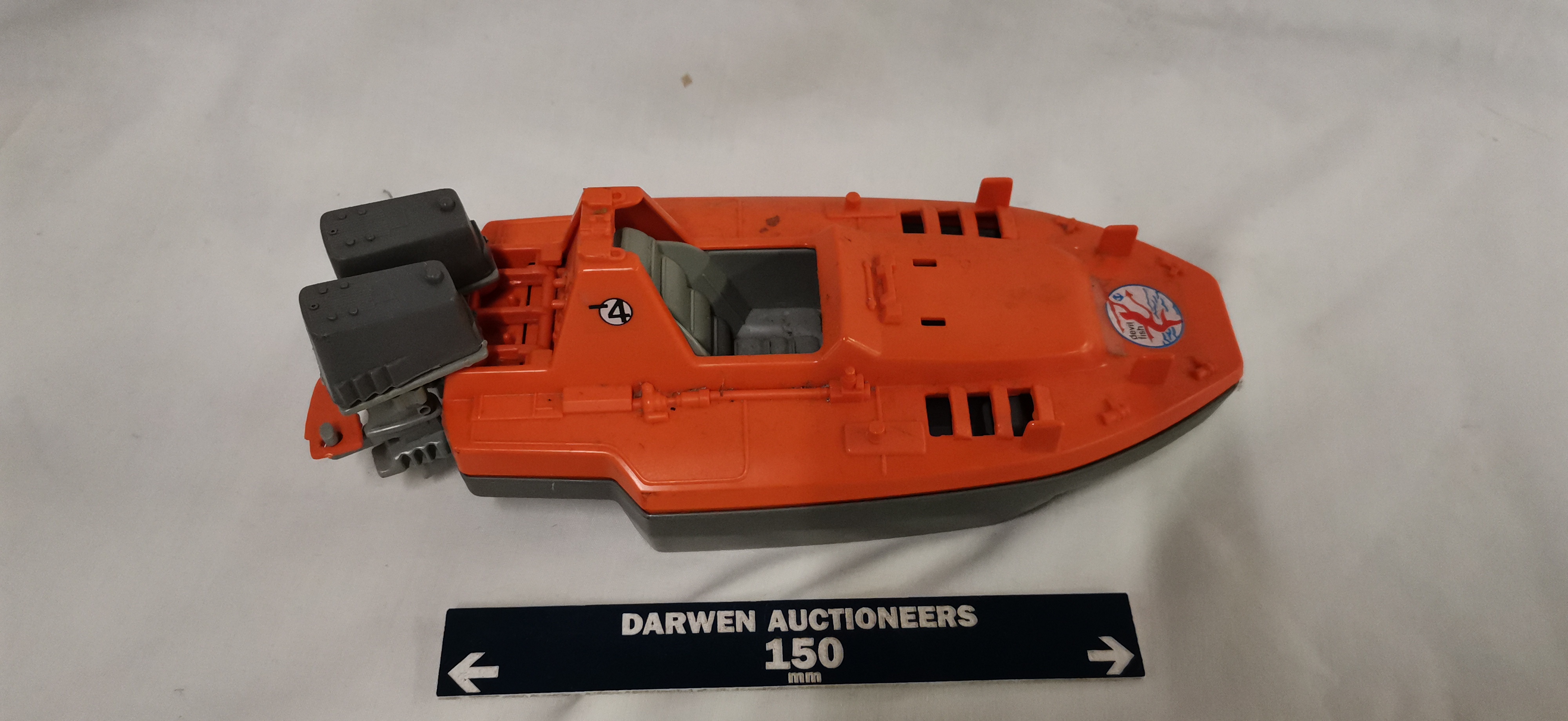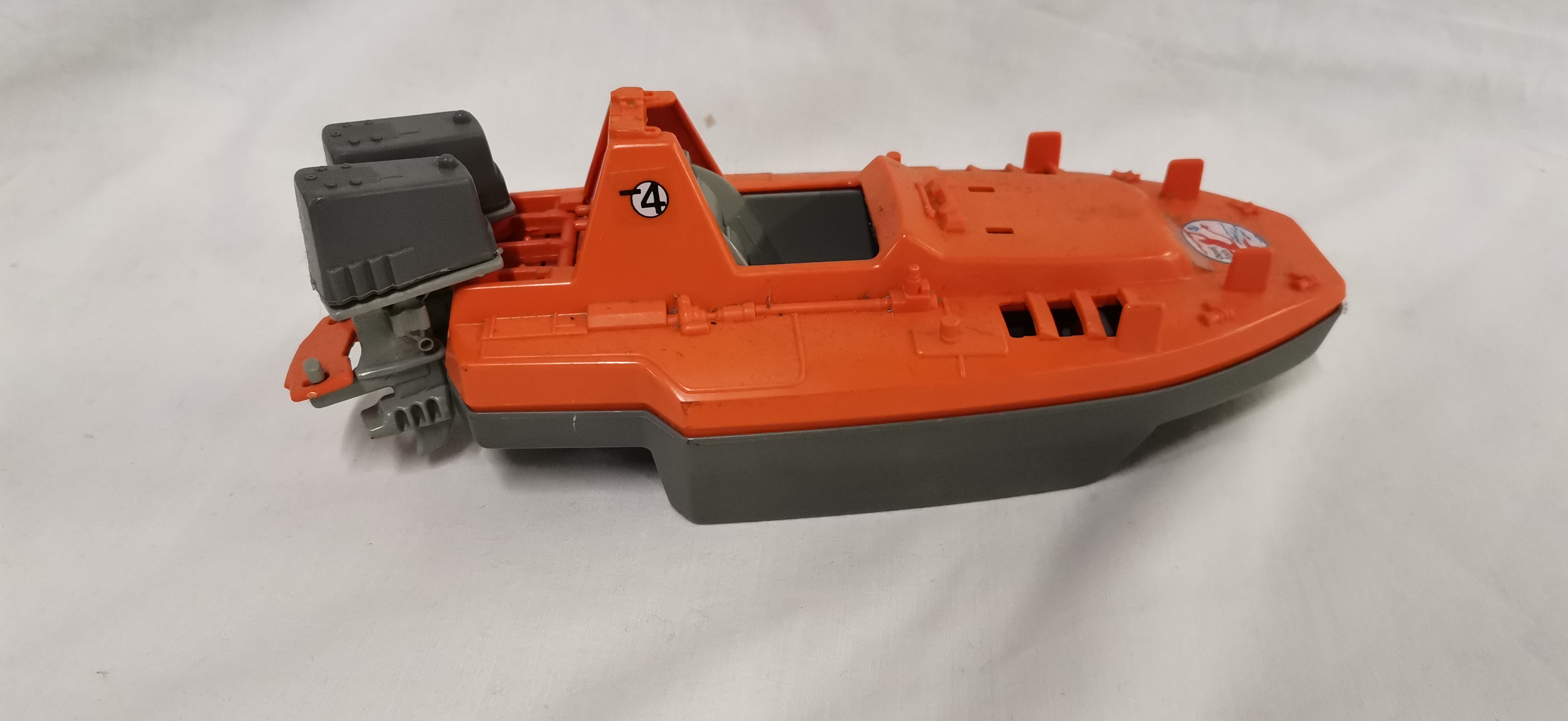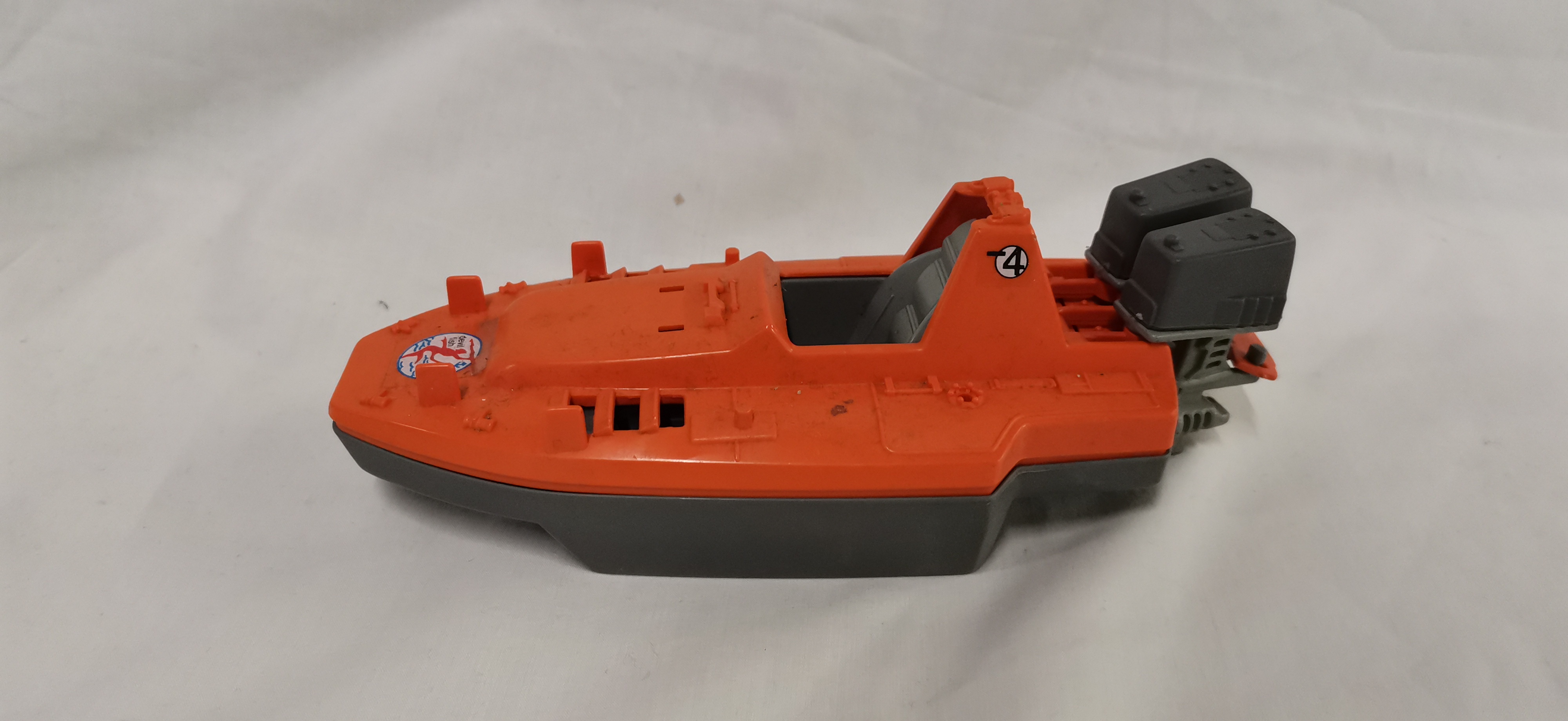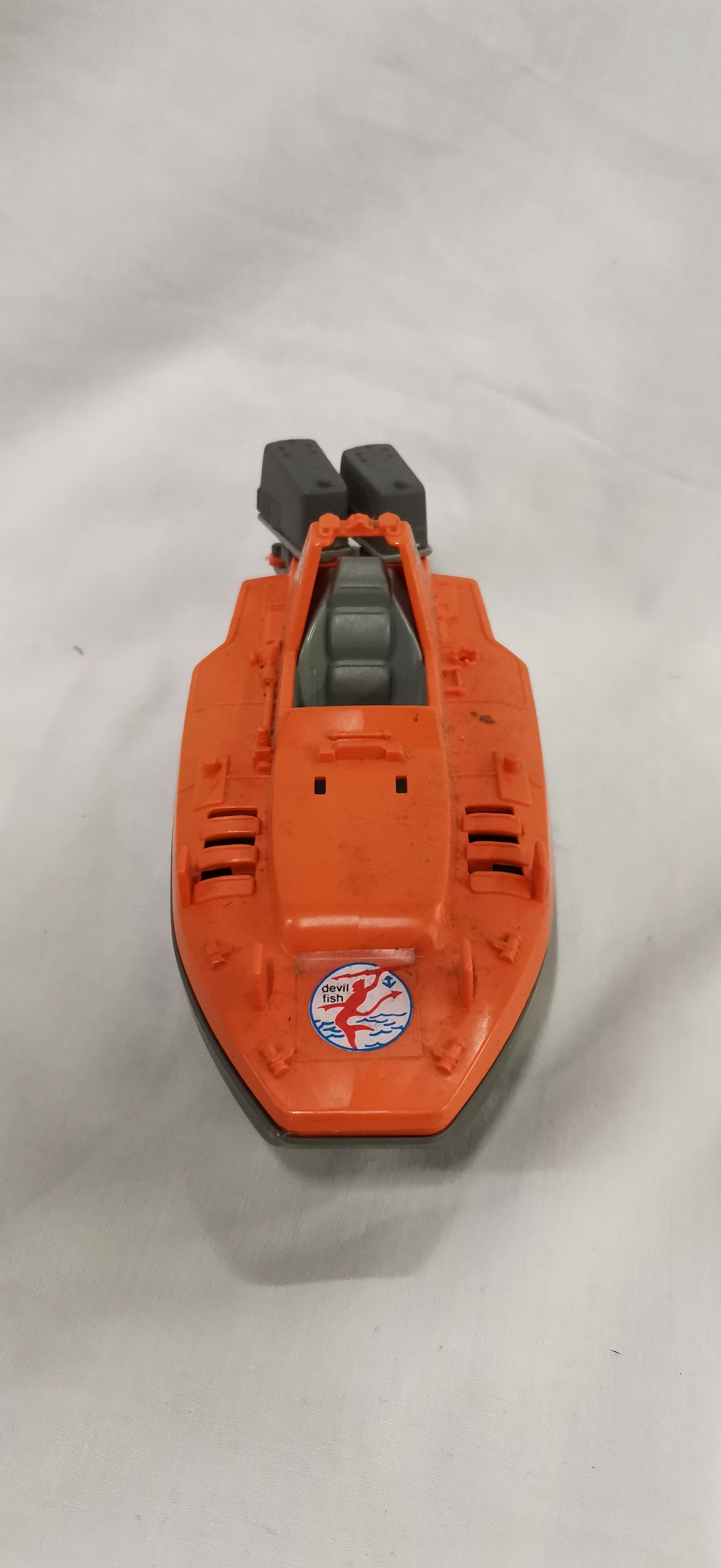 Hasbro G.I. Joe / Action Force Devil Fish motorised attack craft, a vintage plastic toy vehicle designed for 3.75-inch action figures. The craft features a two-tone colour scheme with an orange upper deck and a grey lower hull. It is equipped with dual grey outboard motor units at the stern and various moulded deck details, including foot pegs for figures and a central cockpit area. Visible markings include a circular sticker on the bow with a red figure and blue anchor graphic accompanied by the lowercase text devil fish. Two circular stickers on the raised cockpit section display the number 4 with a horizontal bar.