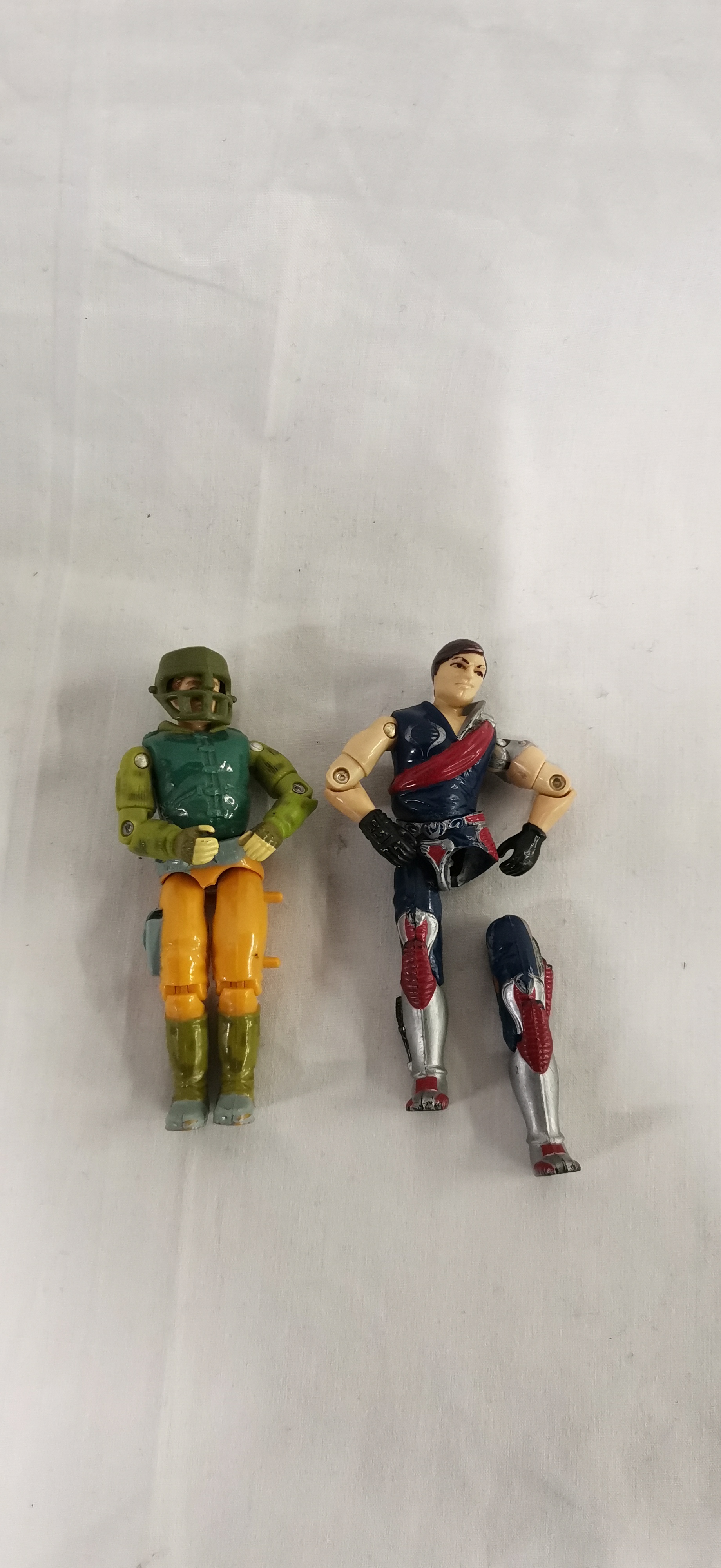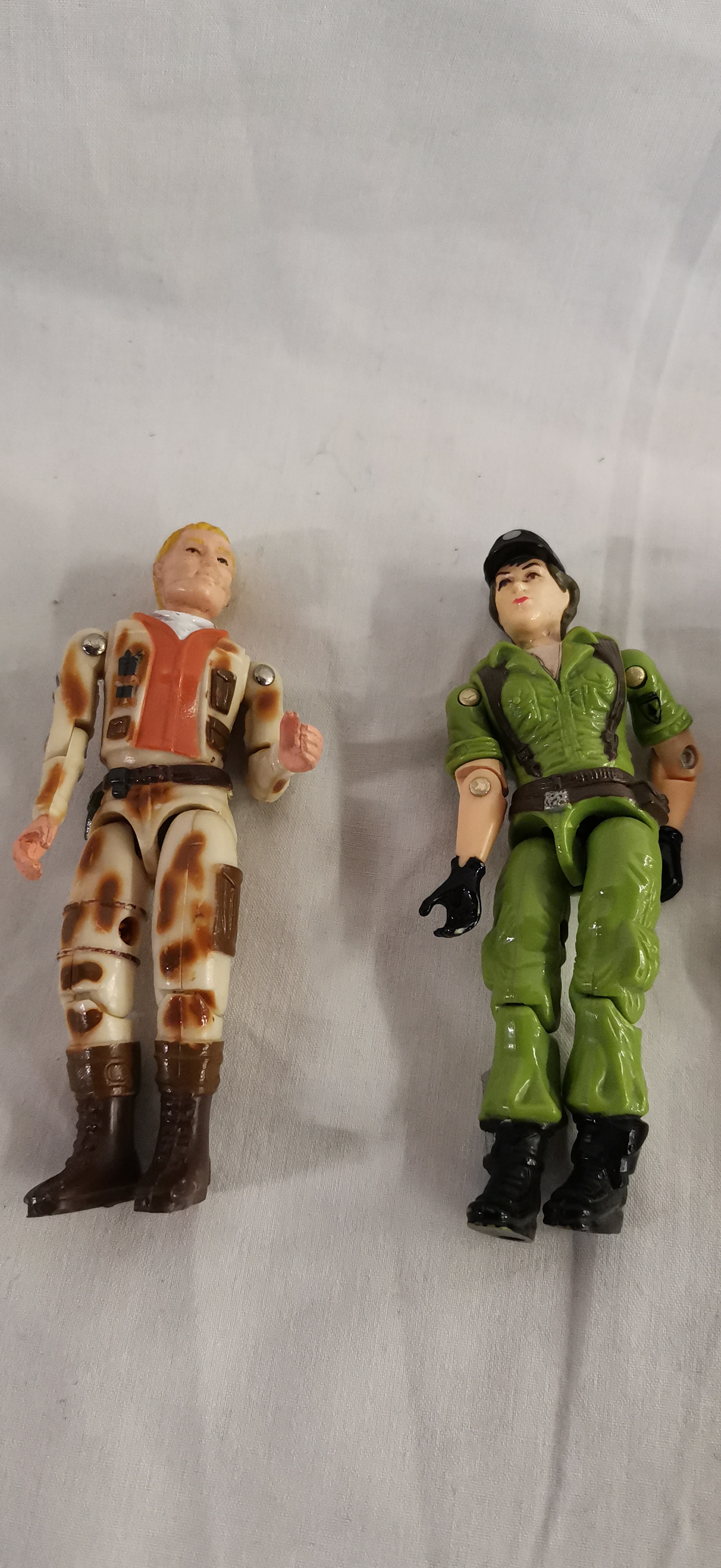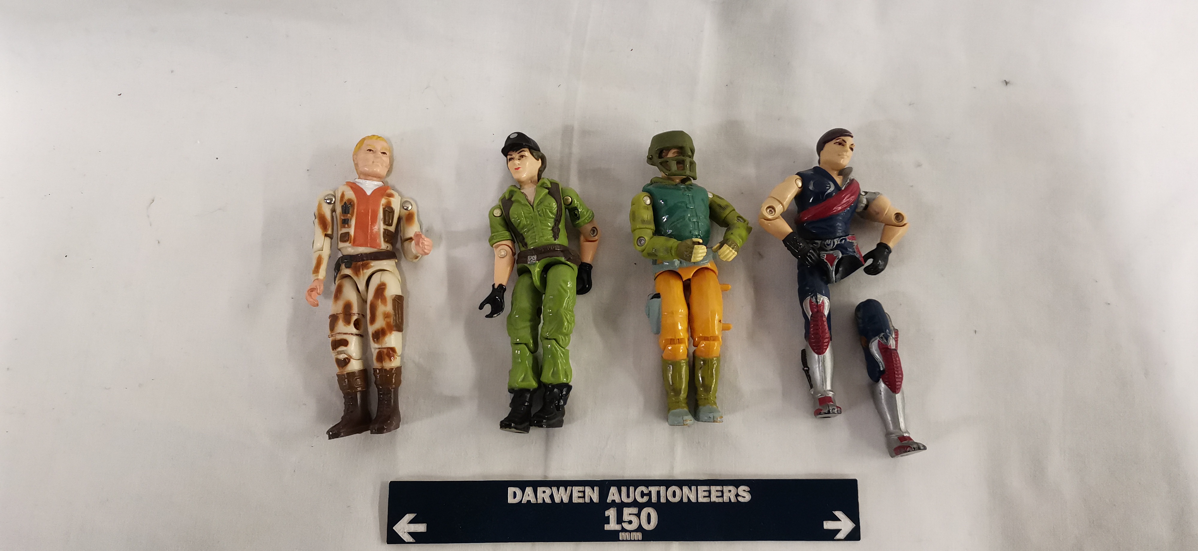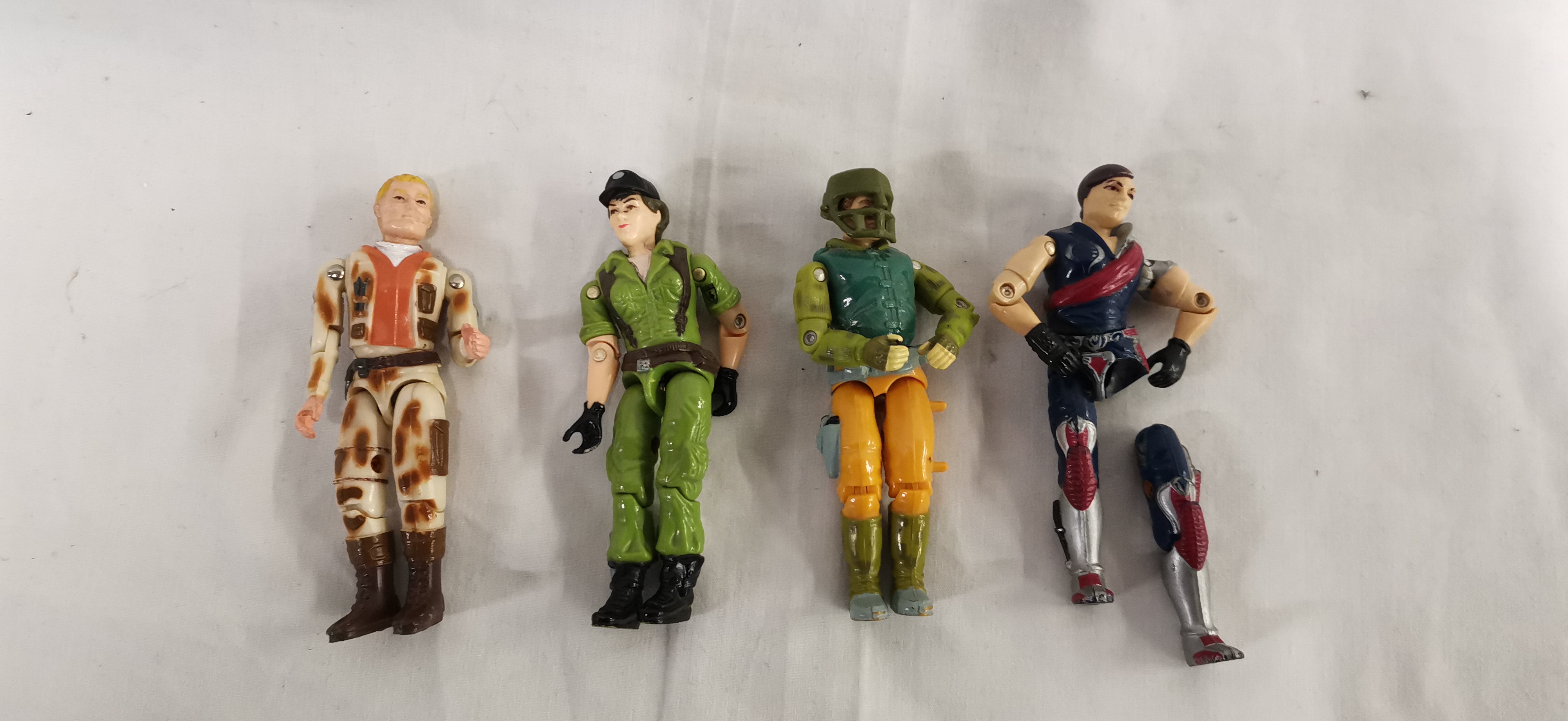 This collection of vintage 3.75-inch plastic action figures is attributed to the Hasbro Action Force (UK) and G.I. Joe: A Real American Hero (US) lines. The group includes characters identified as Dusty (1985) in desert camouflage with an orange-brown vest, Lady Jaye (1985) in green utility fatigues with a black cap, Capt. Grid-Iron (1990) in a green and yellow uniform with a face-guarded helmet, and Zarana (1986) from the Dreadnok faction. Each figure is constructed from injection-moulded plastic with metal rivets and features an internal rubber O-ring system for articulation. The Zarana figure features a dark hair variant. All figures are loose and offered without original accessories, weapons, backpacks, packaging, or backing cards. Raised rectangular areas for manufacturer marks are present on the reverse of the legs.