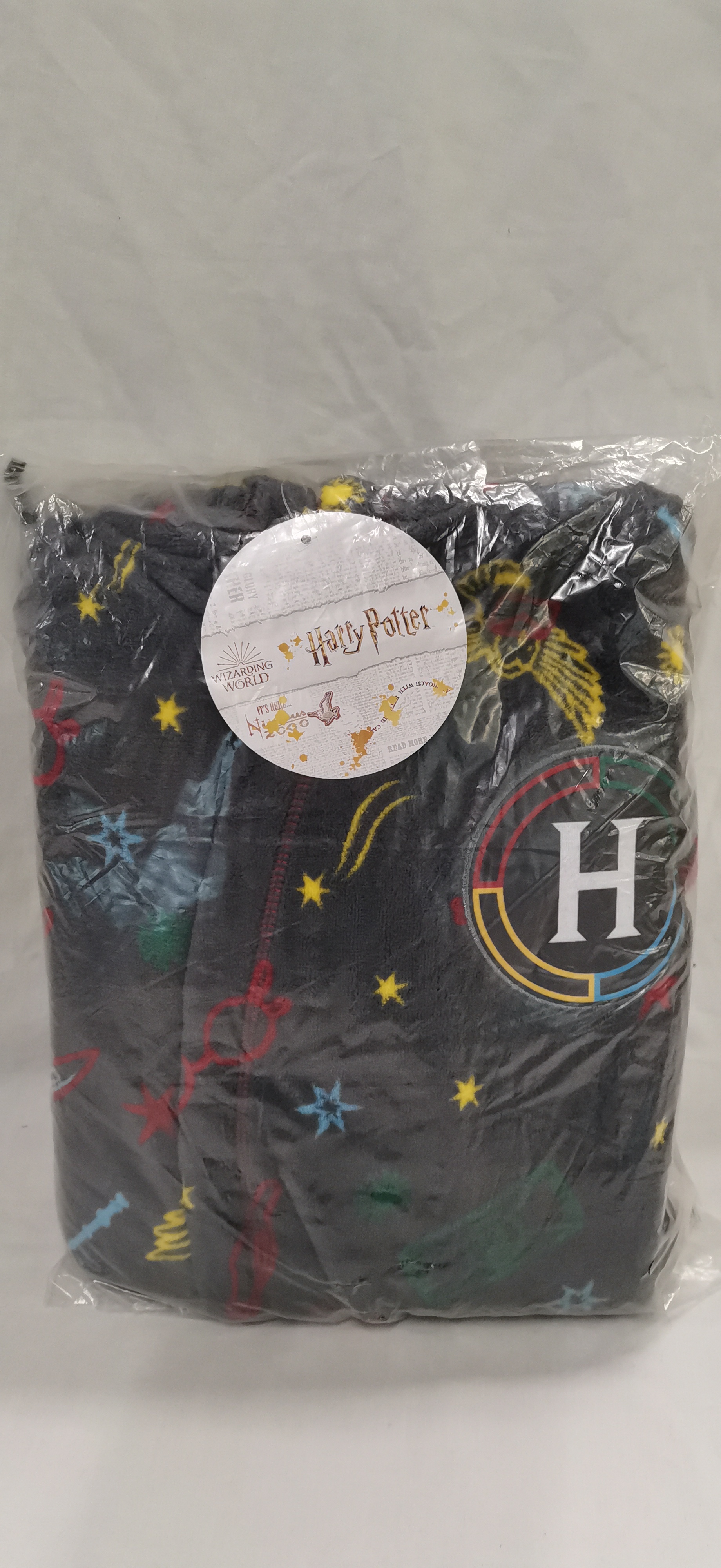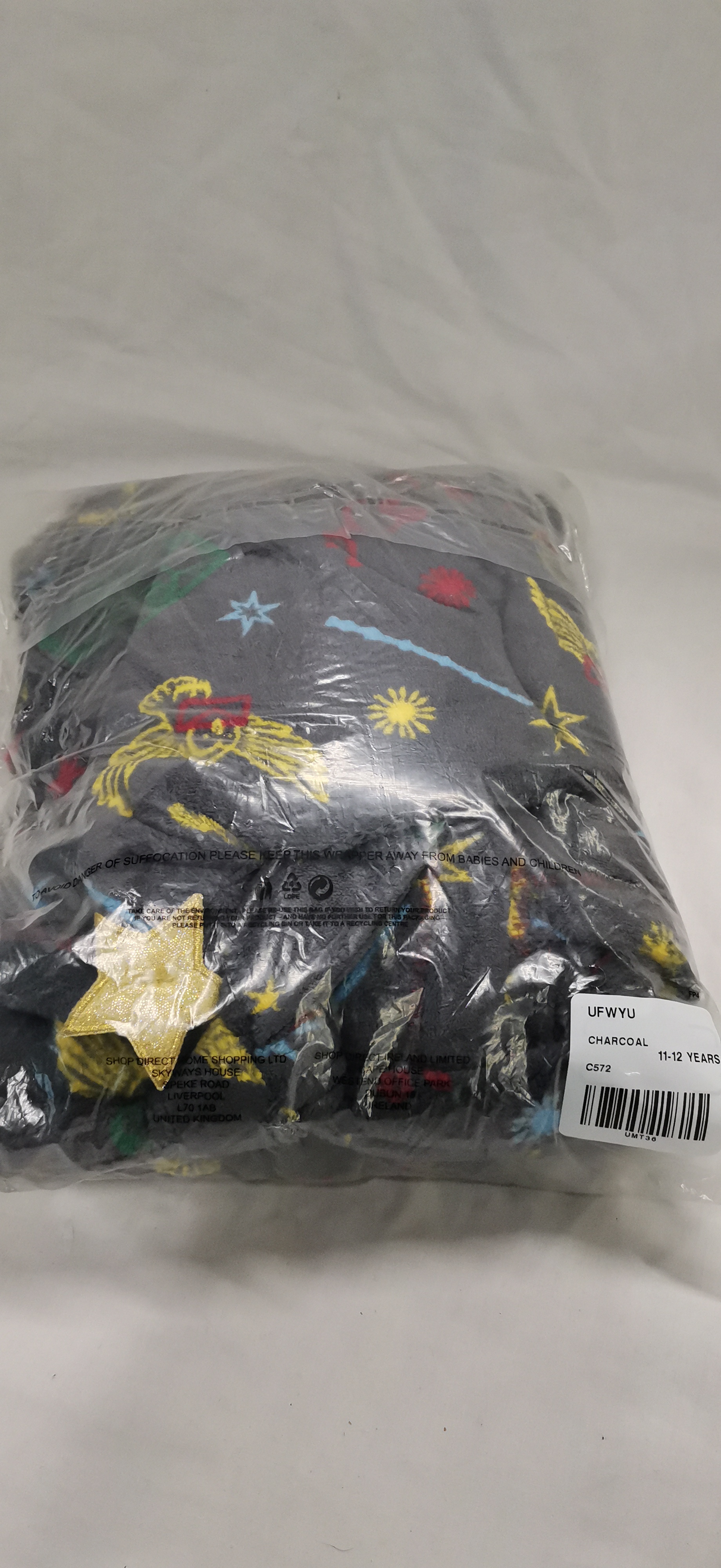 Official Wizarding World Harry Potter merchandise distributed by Shop Direct Home Shopping Ltd. This charcoal grey fleece garment features an all-over printed pattern of motifs from the franchise, including the Golden Snitch, multi-coloured stars, and various graphic symbols. A prominent embroidered circular patch is situated on the front, depicting a large white letter H for Hogwarts enclosed within a ring of four colours representing the school houses. The item is sized for a child aged 11-12 years. It retains its original circular retail hangtag featuring the Wizarding World and Harry Potter logos. The reverse of the plastic packaging bears a white adhesive label with the text UFWYU, CHARCOAL, 11-12 YEARS, and C572 alongside a barcode. The packaging also identifies the distributor as Shop Direct Home Shopping Ltd, Skyways House, Speke Road, Liverpool, L70 1AB, United Kingdom.