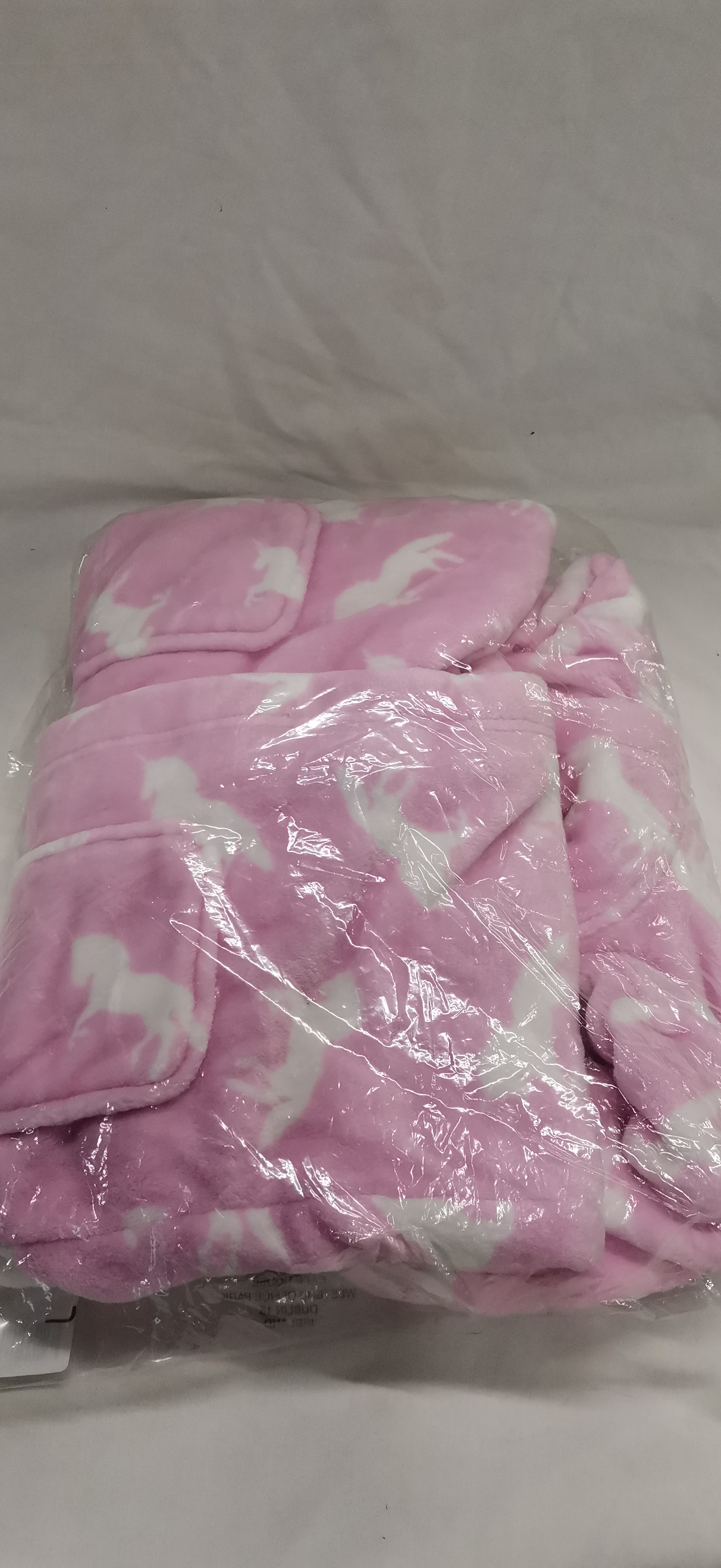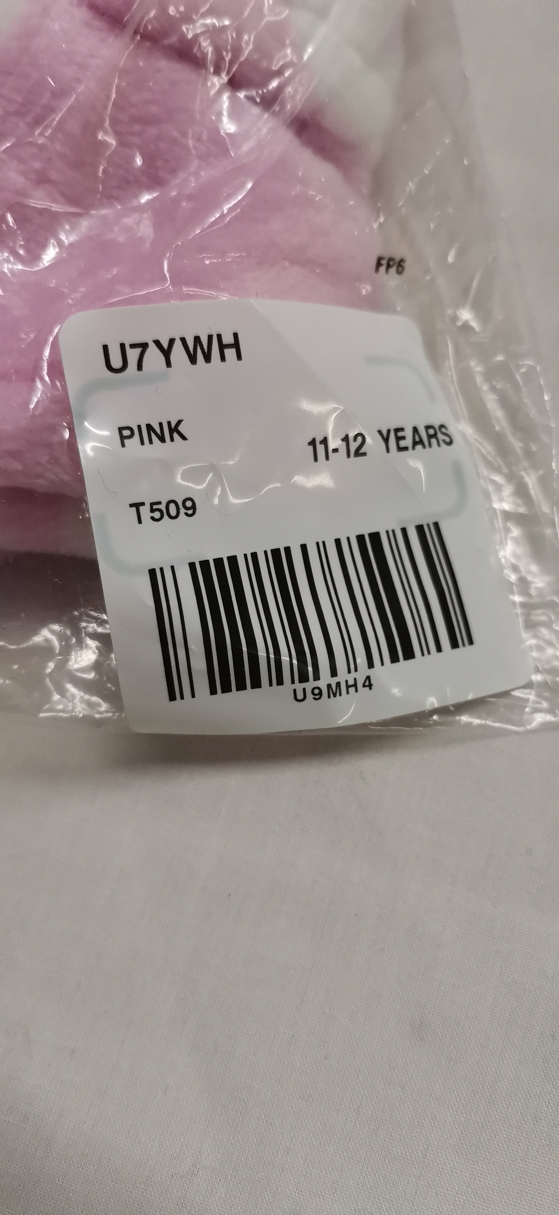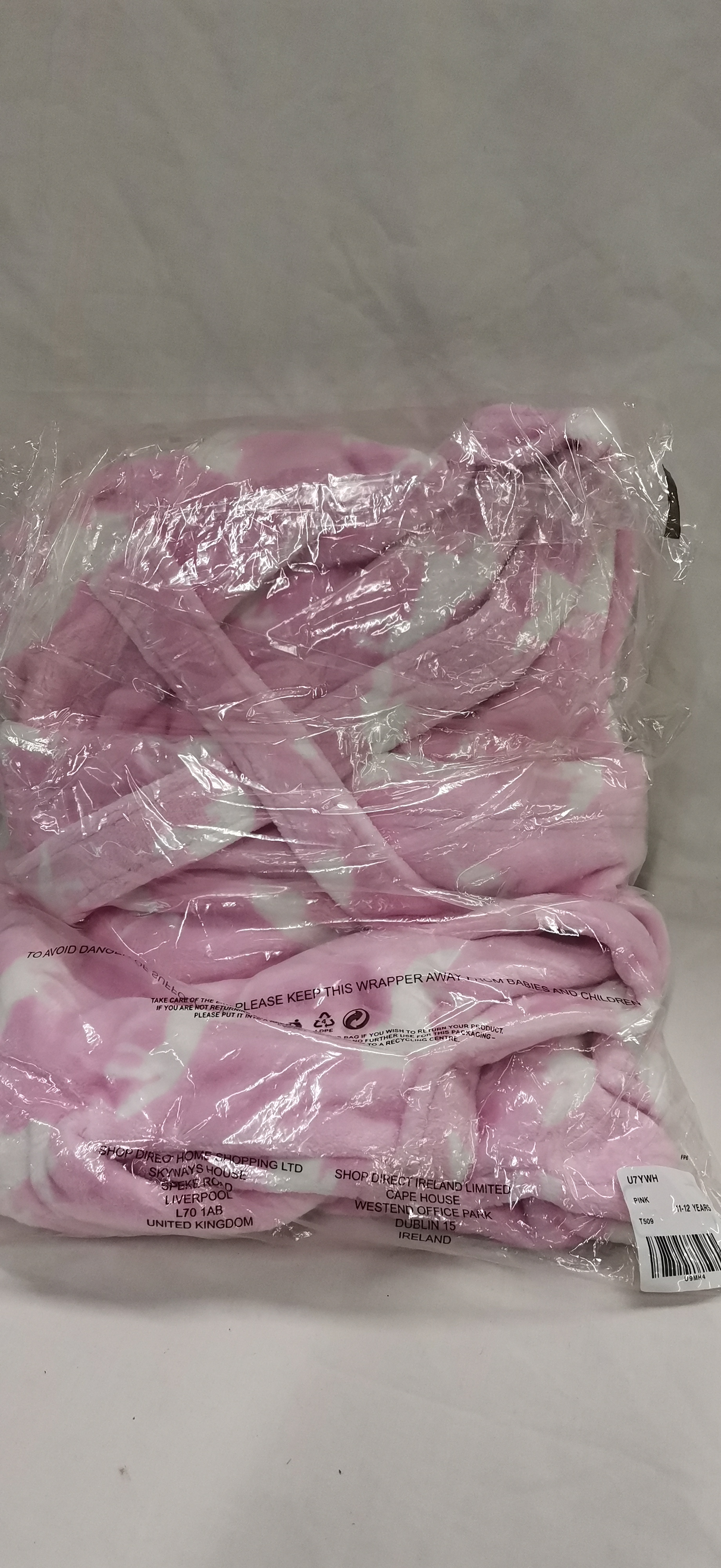 A children’s fleece dressing gown featuring a pink base with an all-over white unicorn pattern. The garment is designed with an integrated hood, a matching waist tie, and front pockets. The fabric pattern is consistent with glow-in-the-dark textile ranges found in the market. The item is housed in its original clear plastic transit packaging. Product labels indicate the size as 11-12 years and include the codes U7YWH and T509, with barcode identifier U9MH4. The packaging bears the corporate addresses for Shop Direct Home Shopping Ltd and Shop Direct Ireland Limited, suggesting the item is retail overstock.