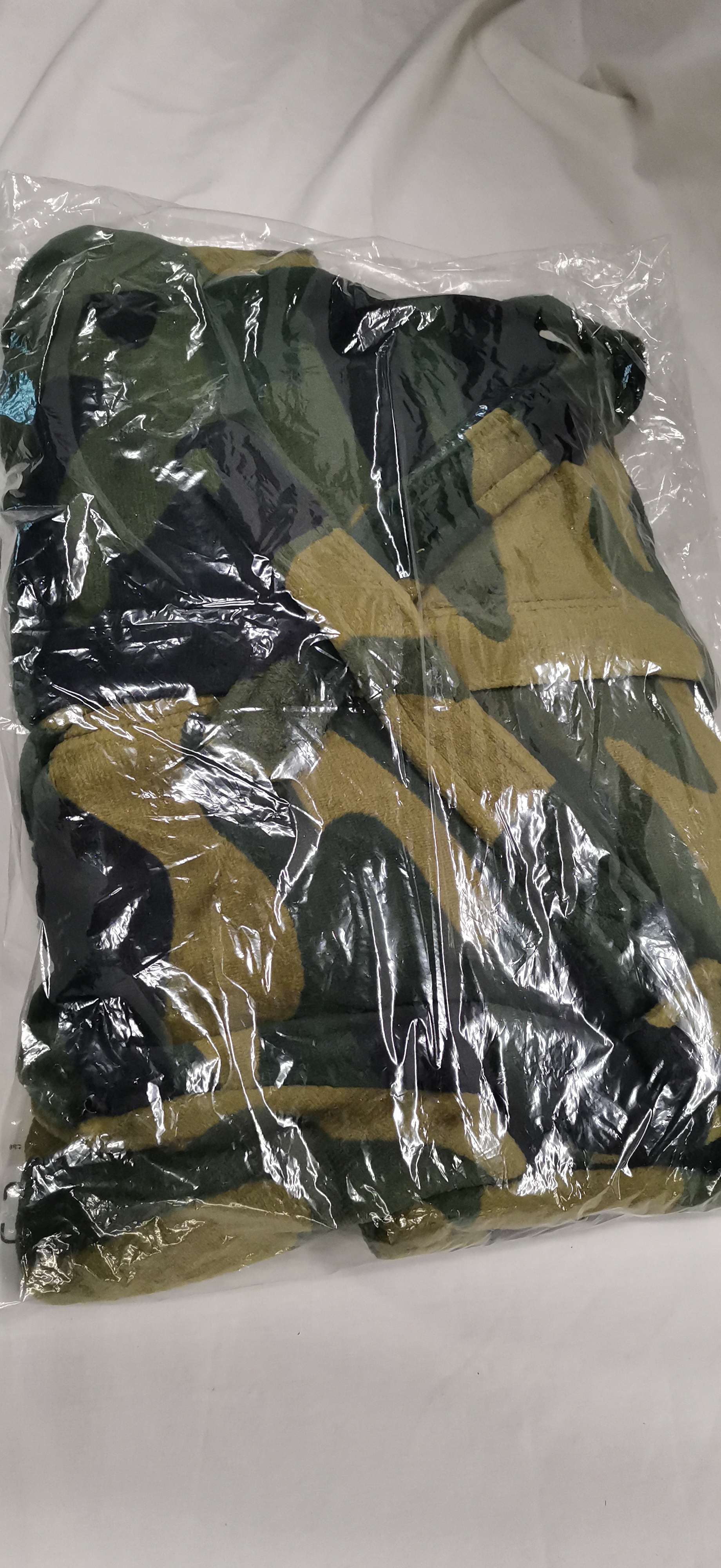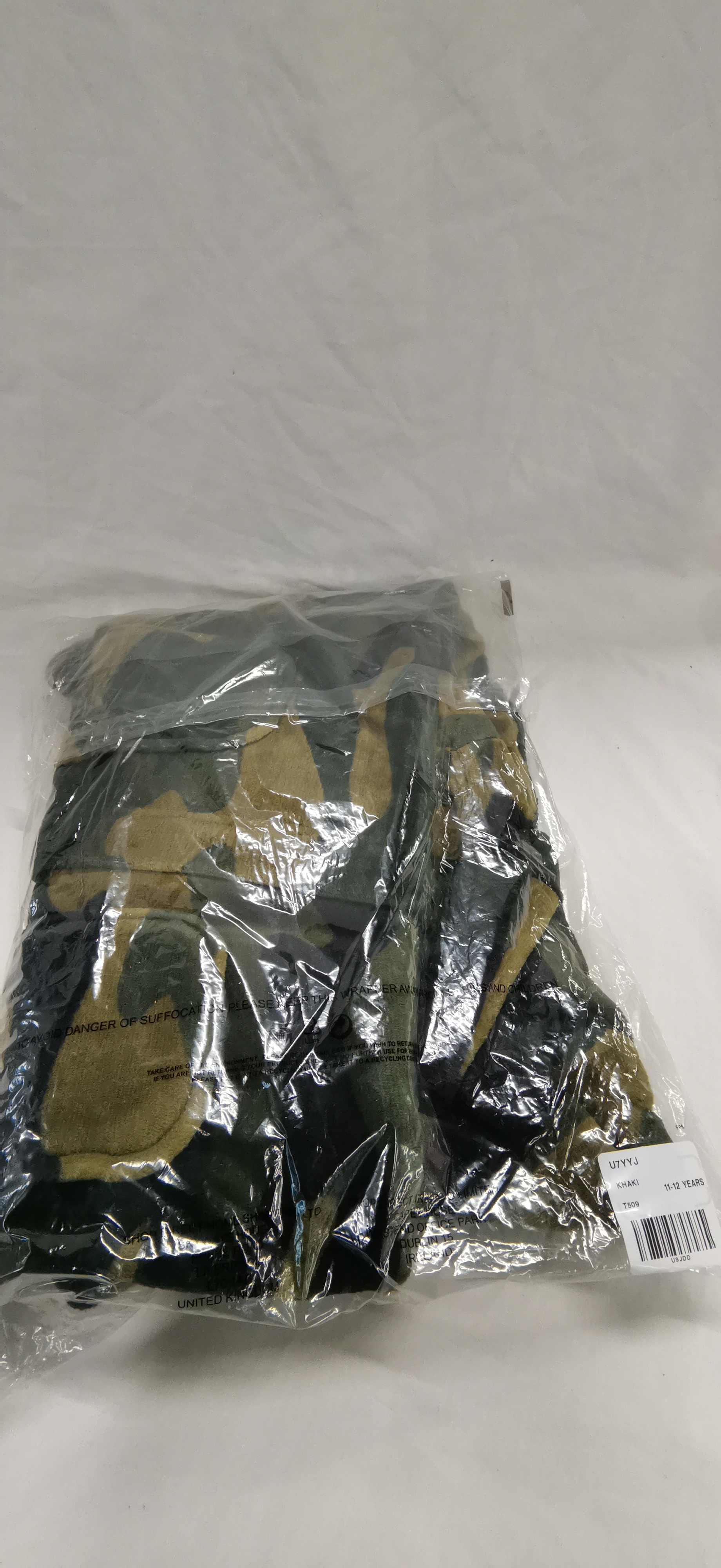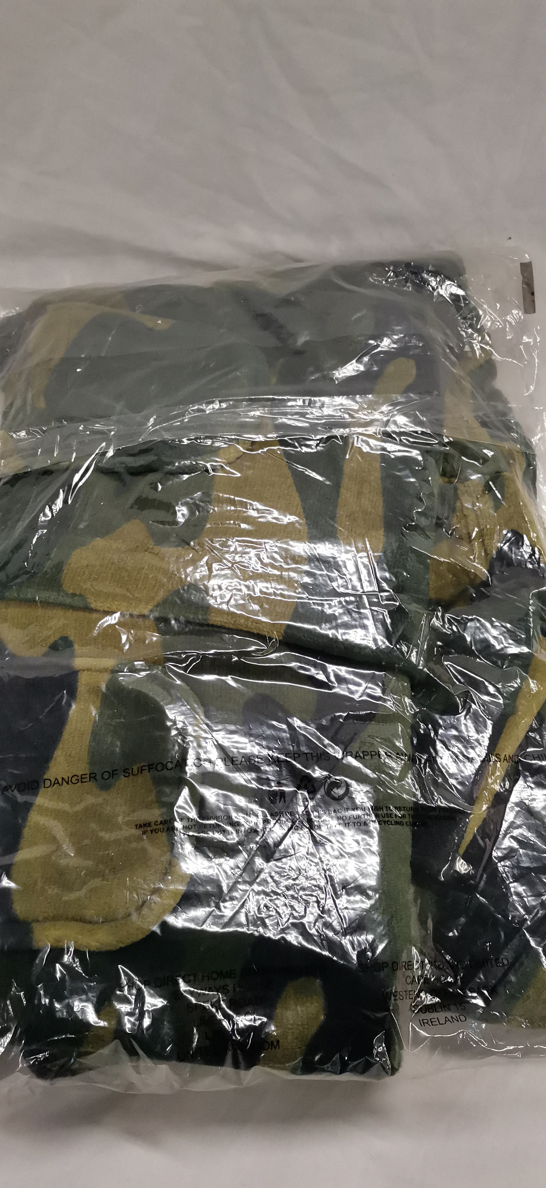 This is a modern child’s hooded dressing gown, also referred to as a bathrobe, presented in its original manufacturer’s sealed plastic packaging. The garment is constructed from a heavyweight, soft-touch plush synthetic fleece fabric. It features an all-over camouflage pattern incorporating shades of forest green, khaki, and navy. The design includes an integrated hood and a matching fabric tie-belt intended to secure the open front at the waist. An adhesive retail label on the packaging identifies the item with the codes U7YYJ and T509, the colour as KHAKI, and the size as 11-12 YEARS. The packaging is printed with manufacturer details for Shop Direct Home Shopping Limited, based in Dublin, Ireland, and the United Kingdom.