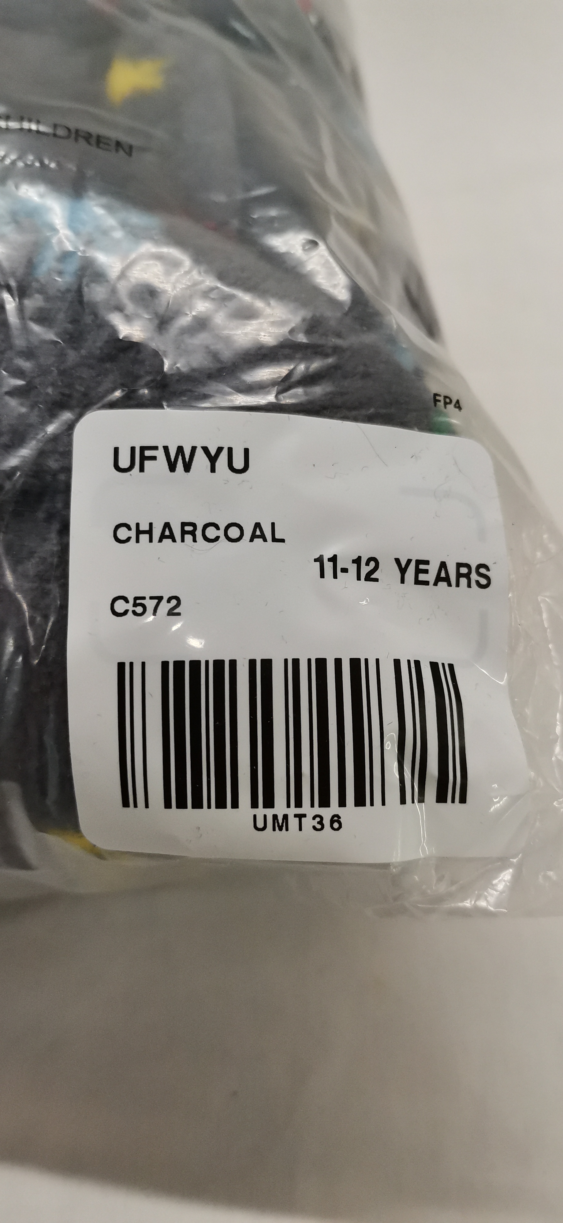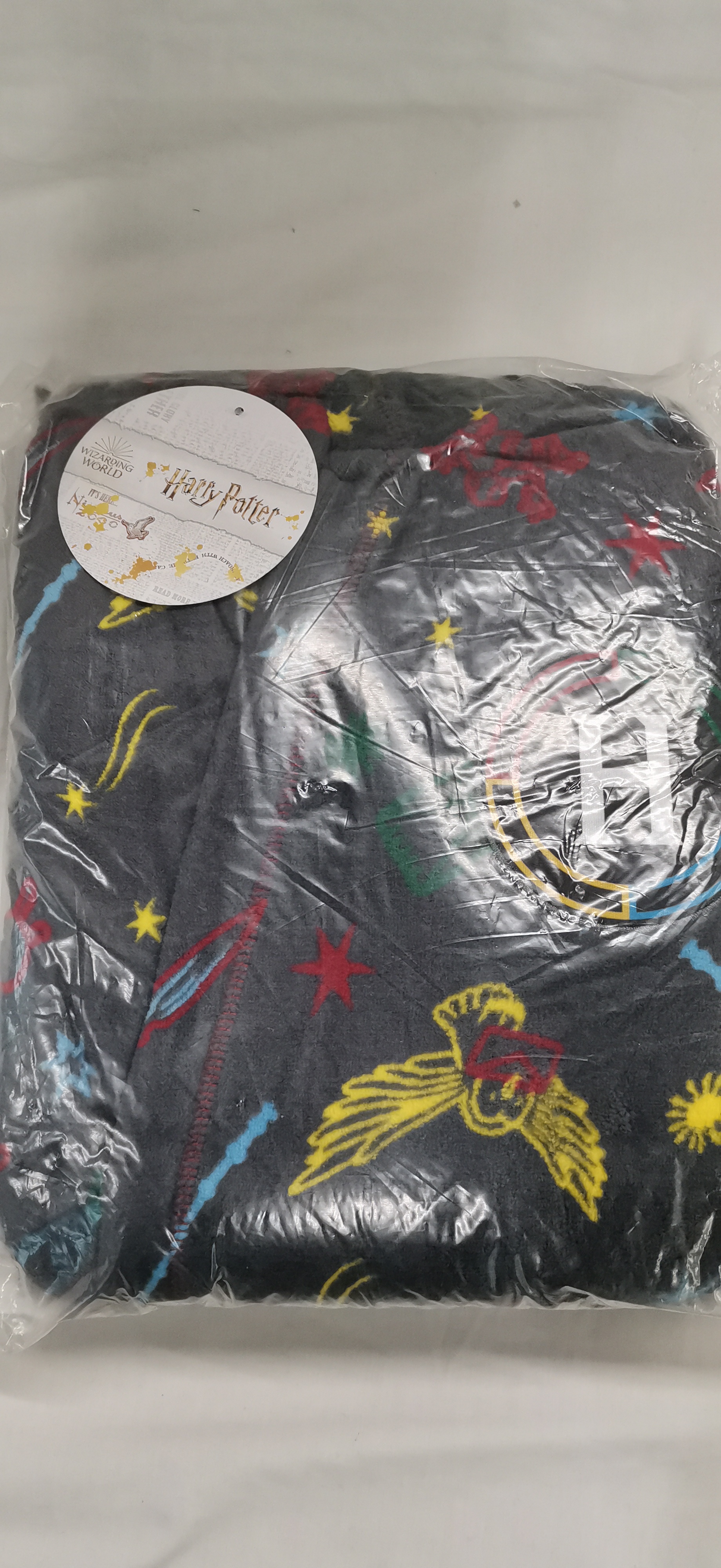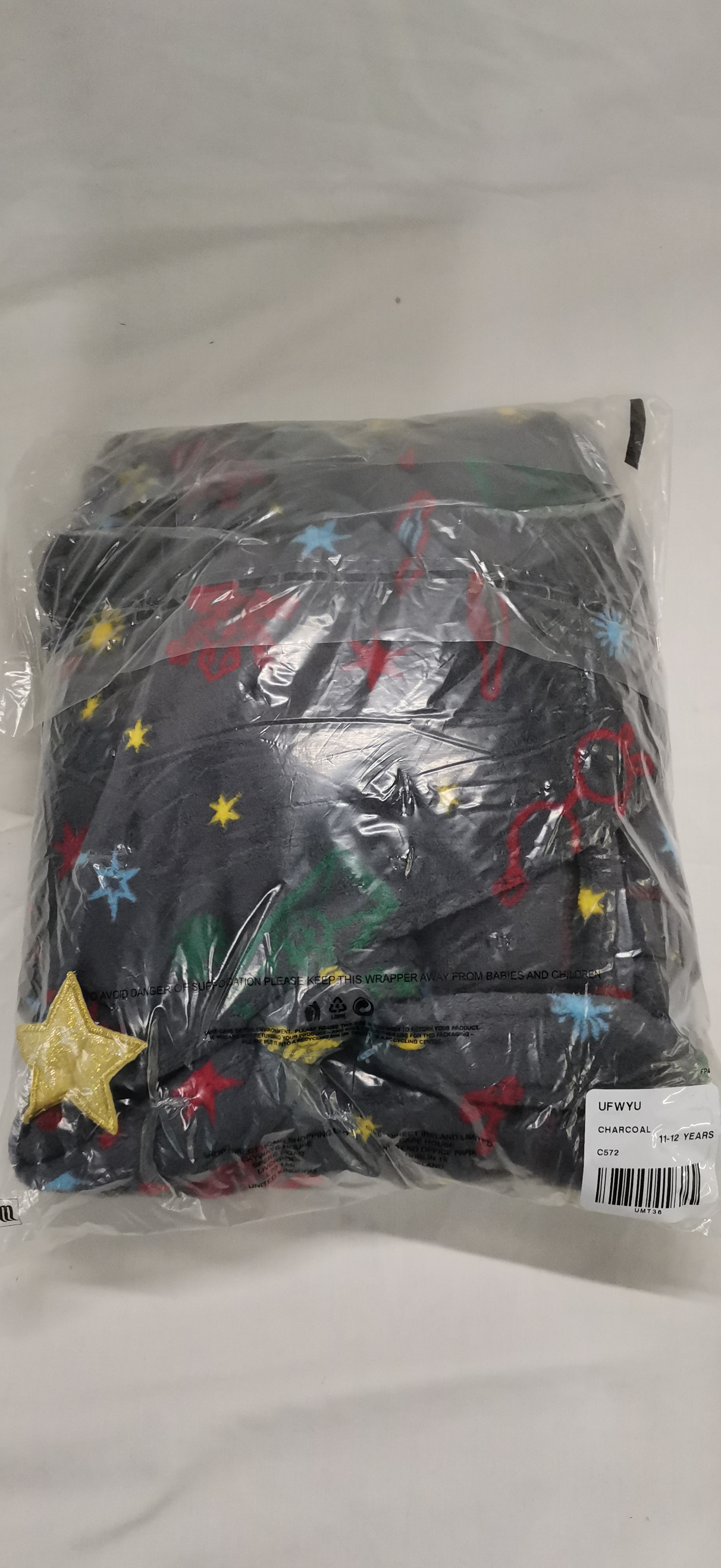 An officially licensed Wizarding World Harry Potter fleece garment, identified as a dressing gown or hooded robe. The item is constructed from charcoal grey fleece fabric featuring an all-over patterned print of various motifs including the Hogwarts H crest, the Golden Snitch, Harry Potter’s spectacles, blue lightning bolts, and multi-coloured stars. The garment features an original circular cardboard hangtag bearing the Wizarding World and Harry Potter logos. A retail label on the reverse of the packaging identifies the colour as charcoal and the size as 11-12 years, with additional references UFWYU and C572.