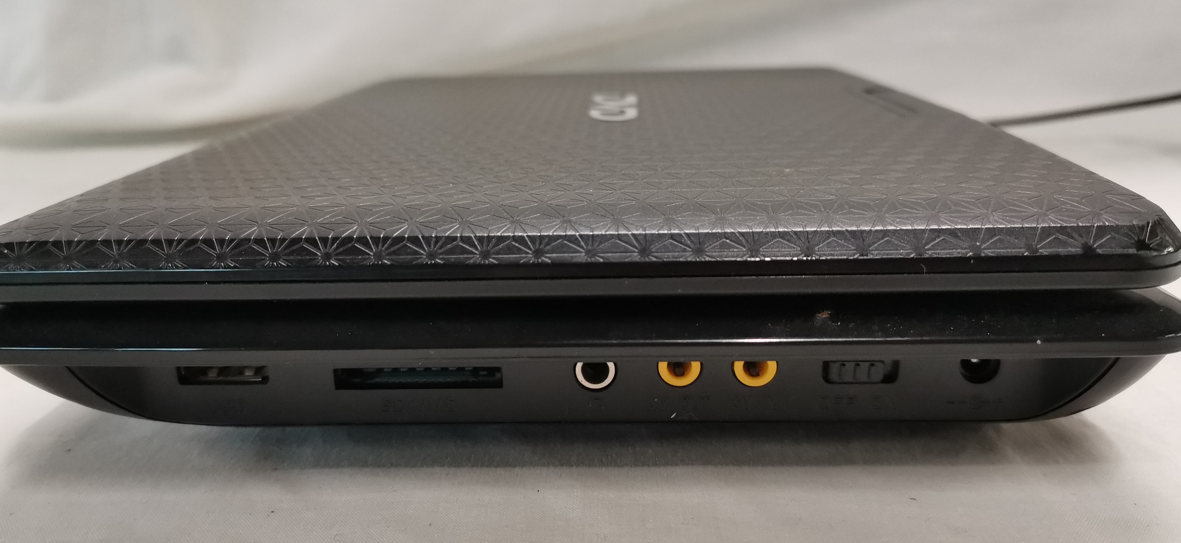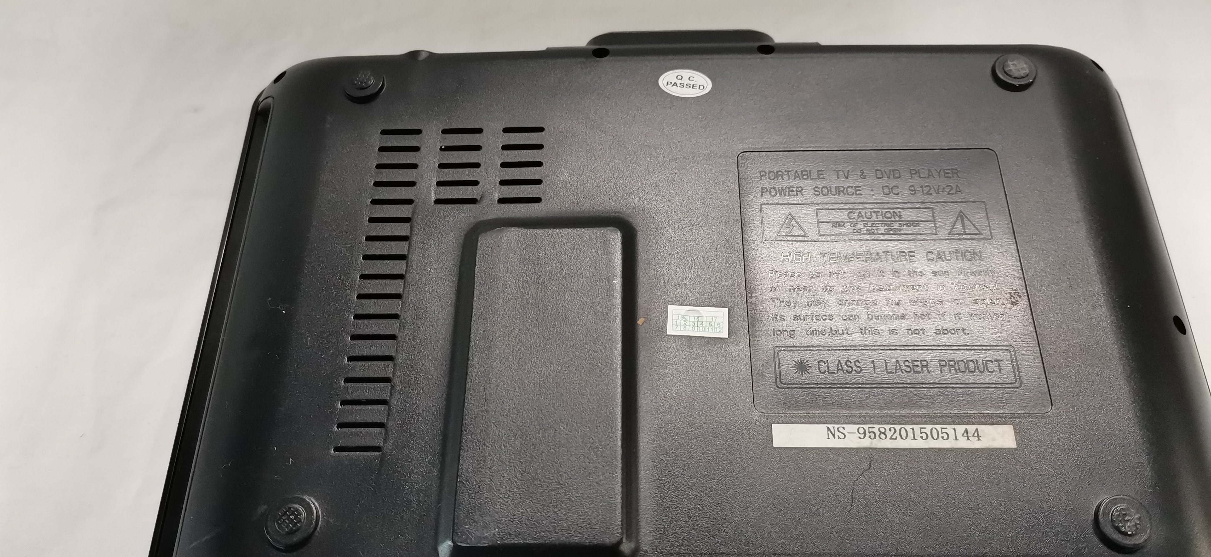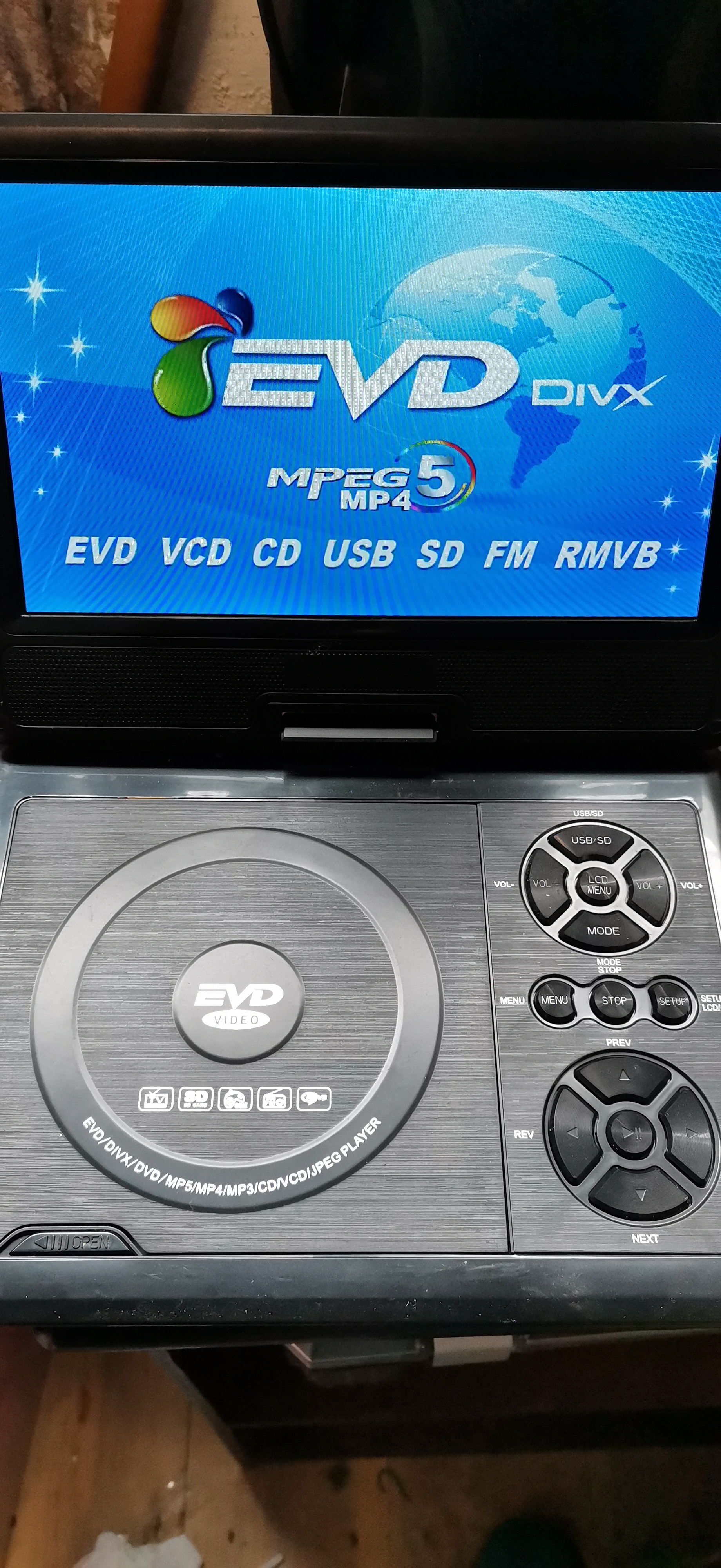 A generic portable DVD and EVD player featuring a black plastic chassis with a textured geometric-patterned lid. The unit is equipped with a swivel LCD screen and a top-loading disc compartment containing a Hitachi laser assembly. The digital interface indicates compatibility with multiple media formats including EVD, VCD, CD, DIVX, MP4, MPEG5, and RMVB. Connectivity is provided via side-mounted ports including a USB port, SD/MMC card slot, AV input, AV output, and a 3.5mm headphone jack. The base of the unit bears the serial number NS-958201505144 and specifies a power requirement of DC 9-12V/2A. The player is accompanied by a UK 3-pin mains power adapter.