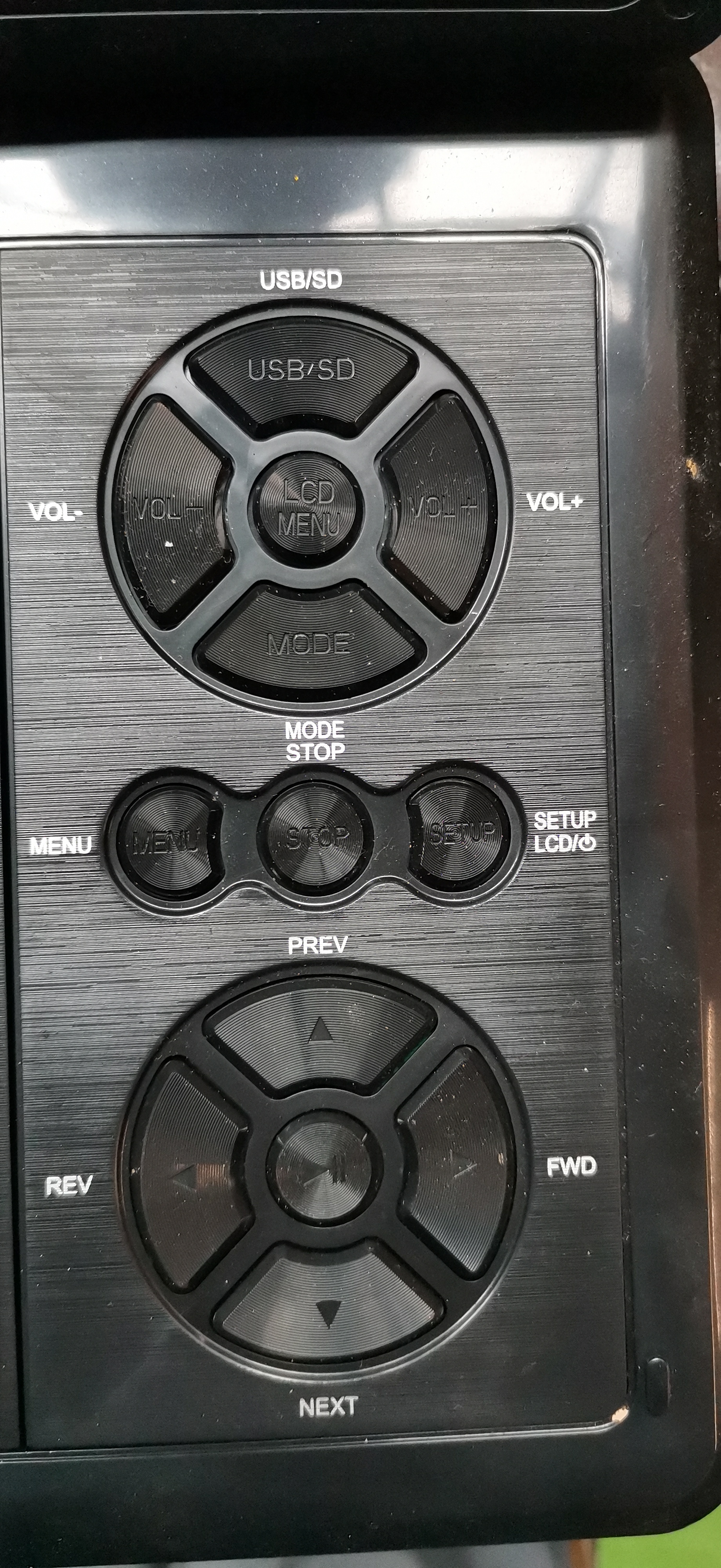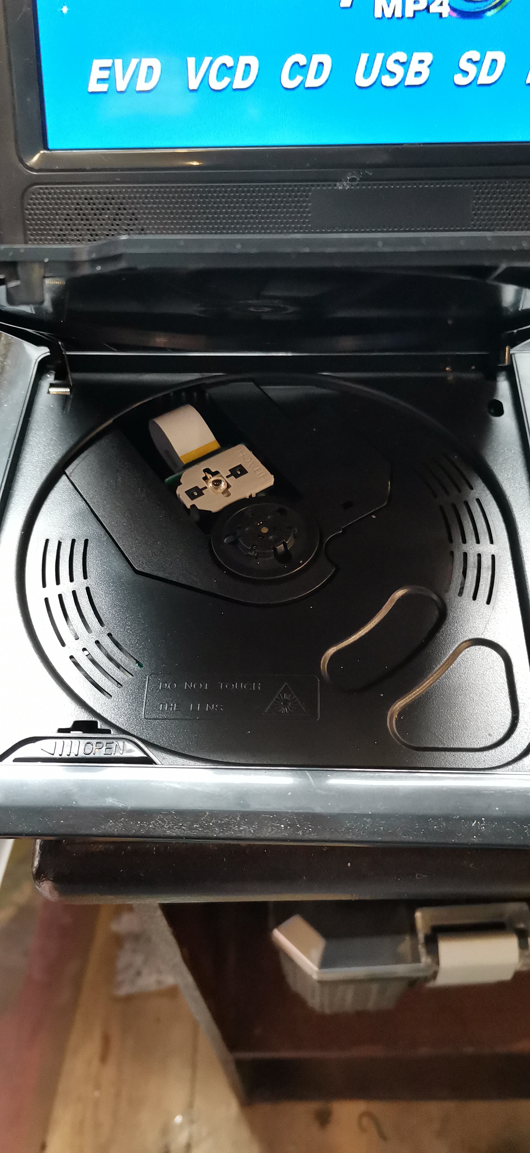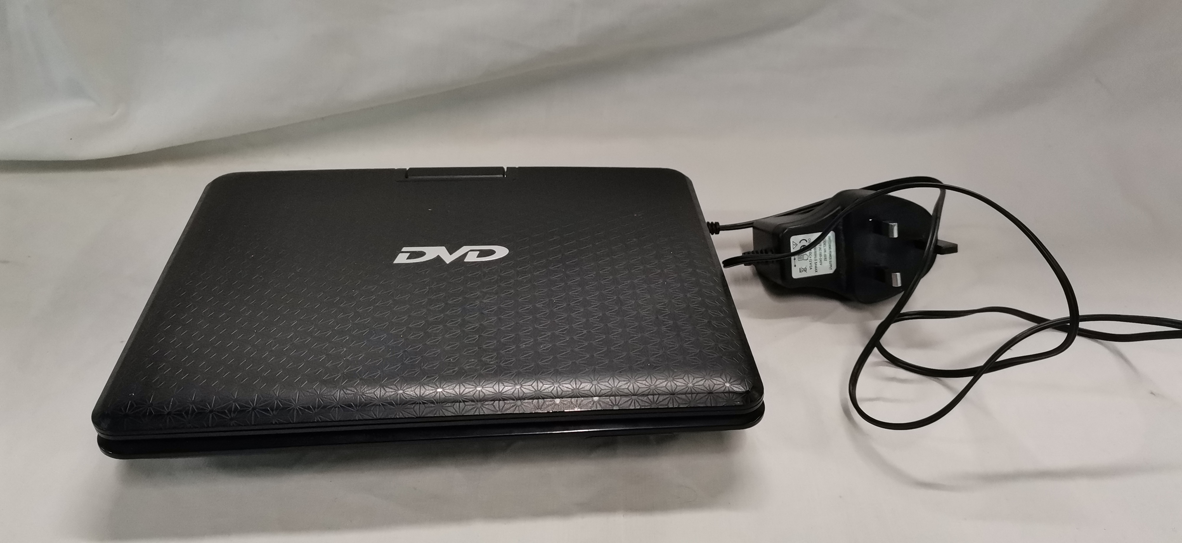 A generic portable DVD and EVD player featuring a black plastic chassis with a textured geometric-patterned lid. The unit is equipped with a swivel LCD screen and a top-loading disc compartment containing a Hitachi laser assembly. The digital interface indicates compatibility with multiple media formats including EVD, VCD, CD, DIVX, MP4, MPEG5, and RMVB. Connectivity is provided via side-mounted ports including a USB port, SD/MMC card slot, AV input, AV output, and a 3.5mm headphone jack. The base of the unit bears the serial number NS-958201505144 and specifies a power requirement of DC 9-12V/2A. The player is accompanied by a UK 3-pin mains power adapter.