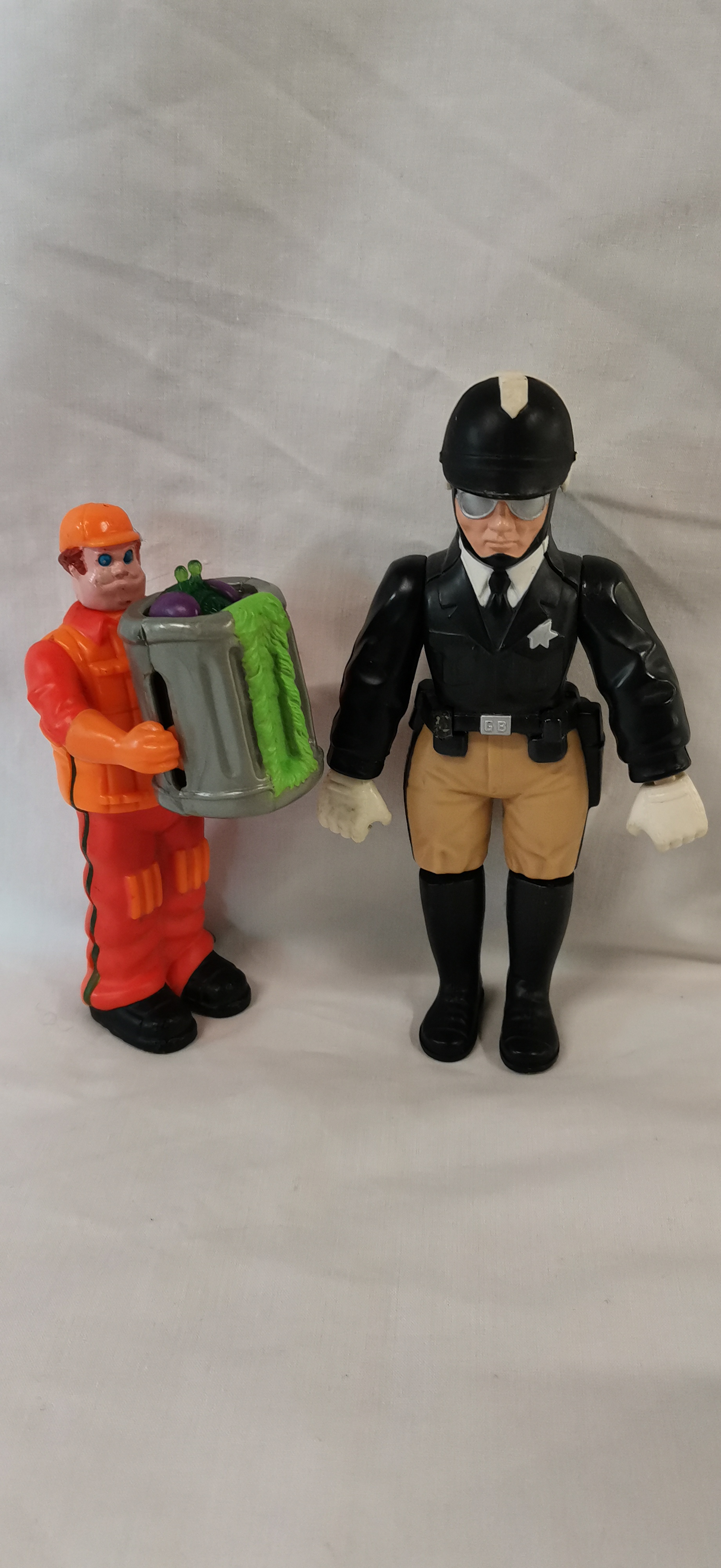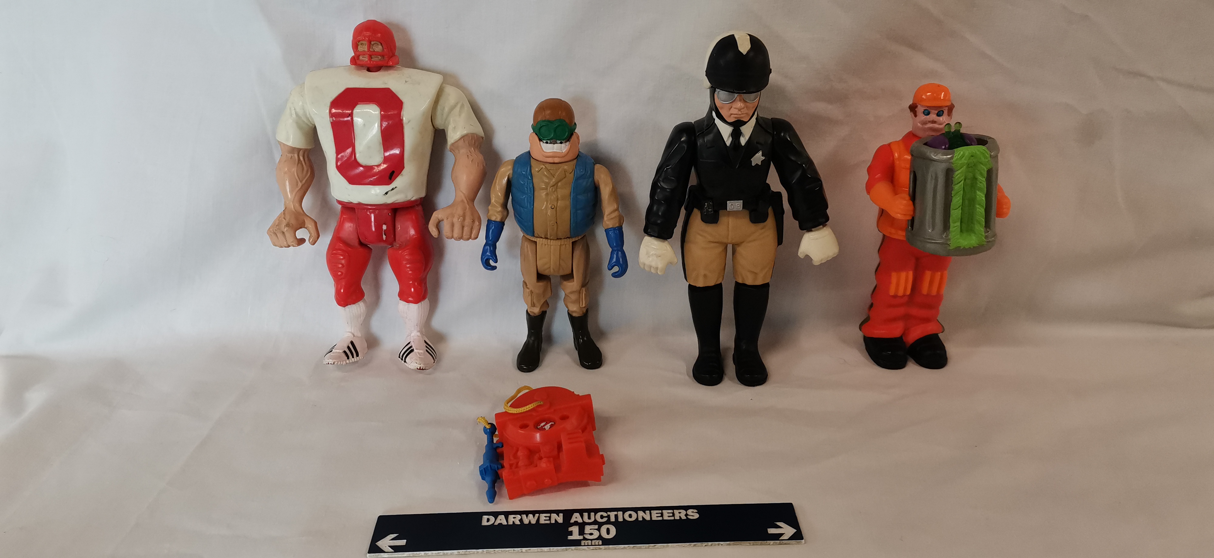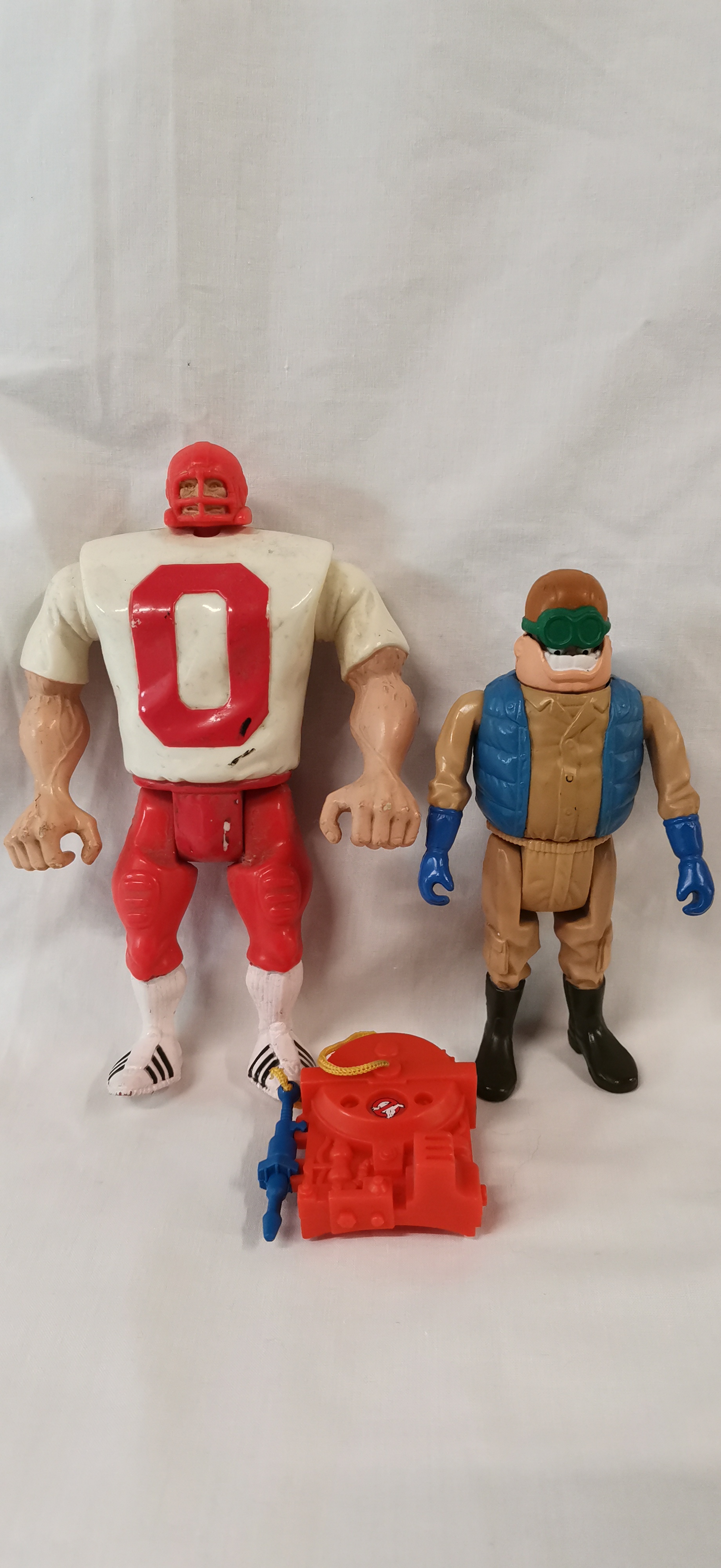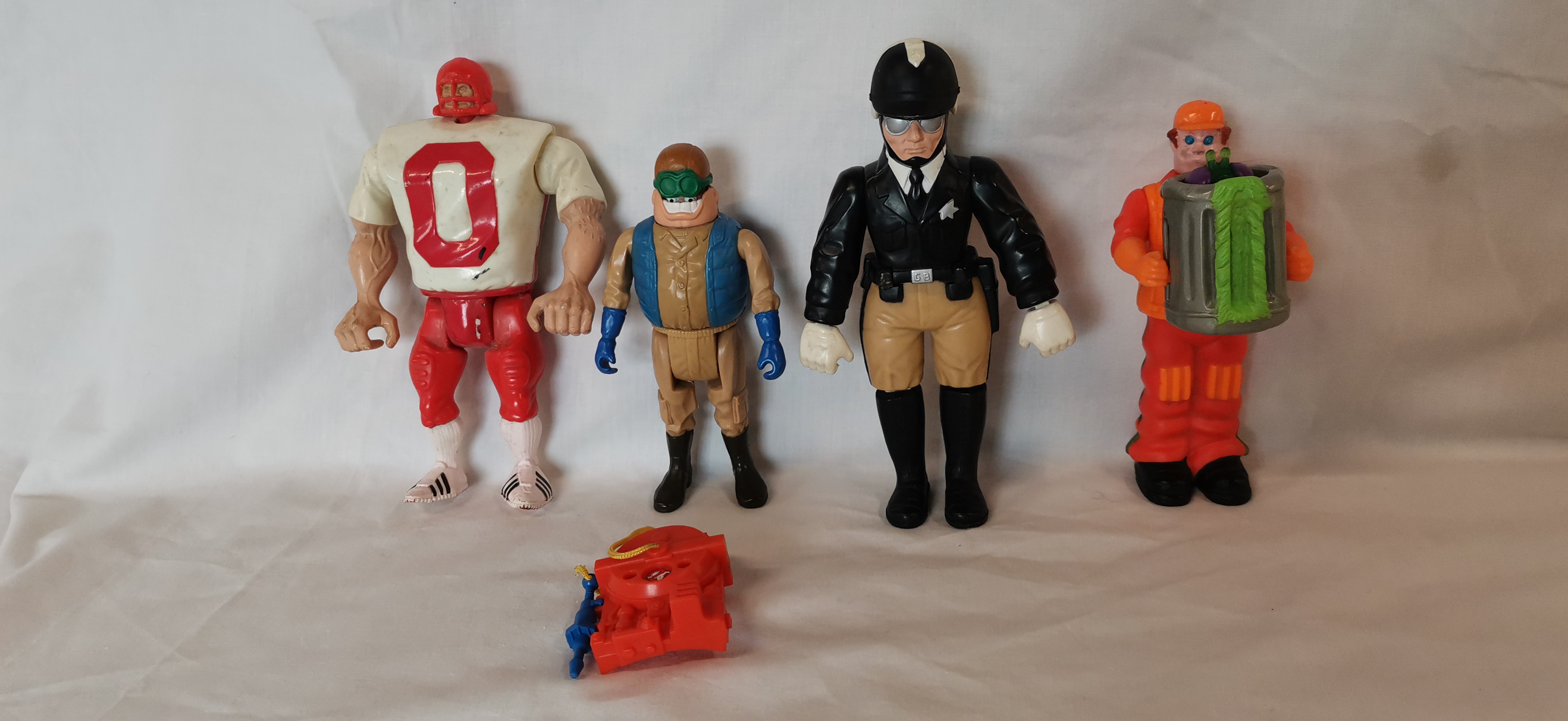 This collection features four injection-moulded plastic action figures from the Haunted Humans sub-series of The Real Ghostbusters line, manufactured by Kenner circa 1988. The figures include Tombstone Tackle, depicted as an American football player in a white jersey with a red numeral 0 and red trousers; Air-Sickness, a pilot in a tan flight suit with a blue quilted vest and green goggles; Highway Haunter, a motorcycle police officer in a black jacket and tan breeches with a silver-tone star badge and a belt buckle embossed with the letters GB; and Terror Trash, a sanitation worker in orange overalls holding a grey rubbish bin containing sculpted green and purple debris. Each figure is designed with an internal mechanism to transform into a ghostly or monstrous appearance. The lot also includes a red plastic proton pack accessory with a yellow cord and blue blaster component, bearing the No Ghosts logo on a white circular sticker.