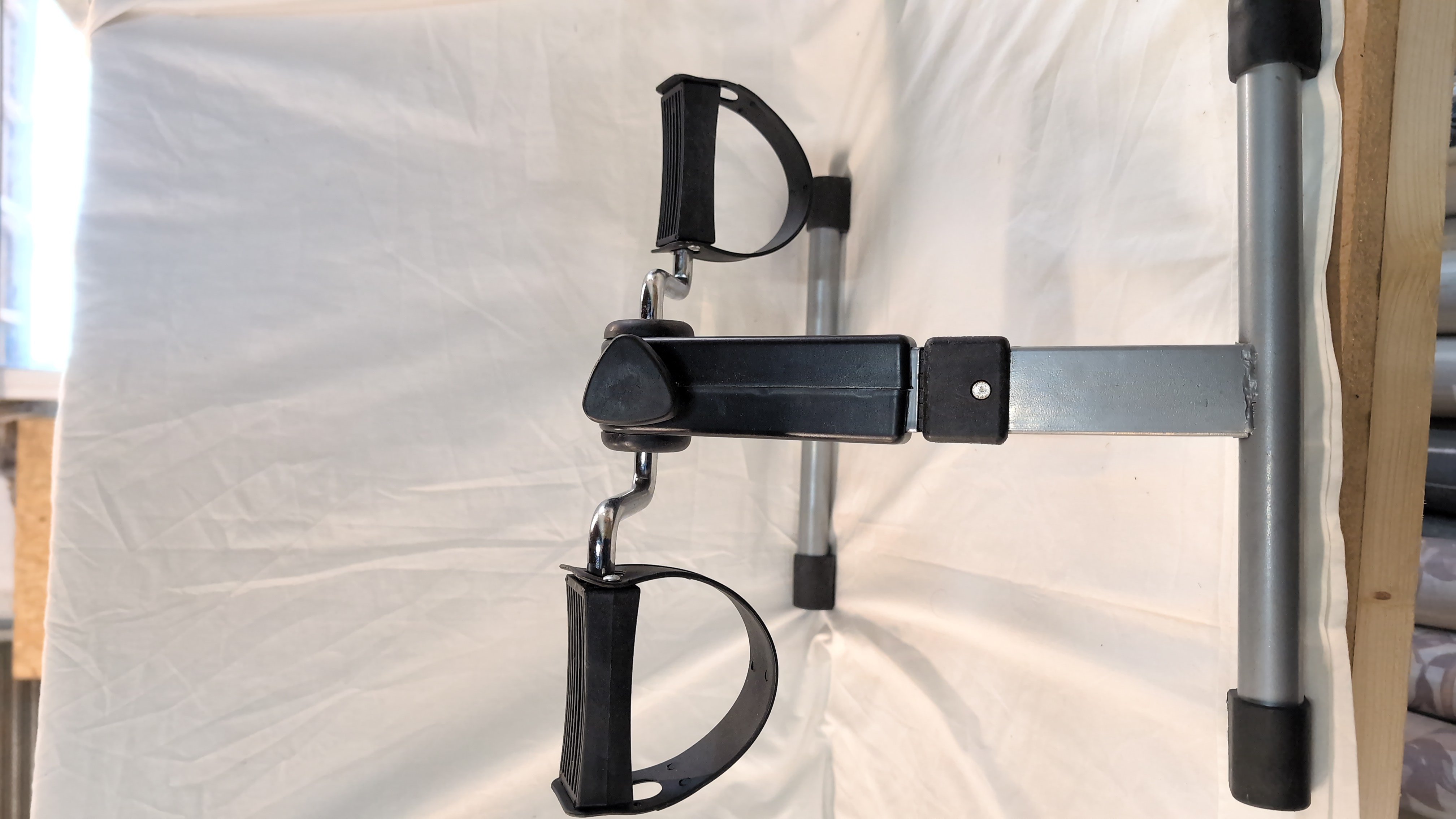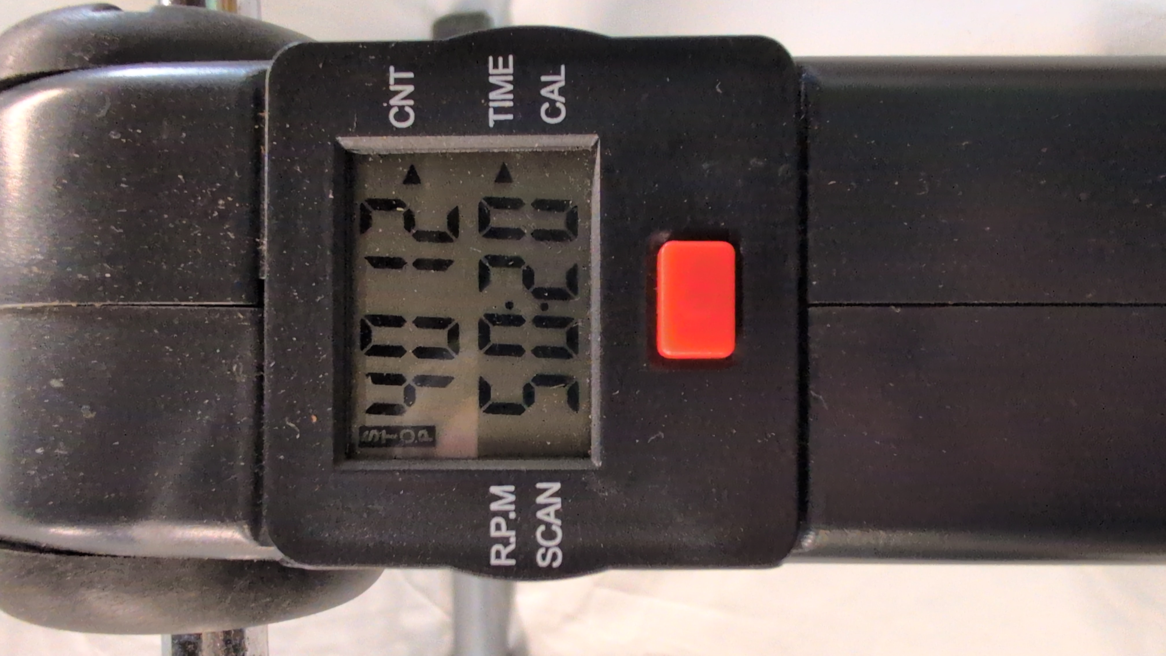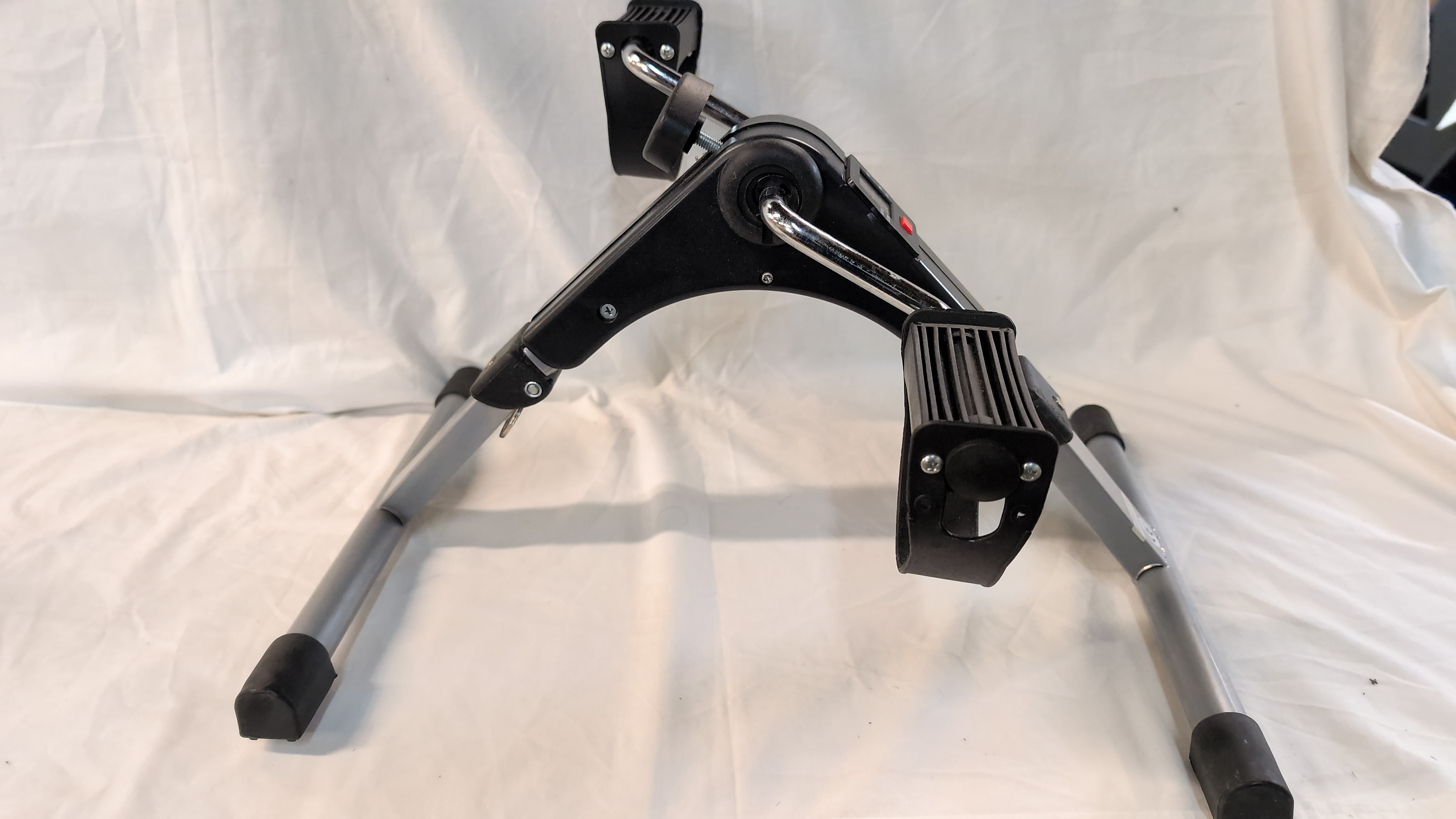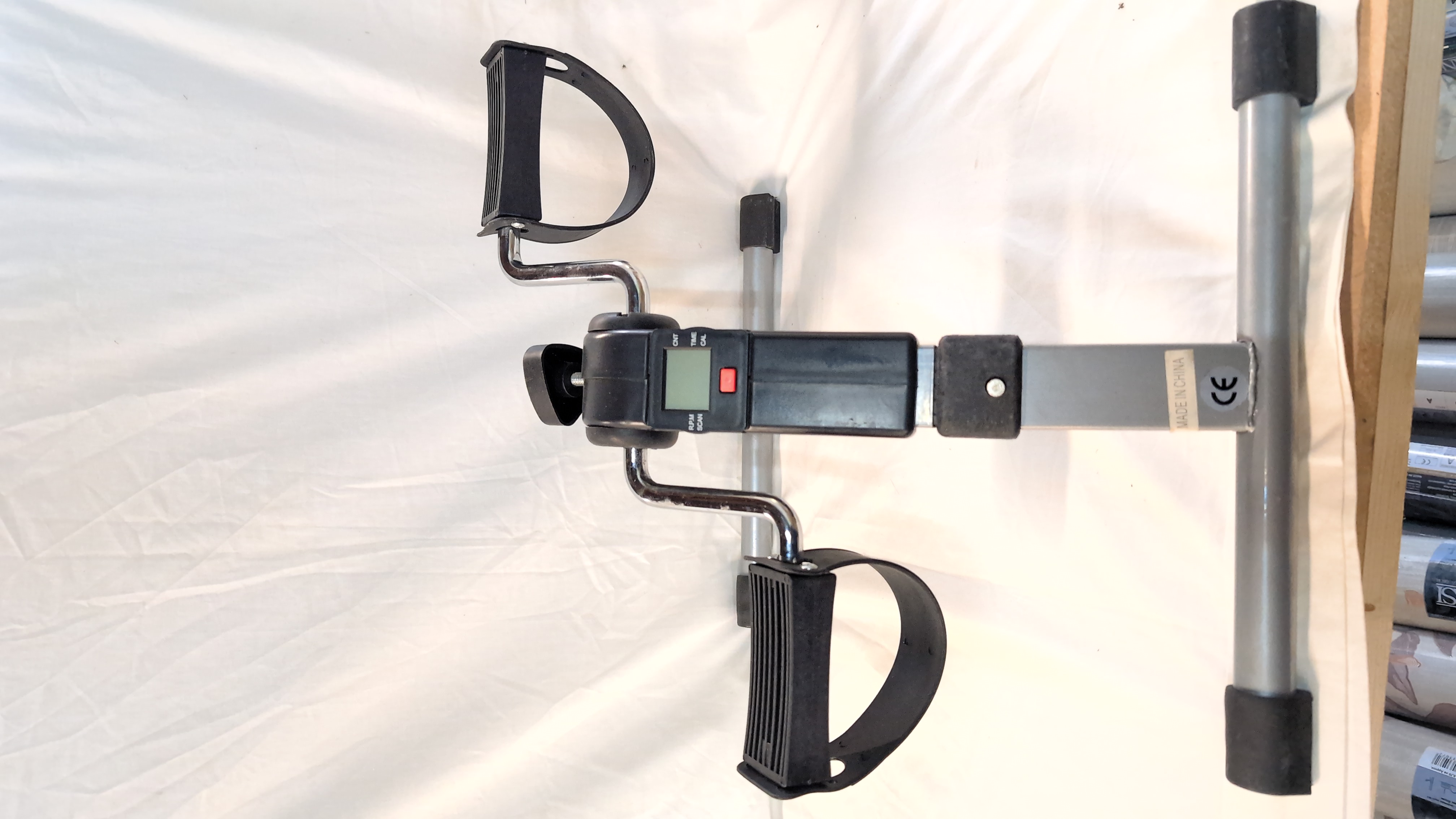 A portable folding pedal exerciser designed for seated aerobic exercise. The unit is constructed with a grey tubular metal frame and features a central black plastic housing. It is equipped with chrome-finished pedal cranks and adjustable black plastic foot straps. The device includes an integrated digital LCD monitor that displays metrics for count, time, calories, and revolutions per minute, operated via a single red button. A triangular manual tension adjustment knob is located on the main body to vary resistance. The frame is fitted with black rubberised feet. A Made in China label and a CE mark are present on the rear frame. No manufacturer branding is visible on the unit.