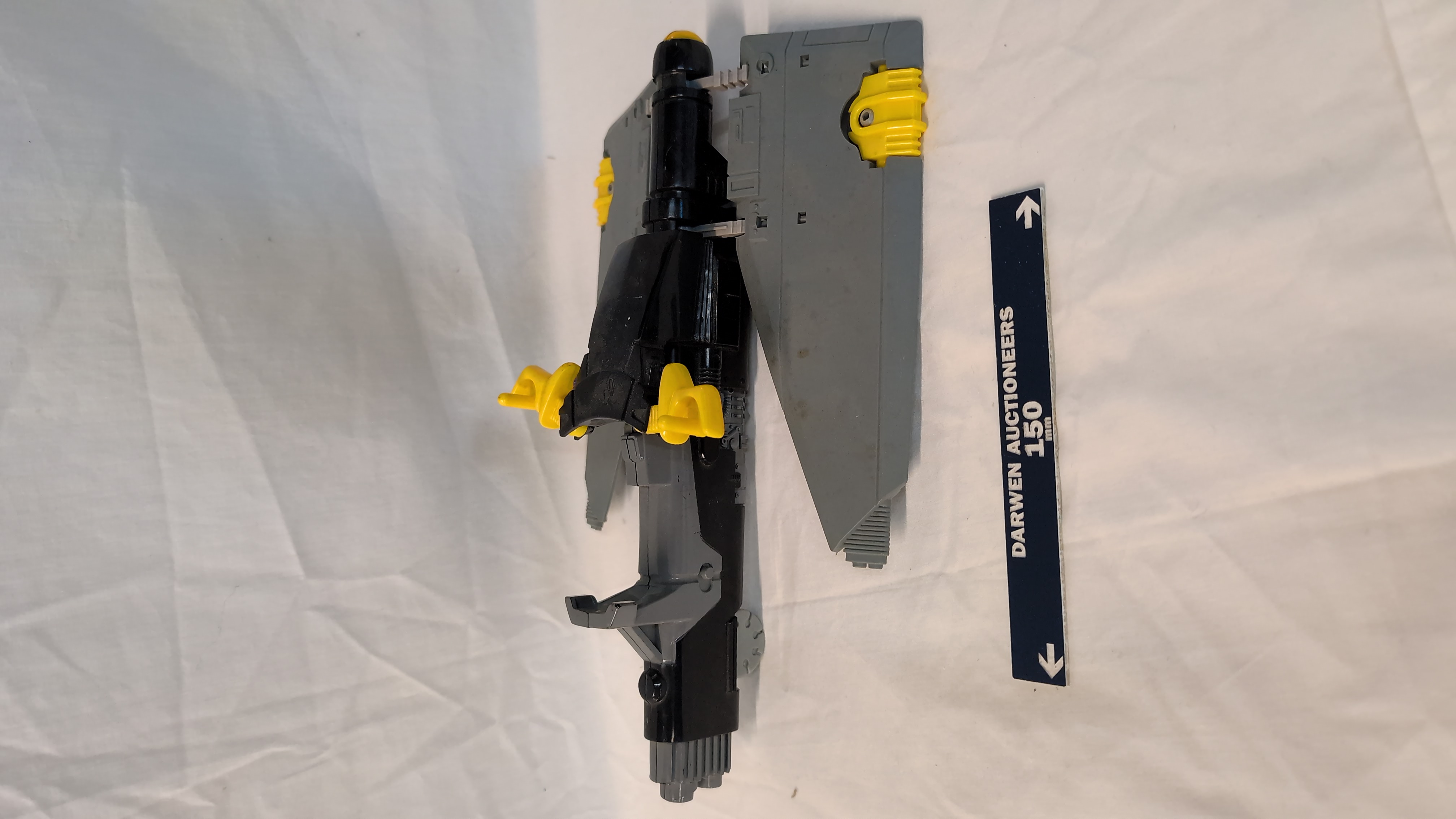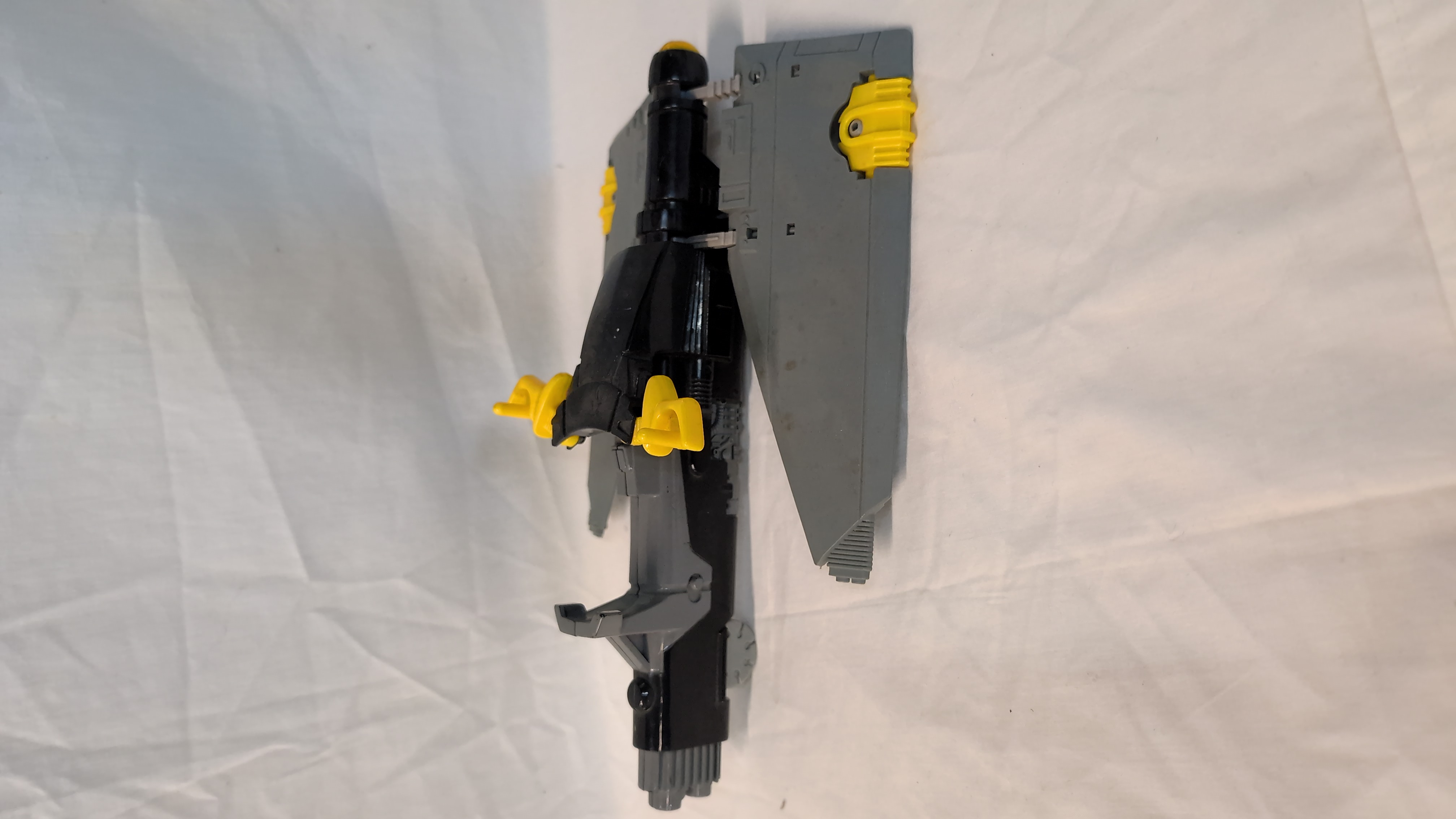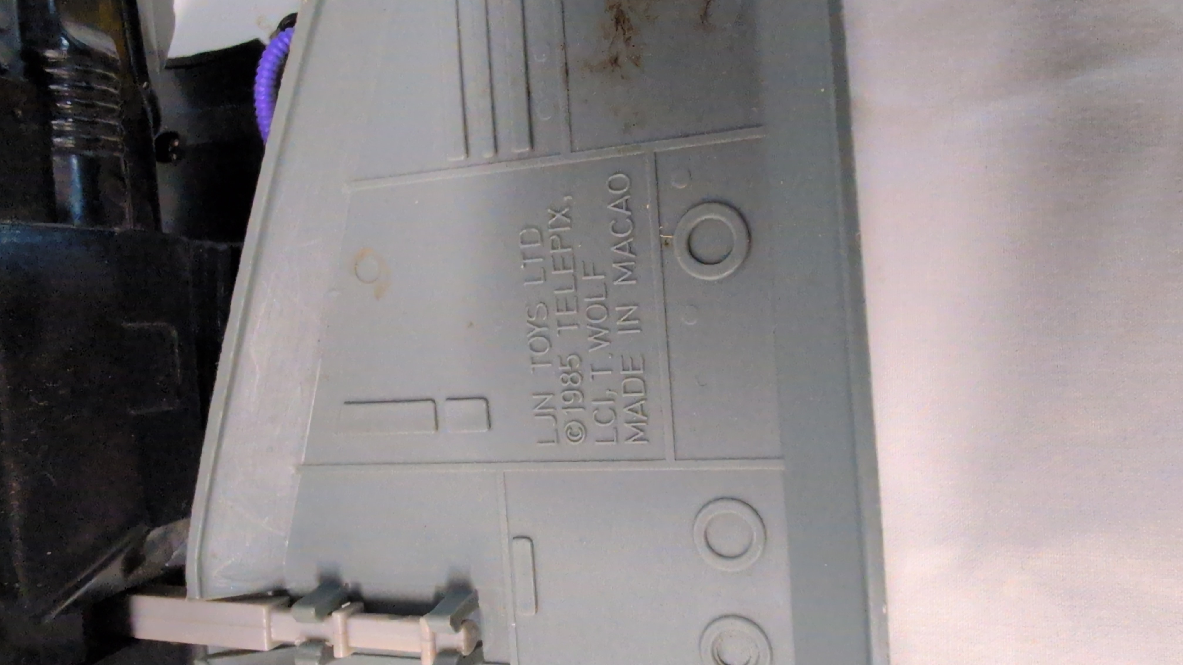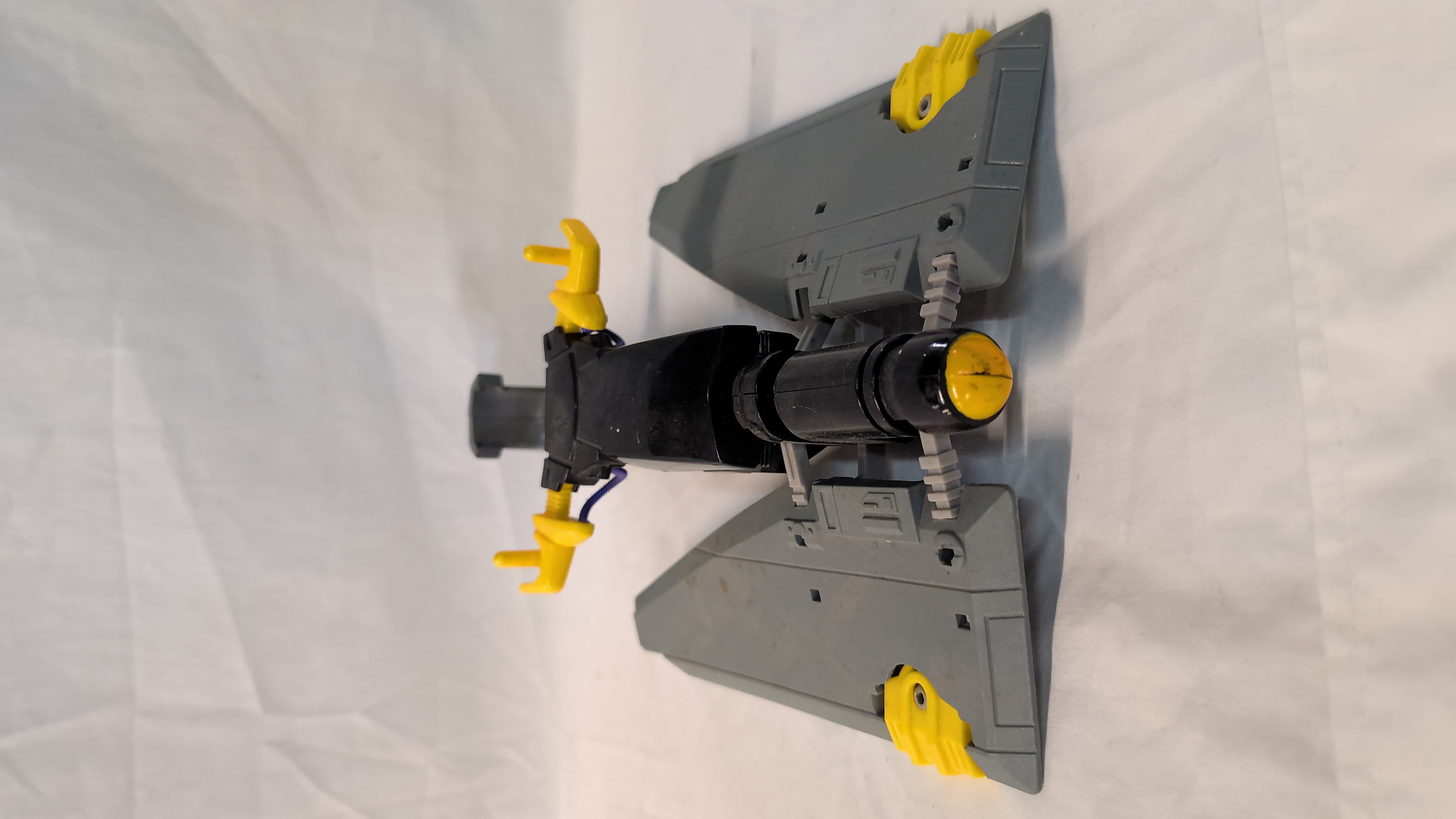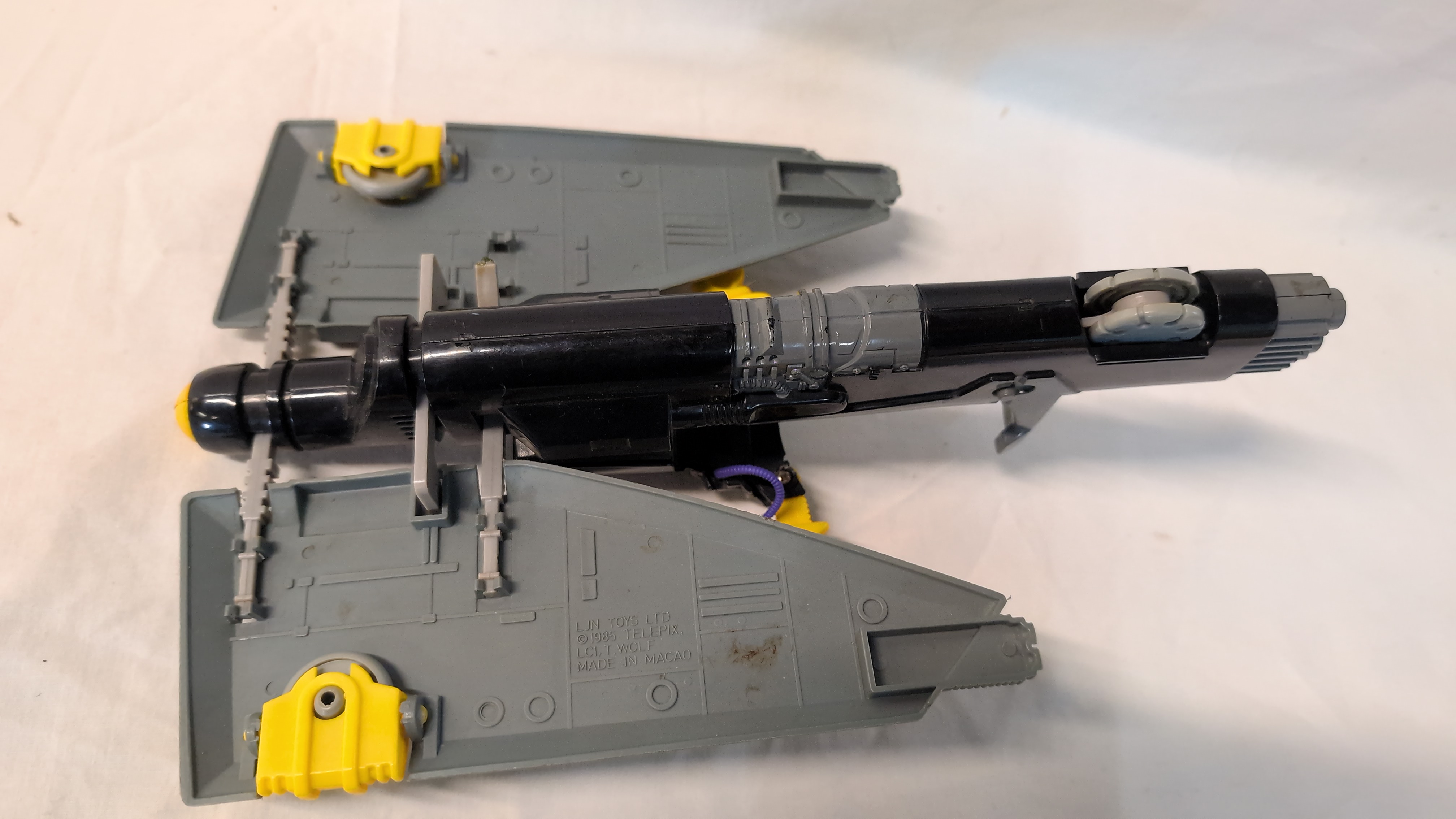 A vintage Mutant Skycutter action figure vehicle manufactured by LJN Toys Ltd for the Thundercats franchise. The item is constructed from moulded plastic in a colour palette of black, grey, and yellow. It features a mechanical design with folding wings and small integrated wheels on the underside to facilitate rolling. The underside of one wing bears the moulded marks: LJN TOYS LTD, © 1985 TELEPIX, LCI, T. WOLF, MADE IN MACAO. A single purple flexible plastic tube is attached to the side of the fuselage.