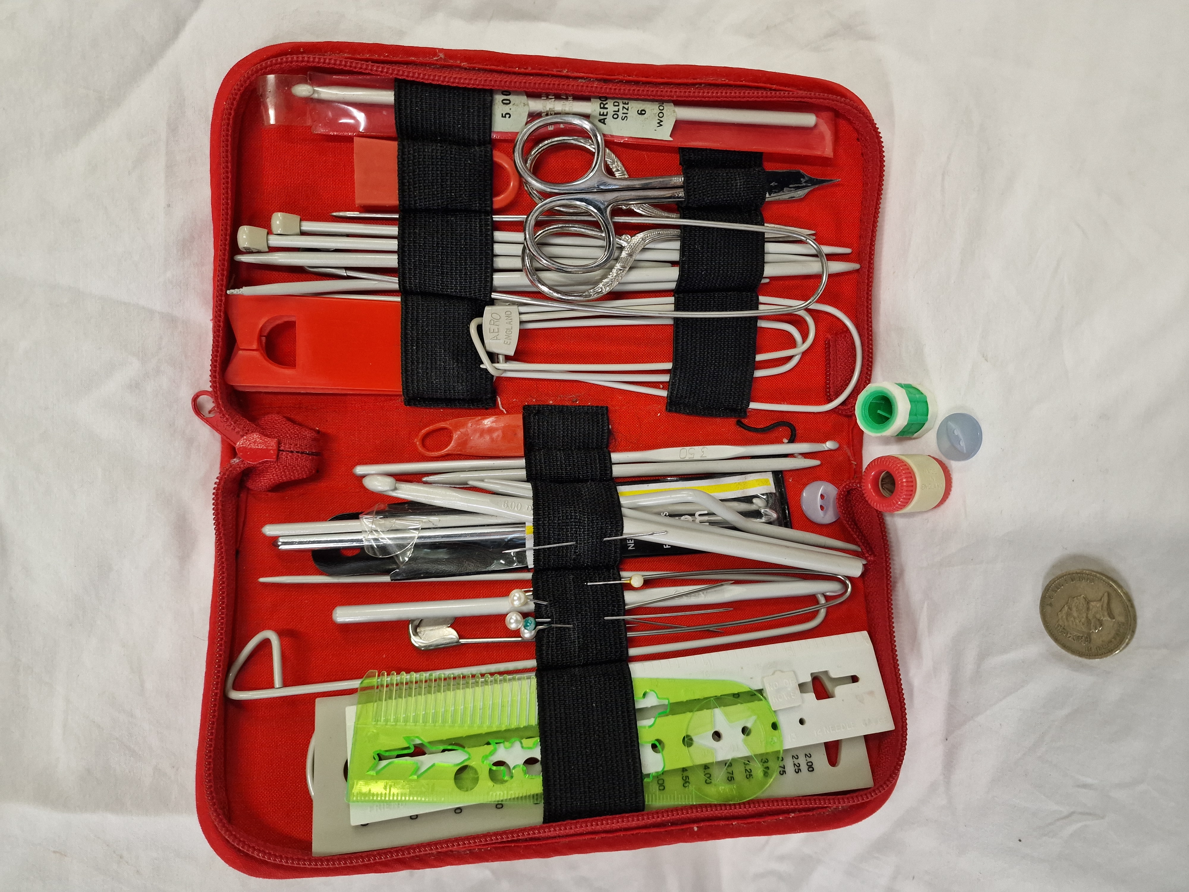A comprehensive collection of vintage knitting and crochet tools and accessories housed in a red fabric zippered case with internal black elasticated organisers. The set includes an assortment of aluminium and steel knitting needles and crochet hooks in various gauges. One crochet hook is contained within a plastic sleeve with an Aero paper insert. The kit features several metal stitch holders, including one with a metal identification tag. Measuring tools include two plastic needle gauge cards in white and grey, and a green translucent plastic multi-tool ruler with various cut-out shapes. Additional notions comprise two cylindrical plastic stitch counters in red/white and green/white, a pair of embroidery scissors with ornate foliate-style handles, pearl-headed pins, a large safety pin, and spare buttons. Visible markings include a metal tag stamped Aero England, a paper tag marked Aero Old Size 6 Wool, and a green stitch counter embossed Made in England. The plastic needle gauges are marked The Needle Gauge and No of Rows with various metric sizes.