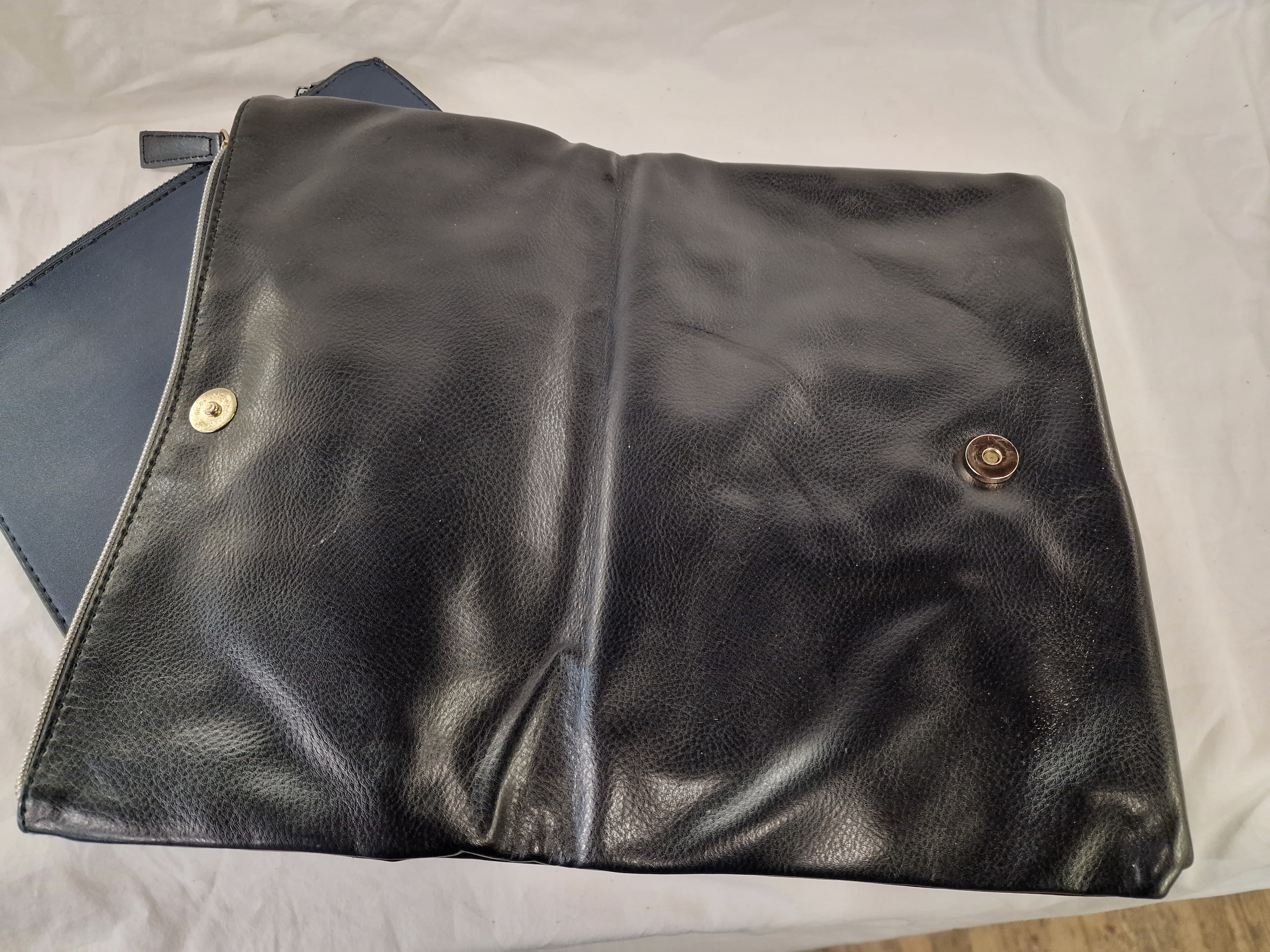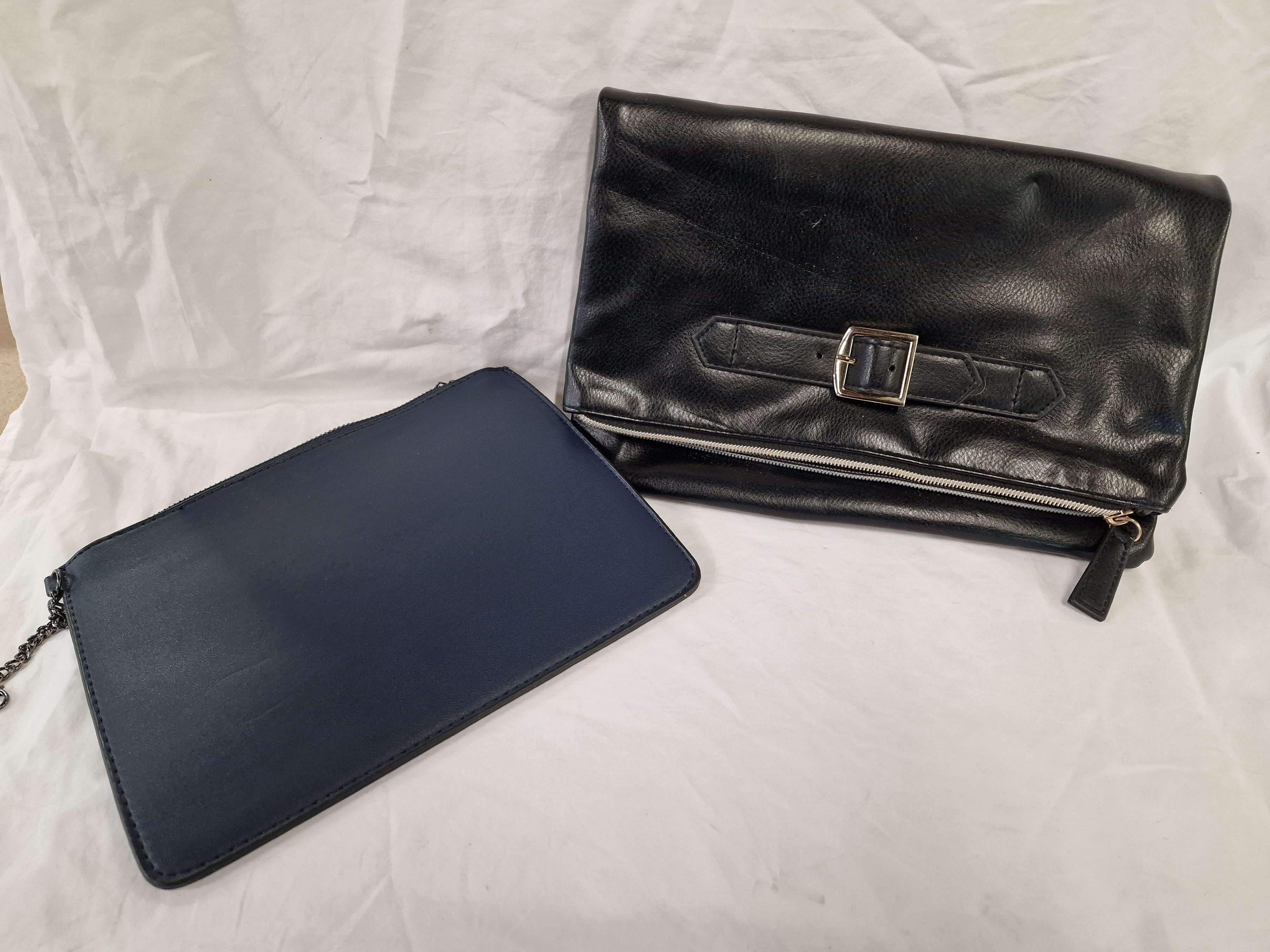 This lot comprises two assorted clutch bags. The first is a large, soft-bodied fold-over clutch constructed from black textured leather. It features a central decorative strap with a silver-tone metal buckle, a design attributed to the Staud Cuff model. The bag is fitted with a silver-tone external zip and two gold-tone magnetic snap closures on the interior. The second item is a slim, rectangular zip-top pouch in a navy blue matte synthetic material. It features gunmetal-tone hardware and a partial chain-link strap attached to a side D-ring.